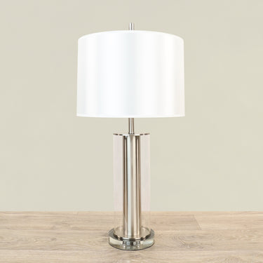 A clear glass surround gives this Metal Table Lamp sparkle to add a luxe touch to a living room or bedroom. Topped by a classic white drum shade this column table lamp offers elegant style and beautiful illumination to lend instant flair to a space. se.