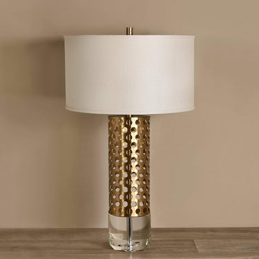 Convey a hint of elegant mid-century modern style to a table or desk with this captivating Metal Lamp. Its bronze cutout detailing, crystal base, and white drum shade perfectly harmonize with a variety of decor styles to add wonderful illumination to your space.