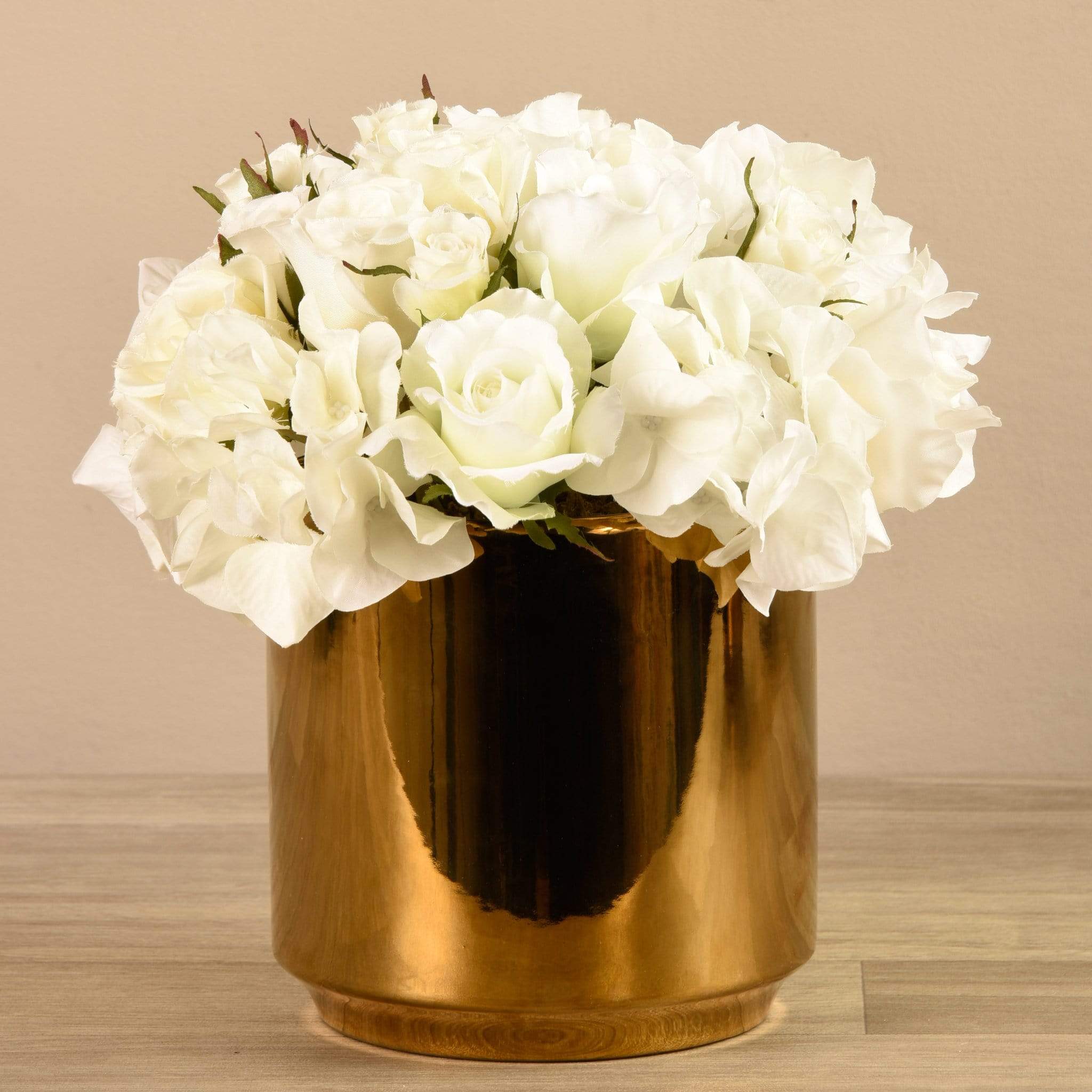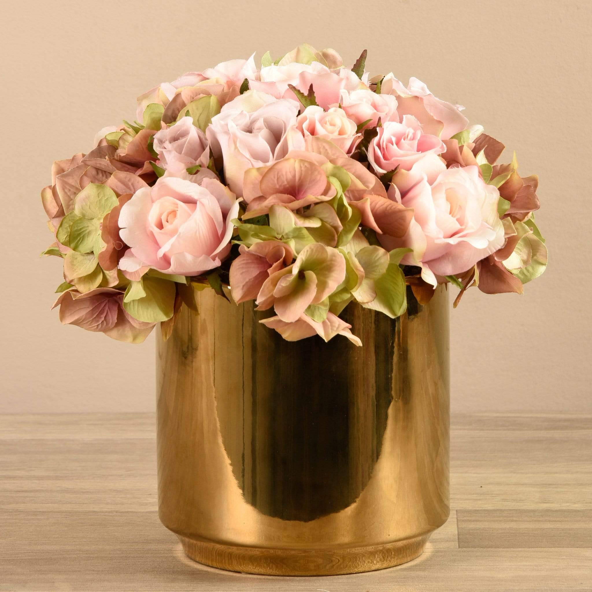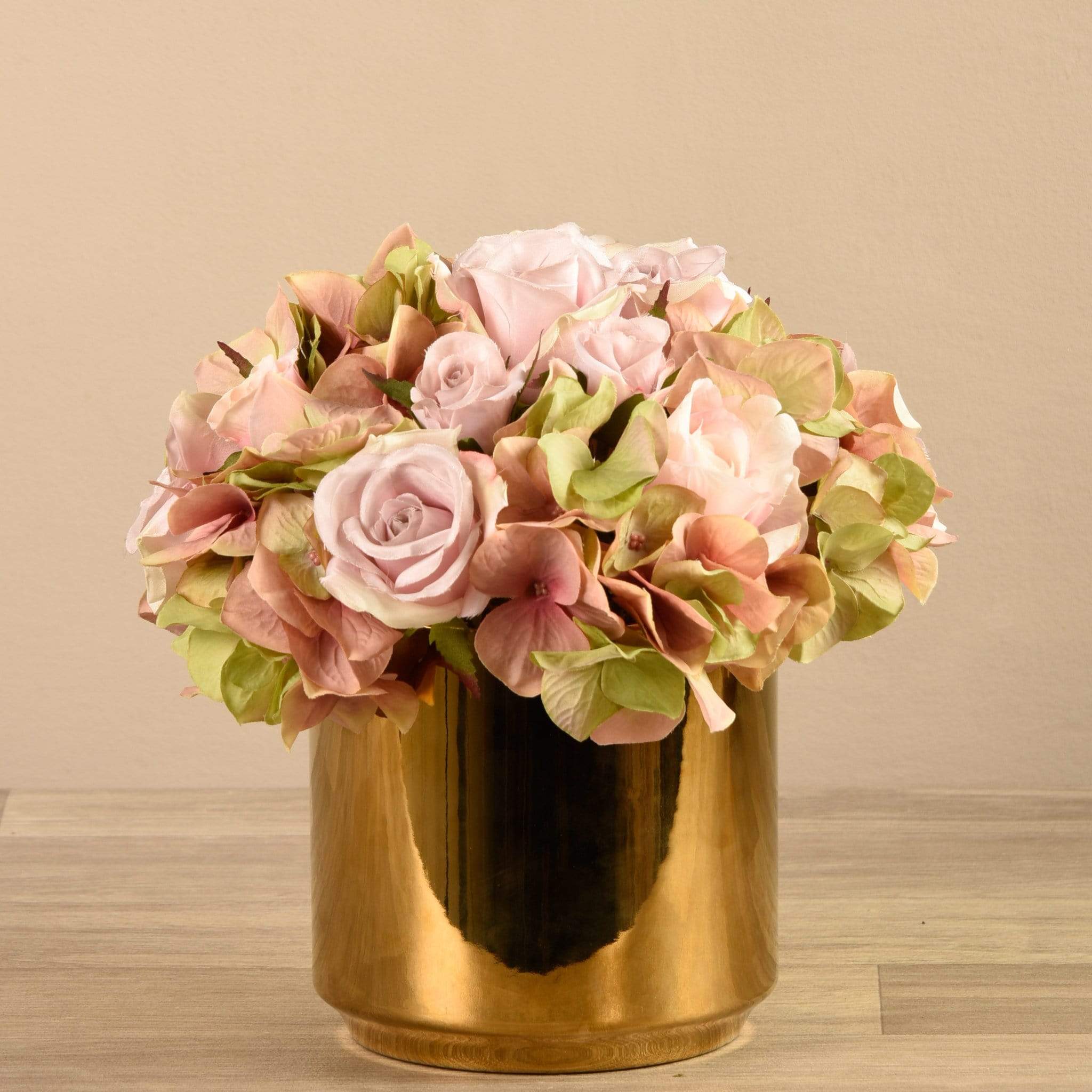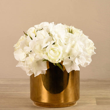 Nothing's more timeless and elegant than soft florals. Hand-arranged by expert florists, these pretty mixed florals feature delicate artificial roses and sweet peas. Their metallic gold pot complements them beautifully.