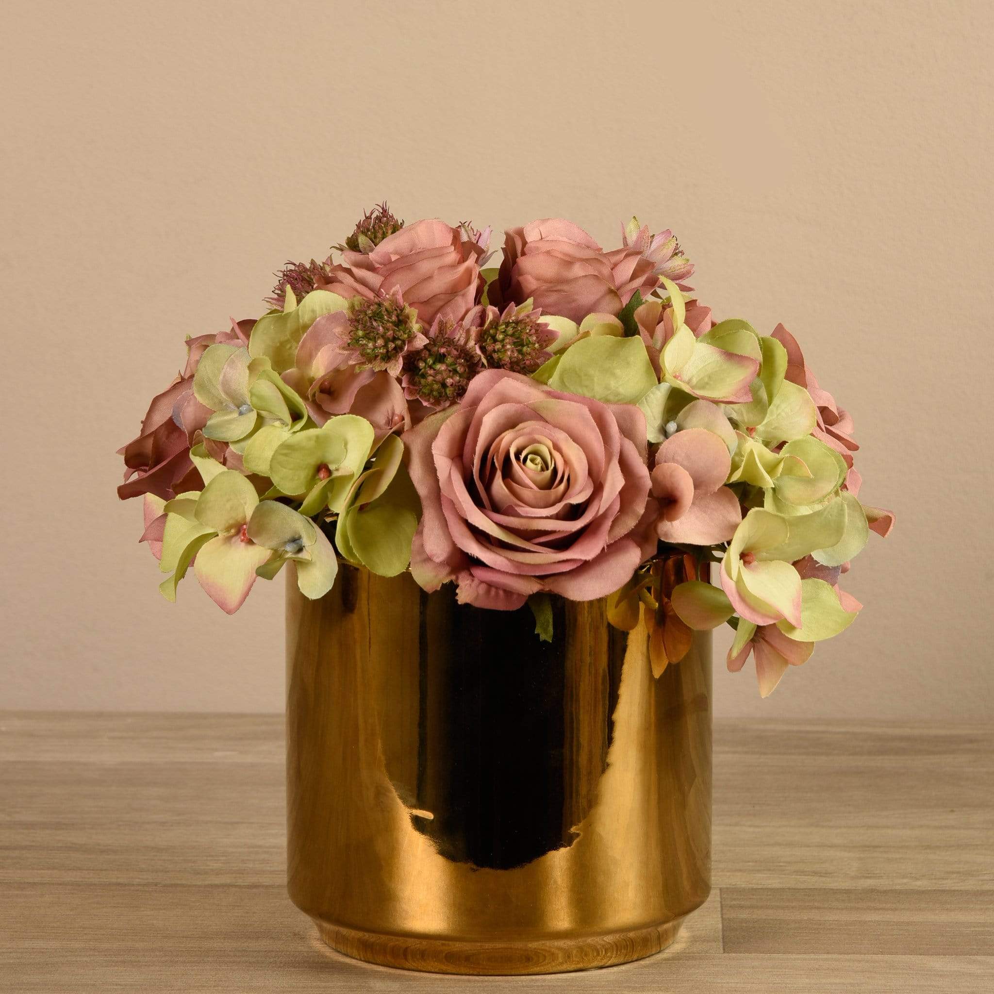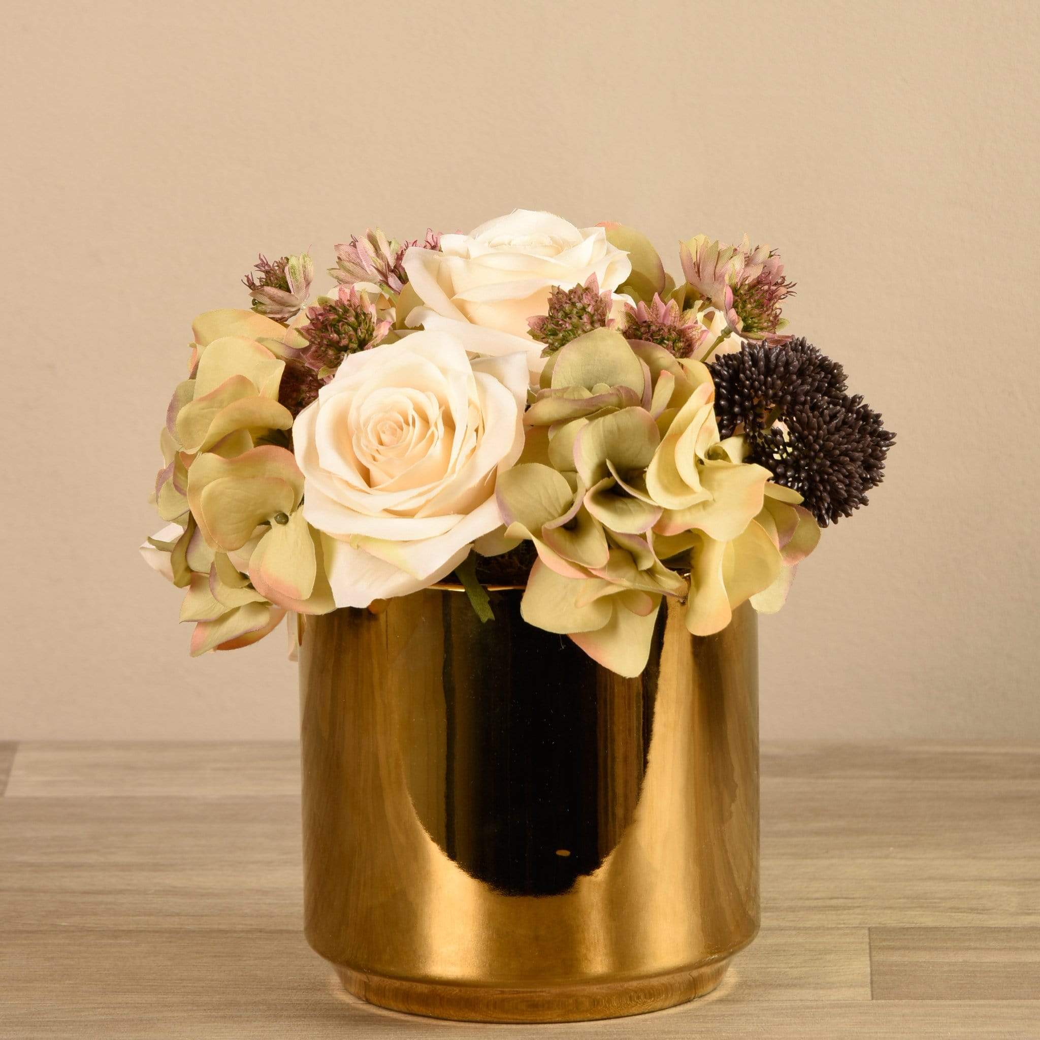 Soft, yet bold. This pretty floral arrangement pairs dainty faux roses with artificial sweet peas and dark-colored foliage. Its metallic gold pot goes beautifully with the flowers' color scheme.