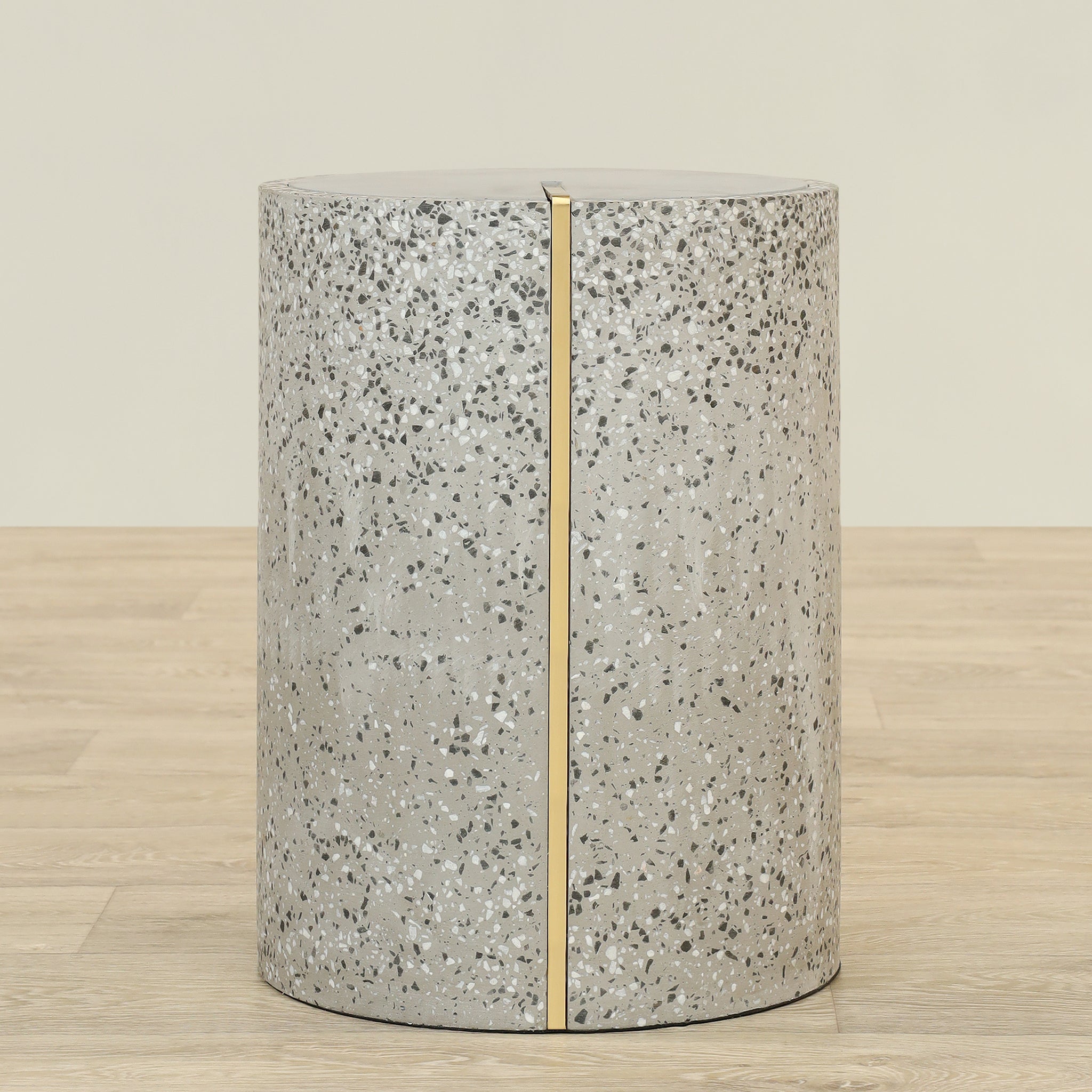 The austere attitude of the Monte side table is perfectly offset by a gleaming metal band that intersects the top and runs down one side. Crafted in gorgeous natural travertine and cement this solid table is a wonderful choice for a contemporary or transitional aesthetic.