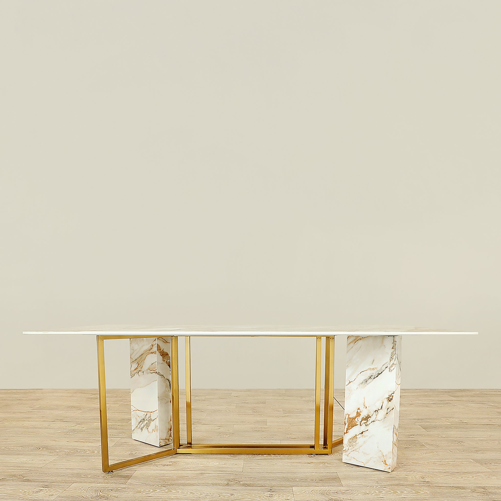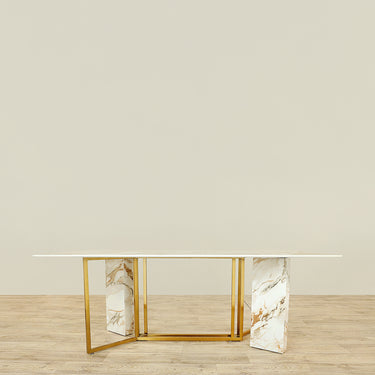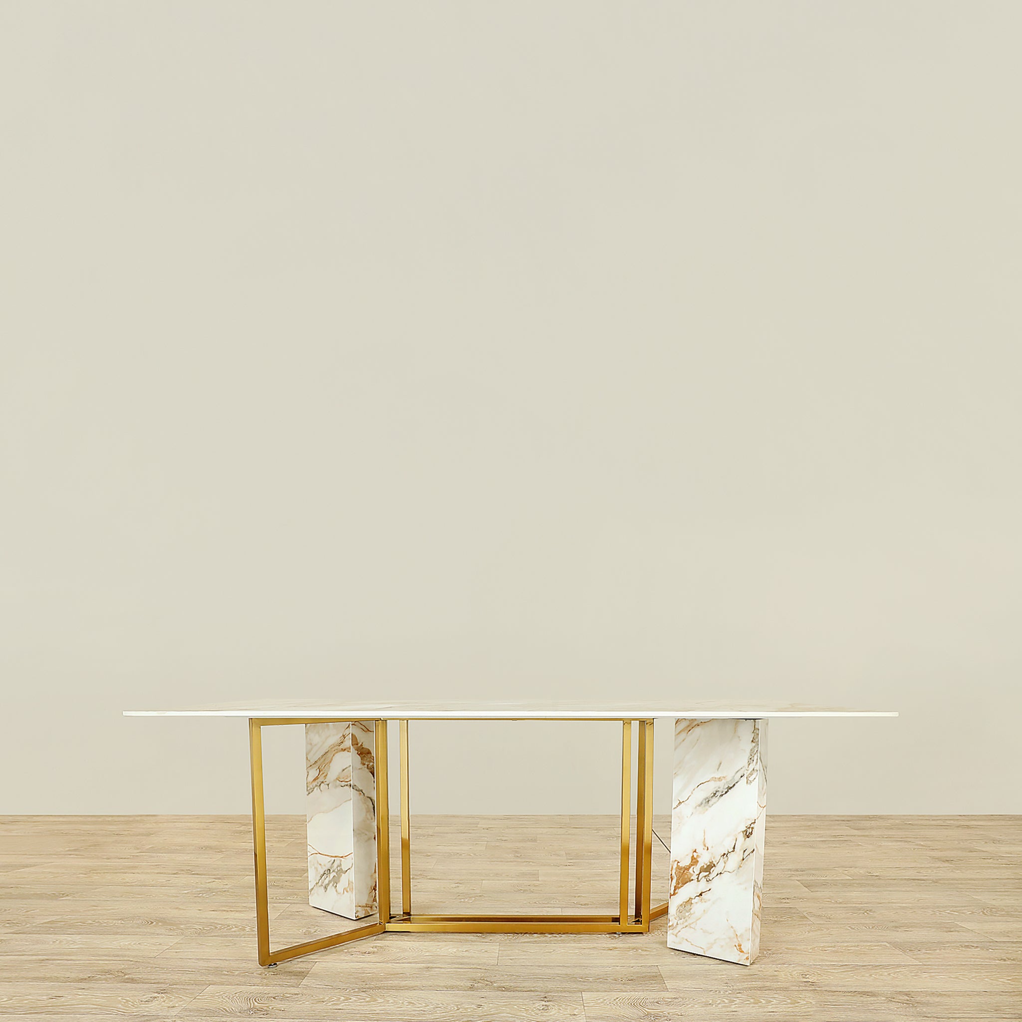 The Naava dining table is endowed with a stunning mix of materials. Slim chrome gold stainless steel legs are paired with white marble legs to support a rectangular marble top with beautifully rounded corners.