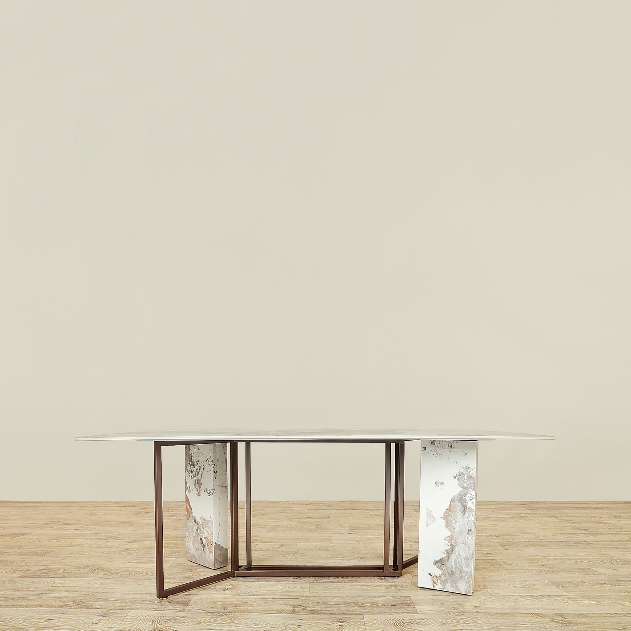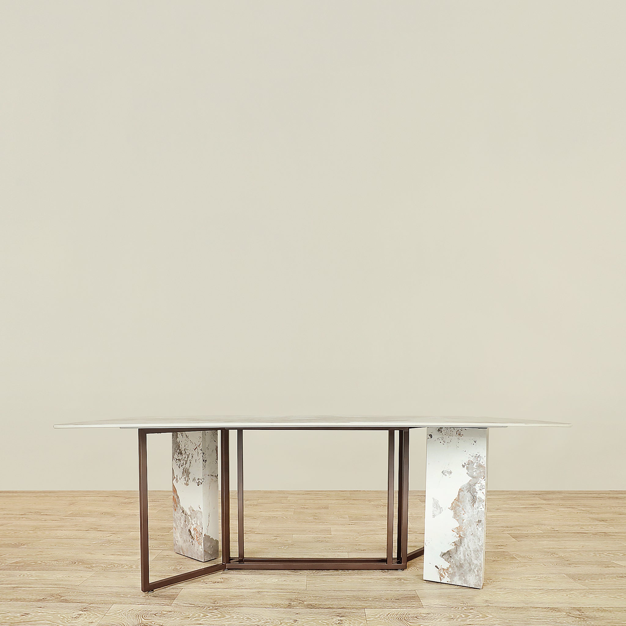 The Naava dining table is endowed with a stunning mix of materials. Slim chrome gold stainless steel legs are paired with white marble legs to support a rectangular marble top with beautifully rounded corners.
