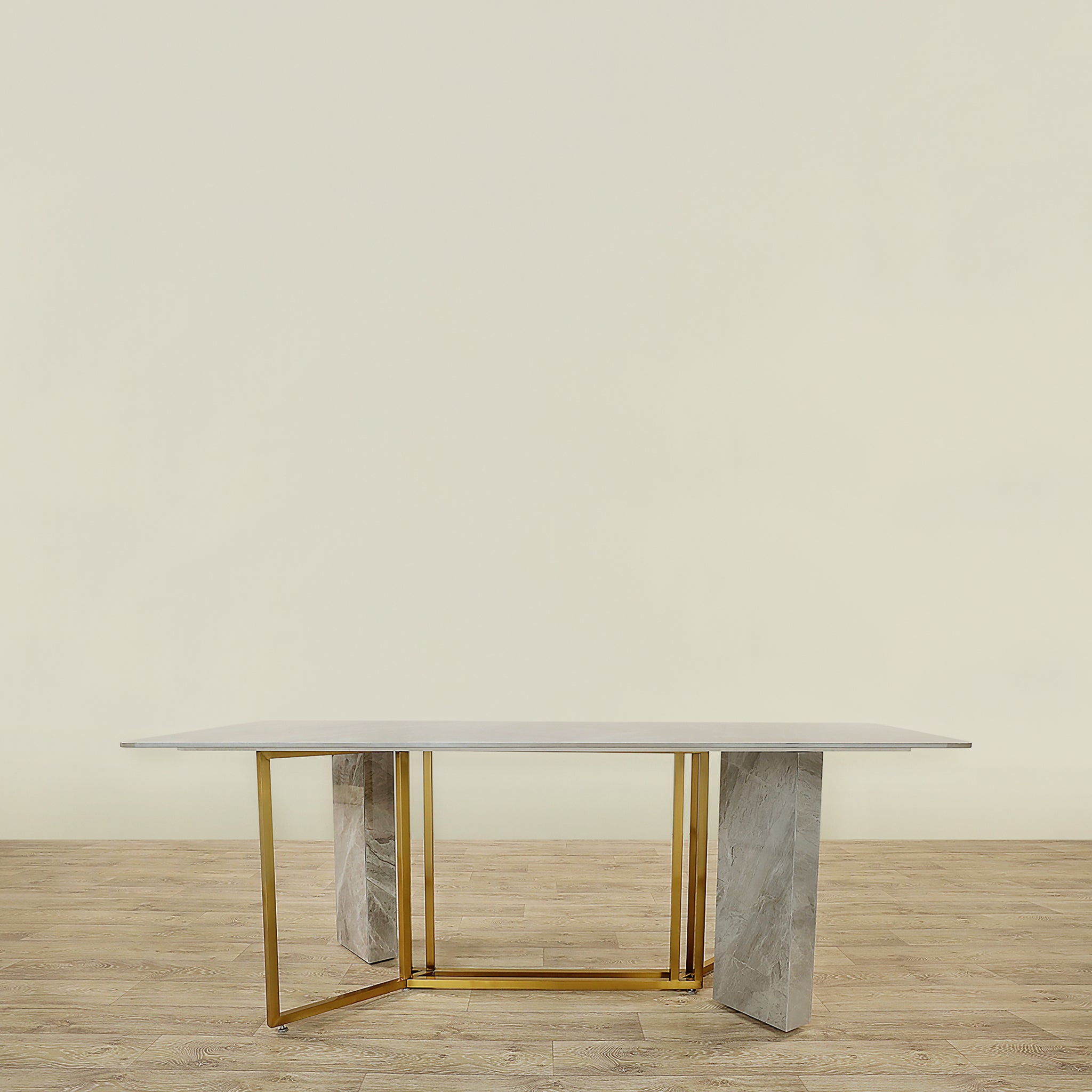 The Naava dining table is endowed with a stunning mix of materials. Slim chrome gold stainless steel legs are paired with white marble legs to support a rectangular marble top with beautifully rounded corners.