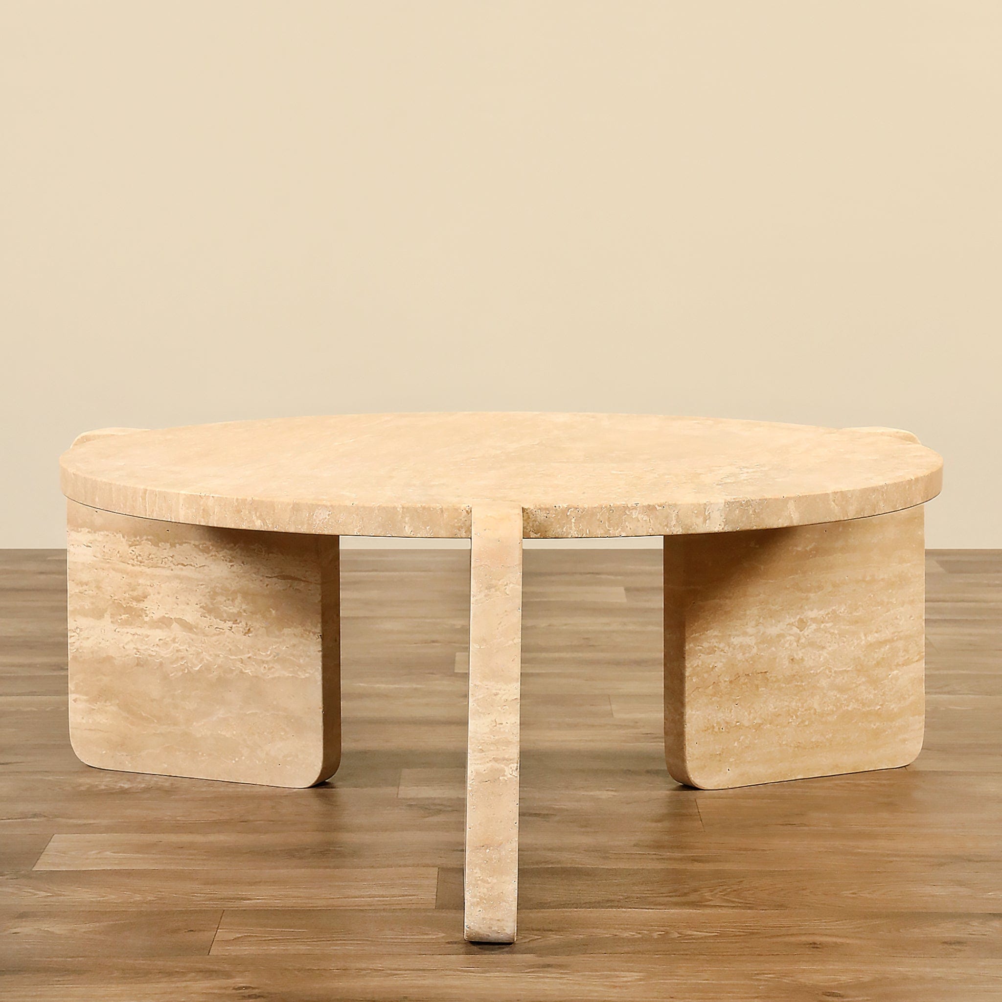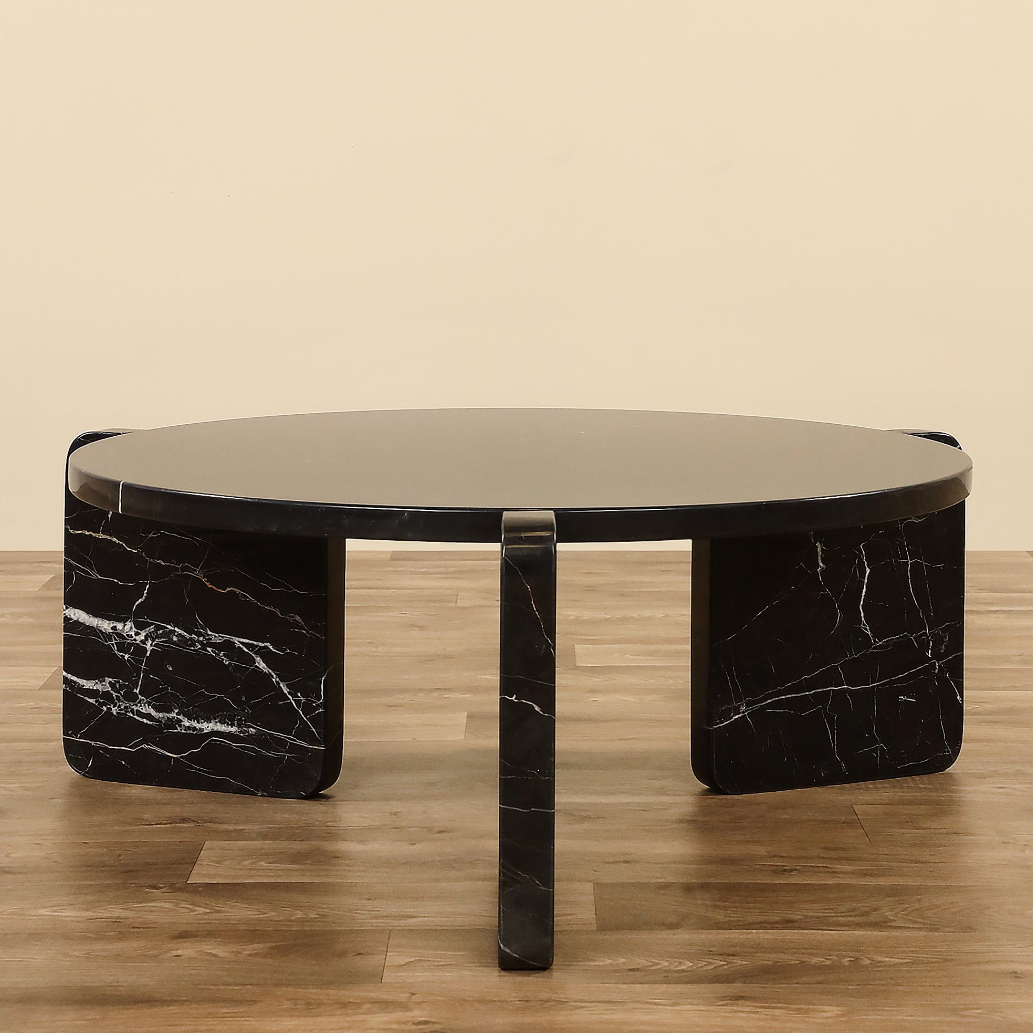 Raised on thick slat legs, the Nasello Coffee Table offers a circular shape to round out a seating area and offer service from every side. The contemporary style shows off the beautiful marble to perfection to lend a rich look to any space.