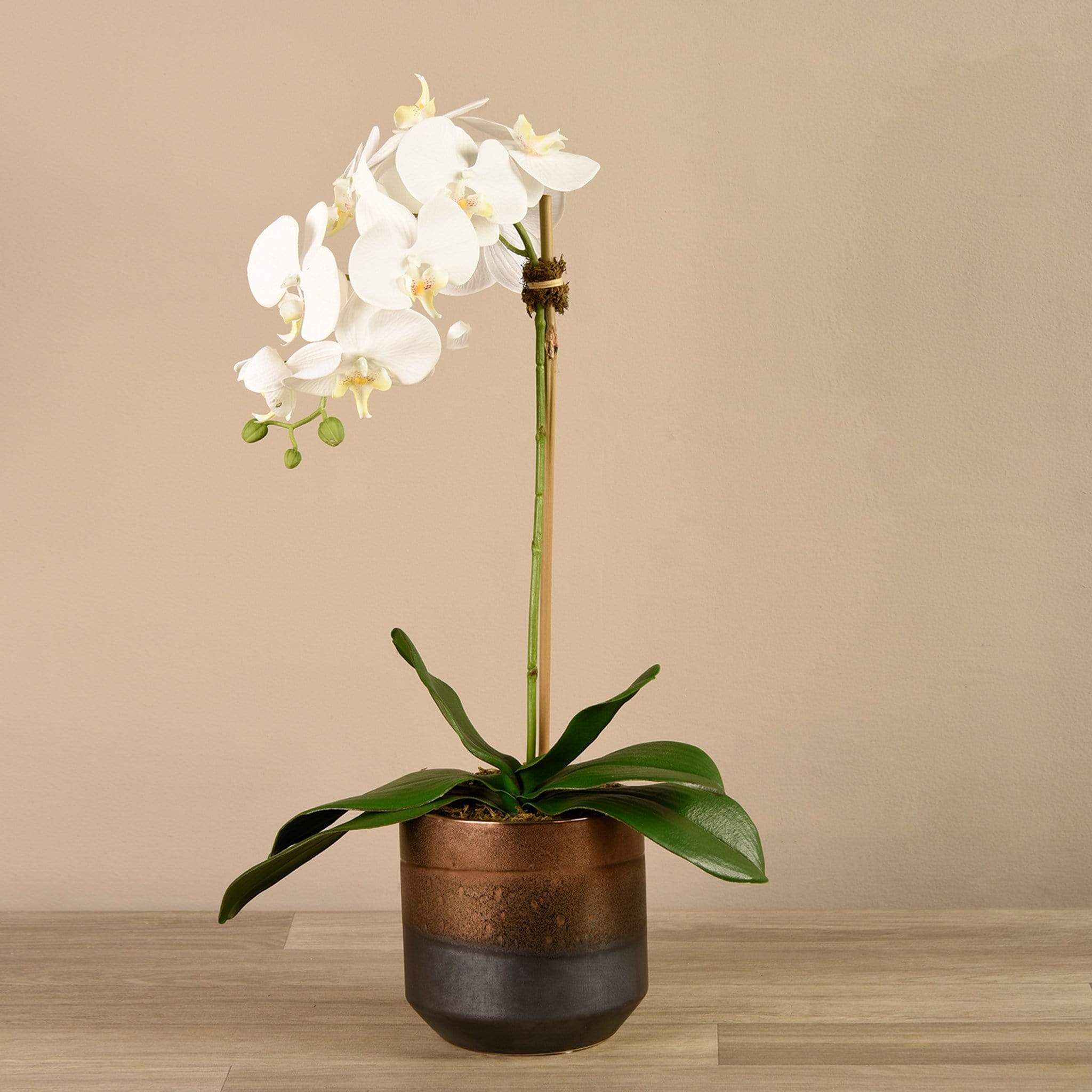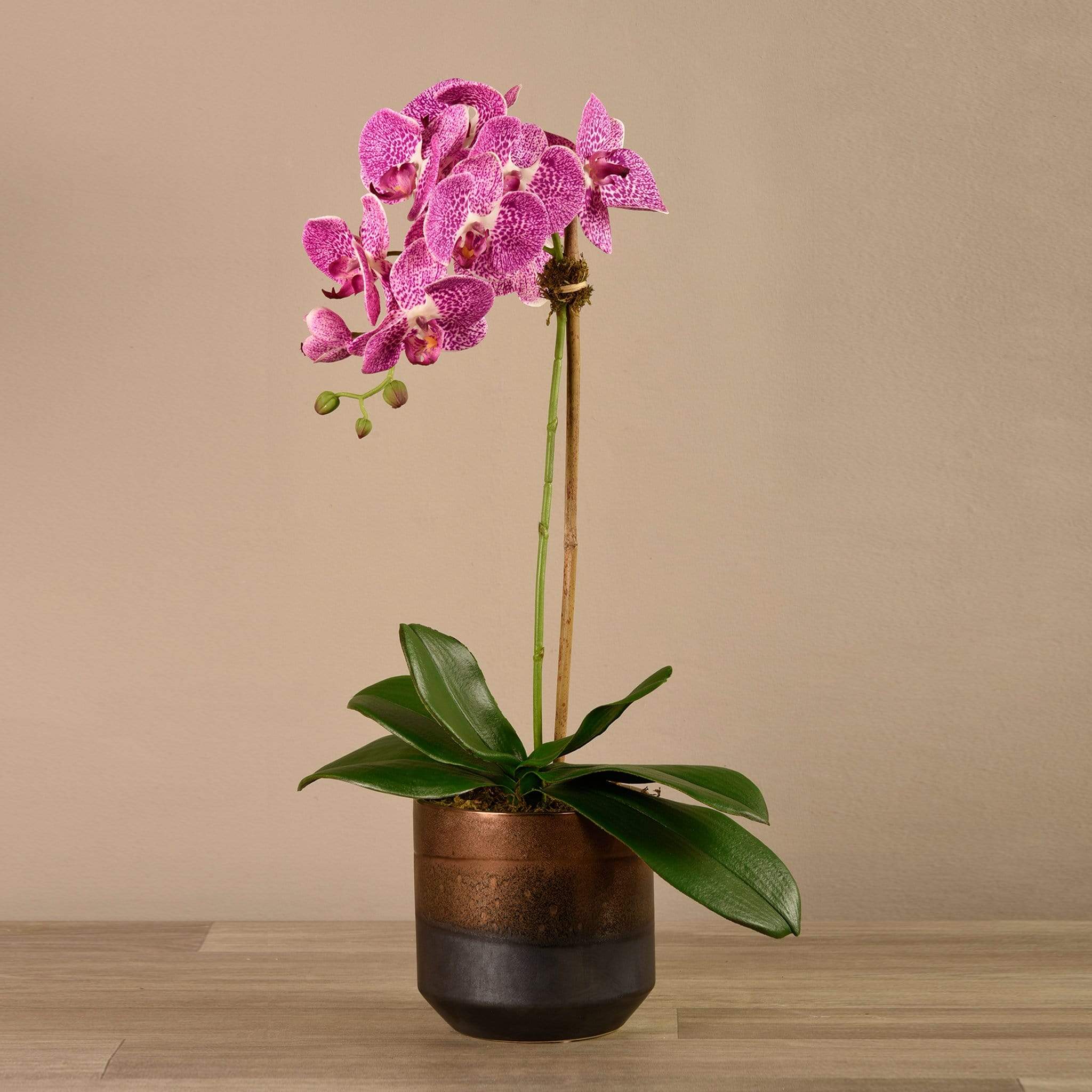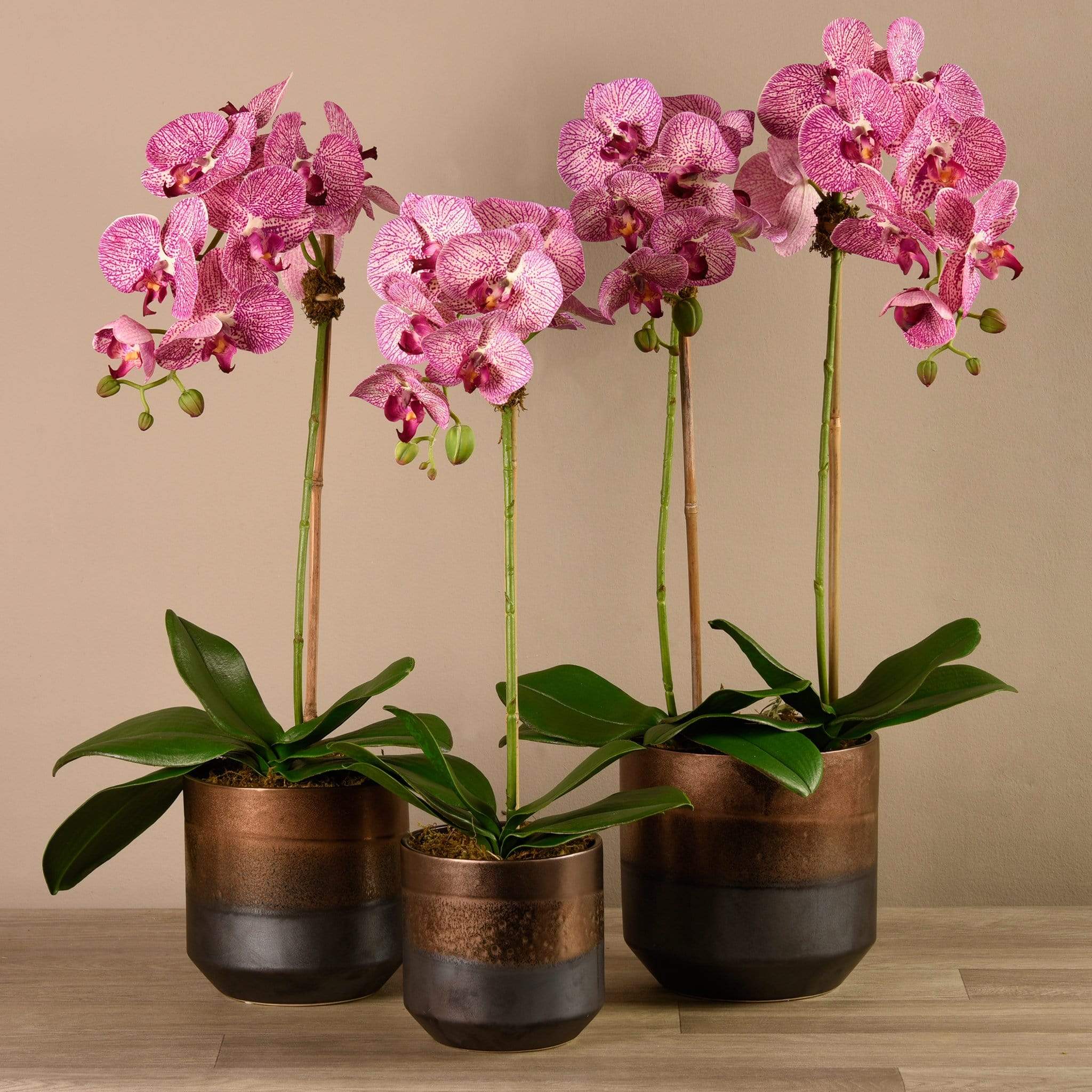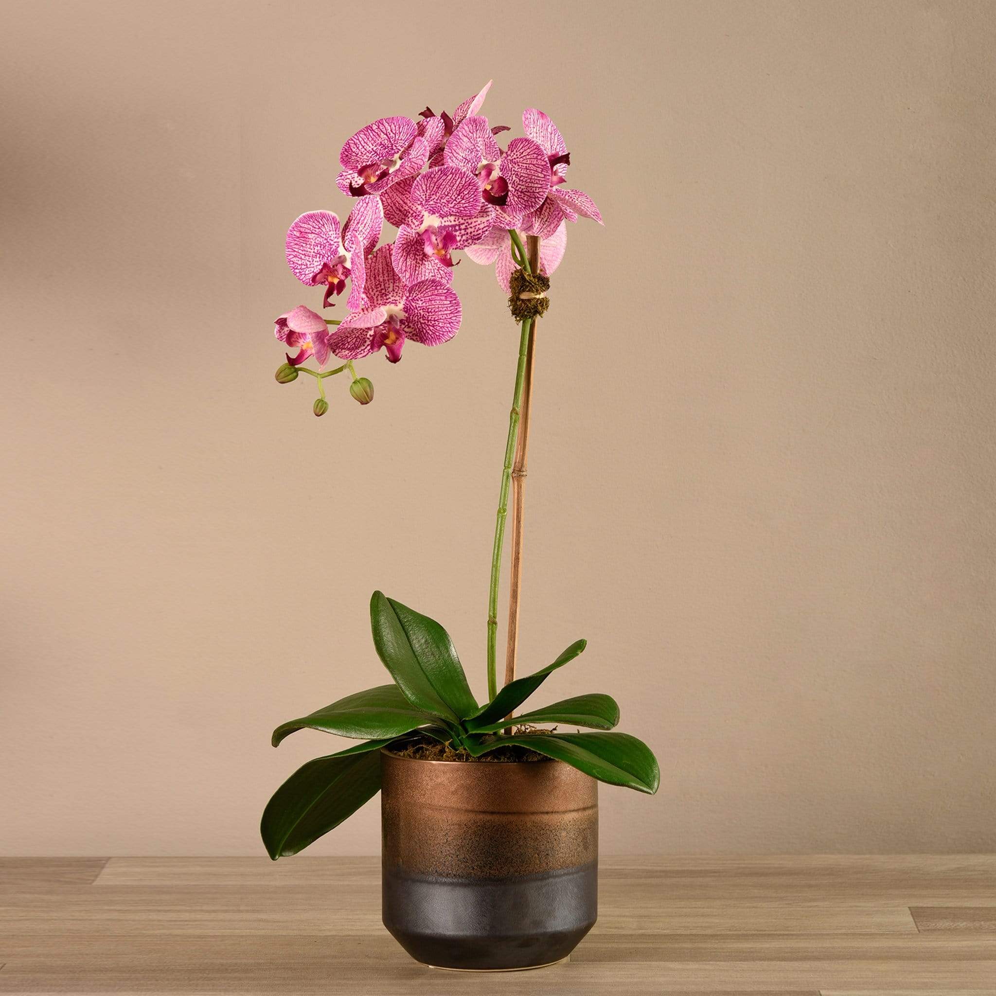 This beautiful orchid arrangement instantly makes any living space feel even more sophisticated. Handmade by expert florists using real-touch technology, these artificial orchids look and feel remarkably lifelike. Their copper and grey pot adds a modern touch.
