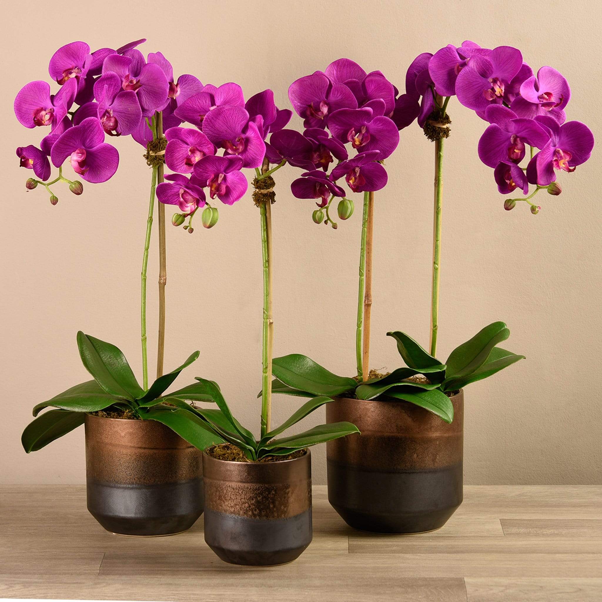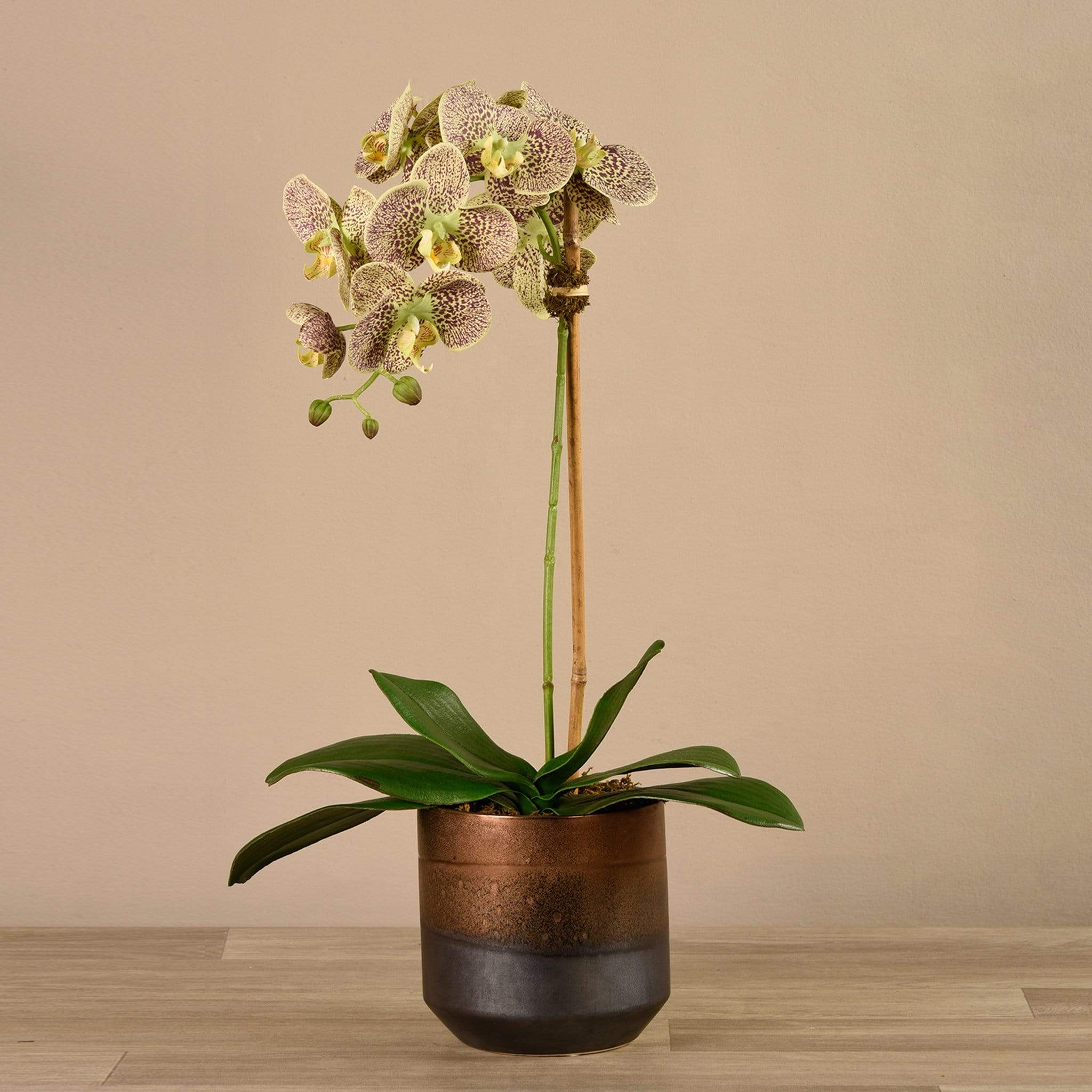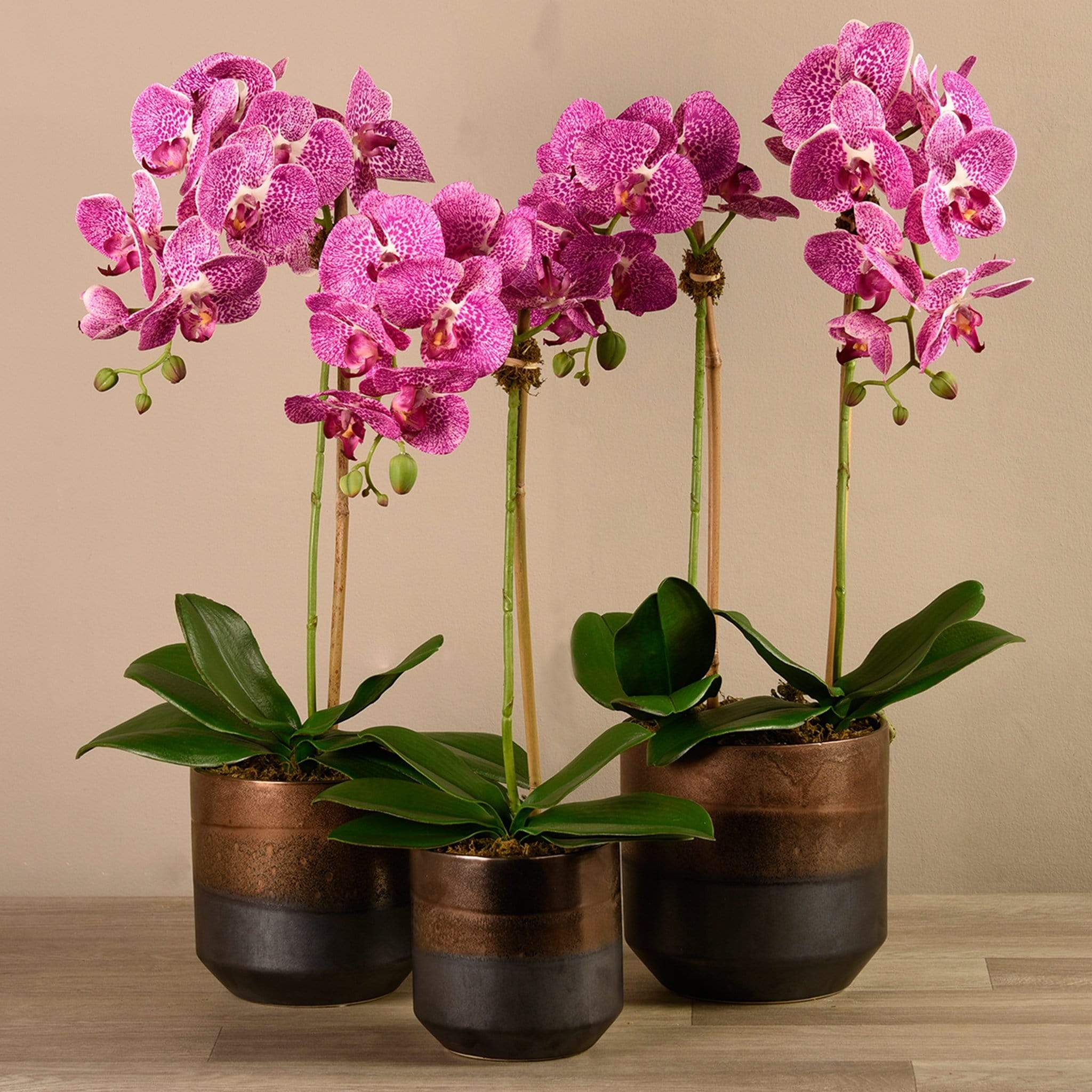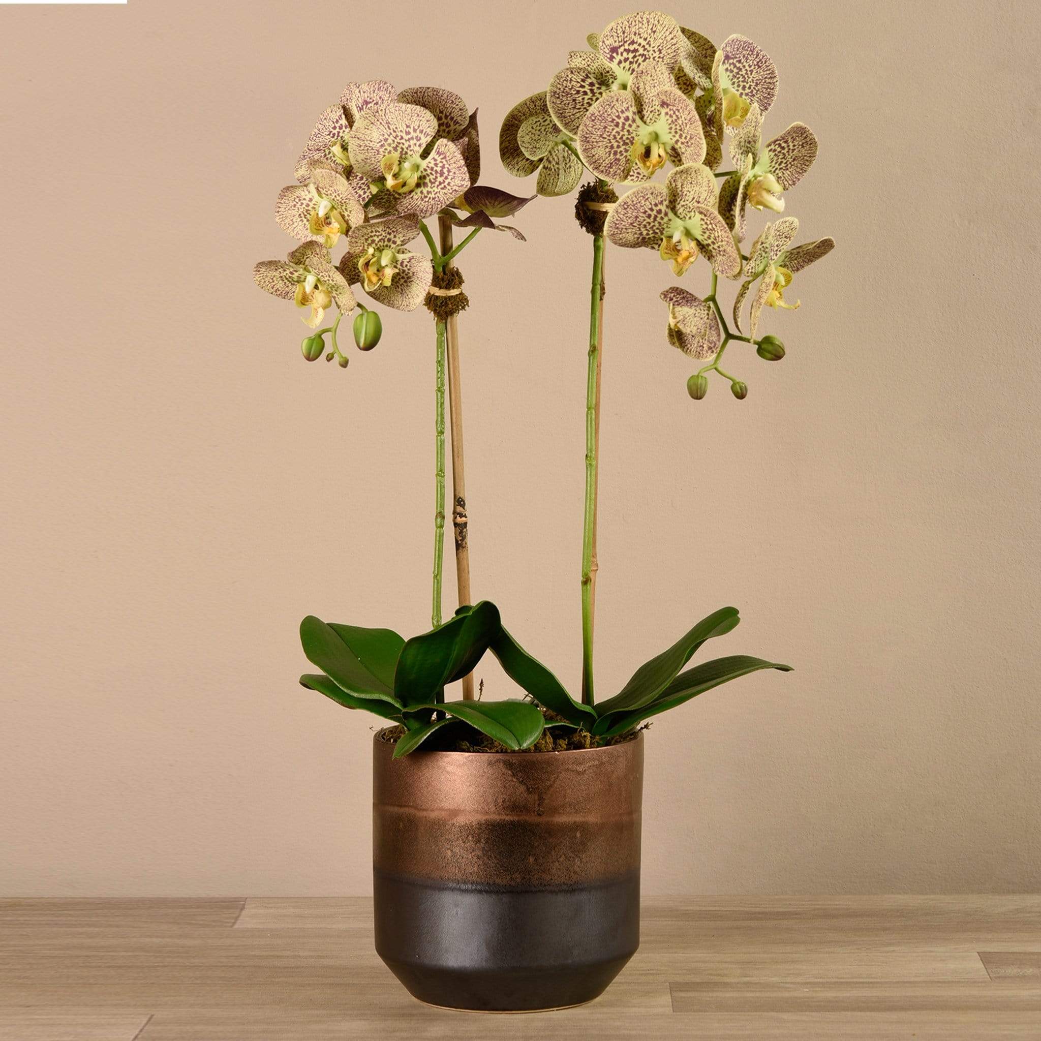This beautiful orchid arrangement instantly makes any living space feel even more sophisticated. Handmade by expert florists using real-touch technology, these artificial orchids look and feel remarkably lifelike. Their copper and grey pot adds a modern touch.