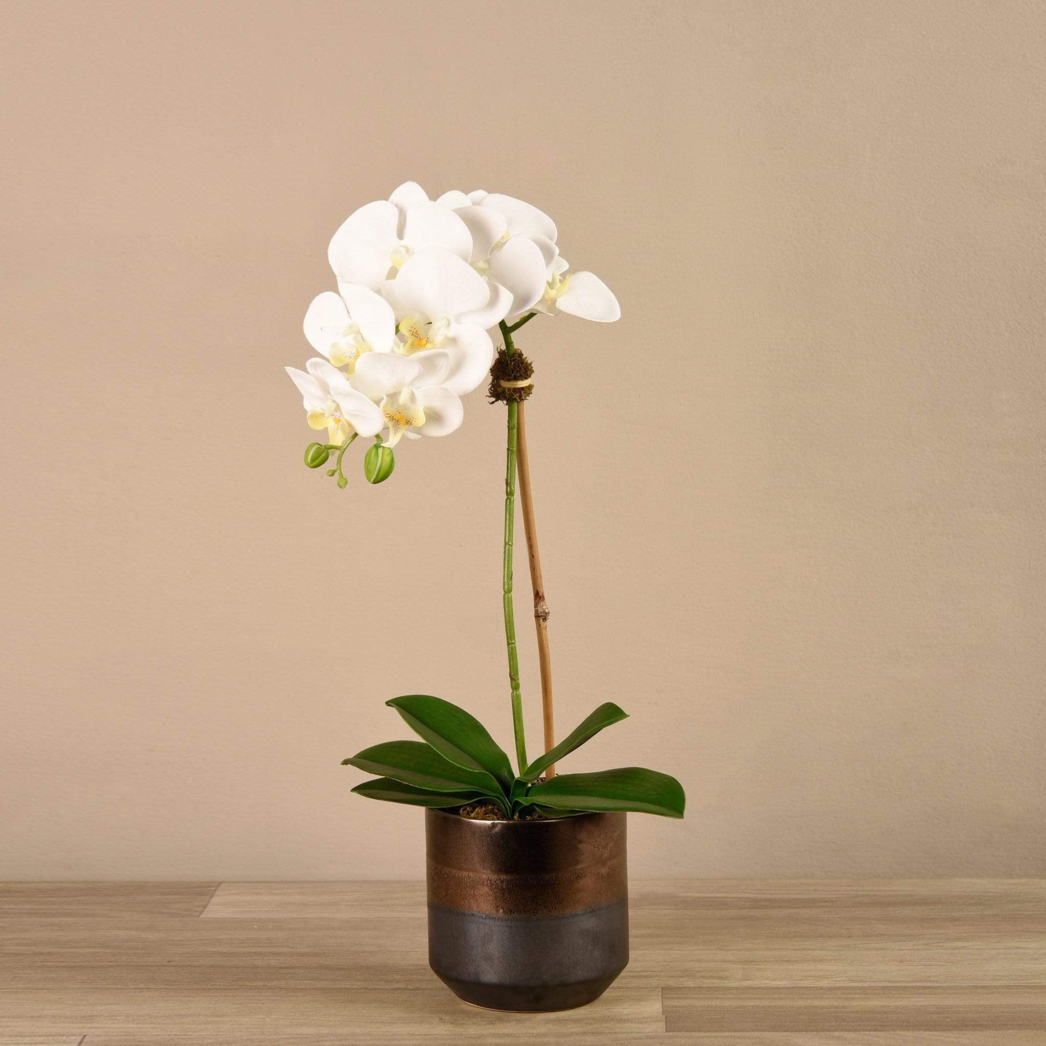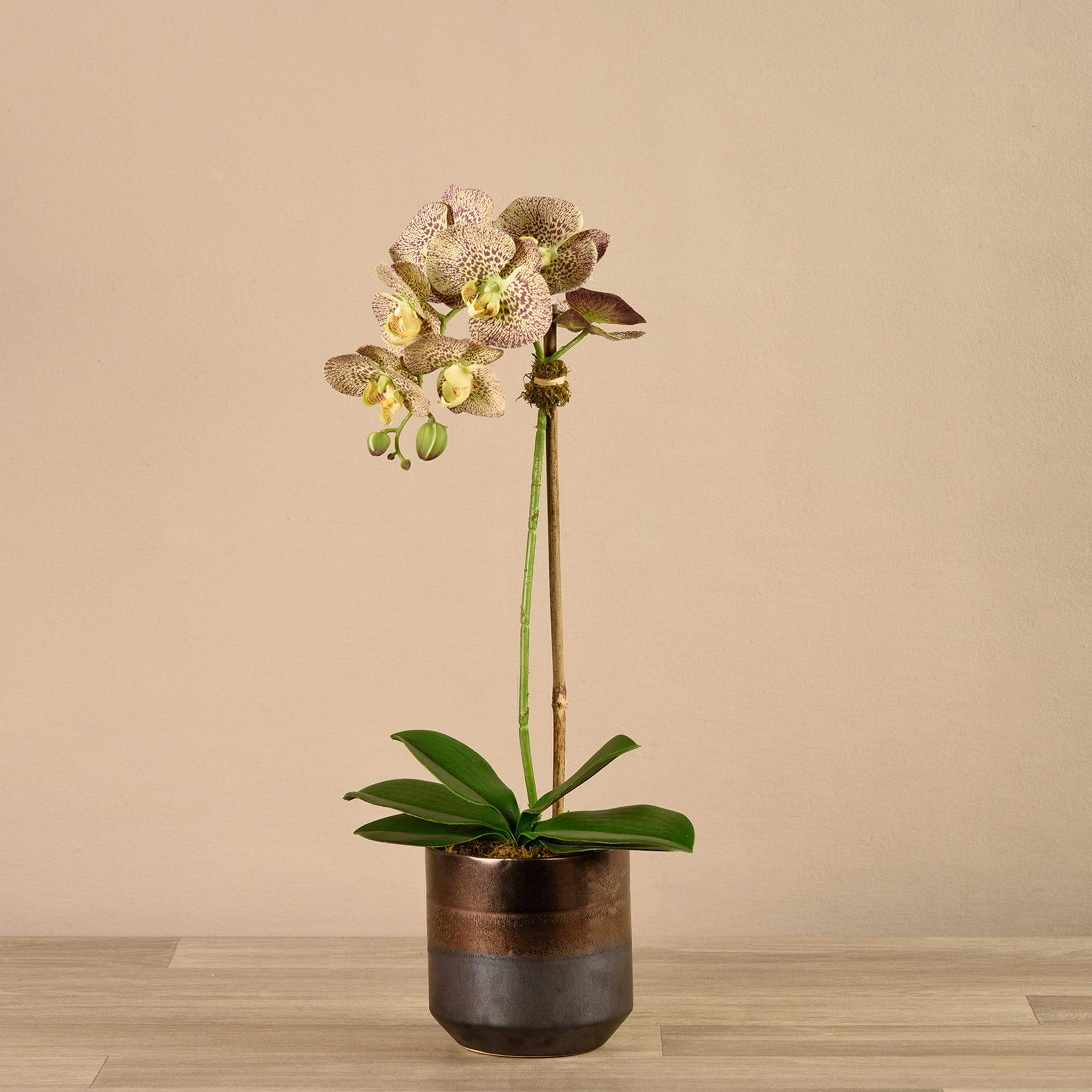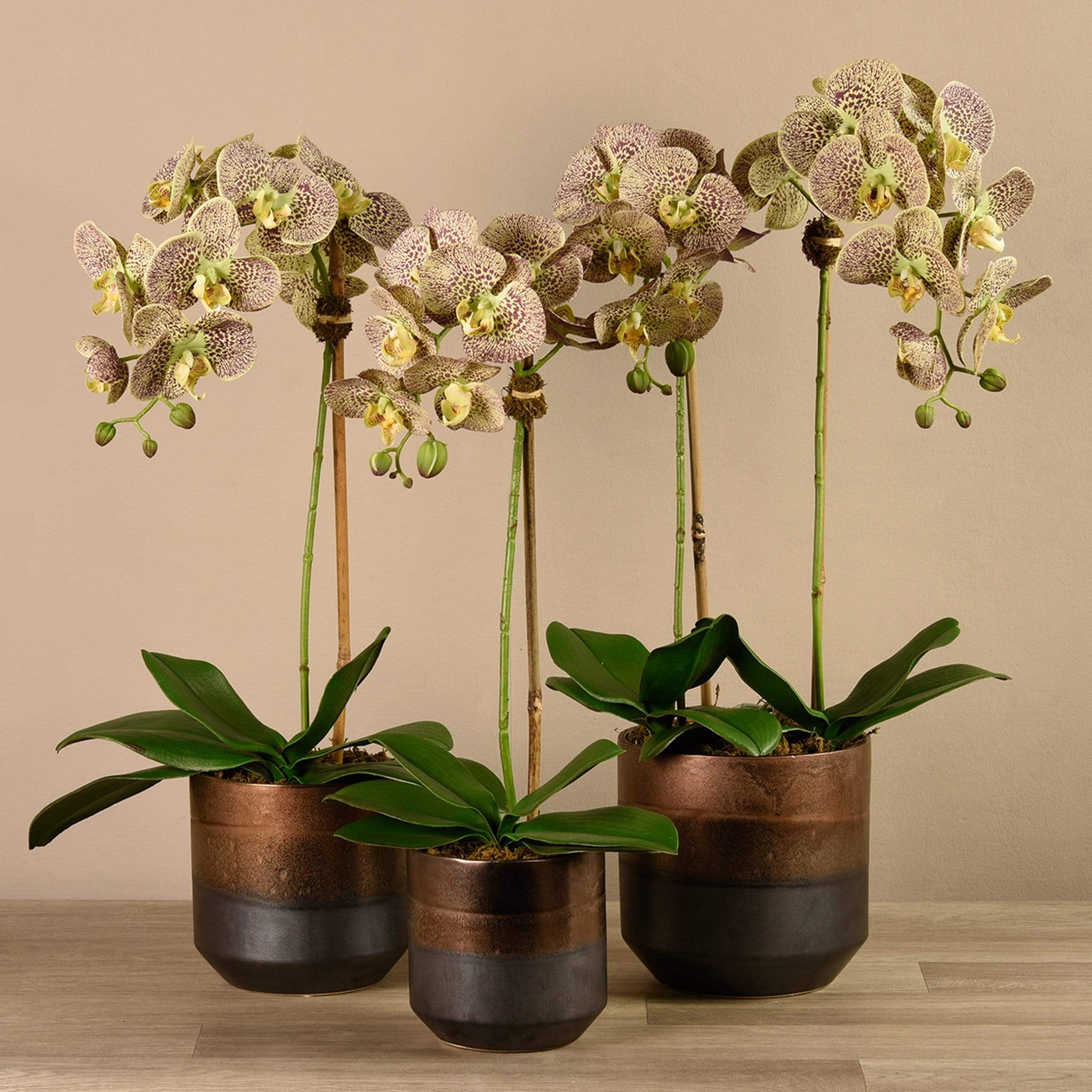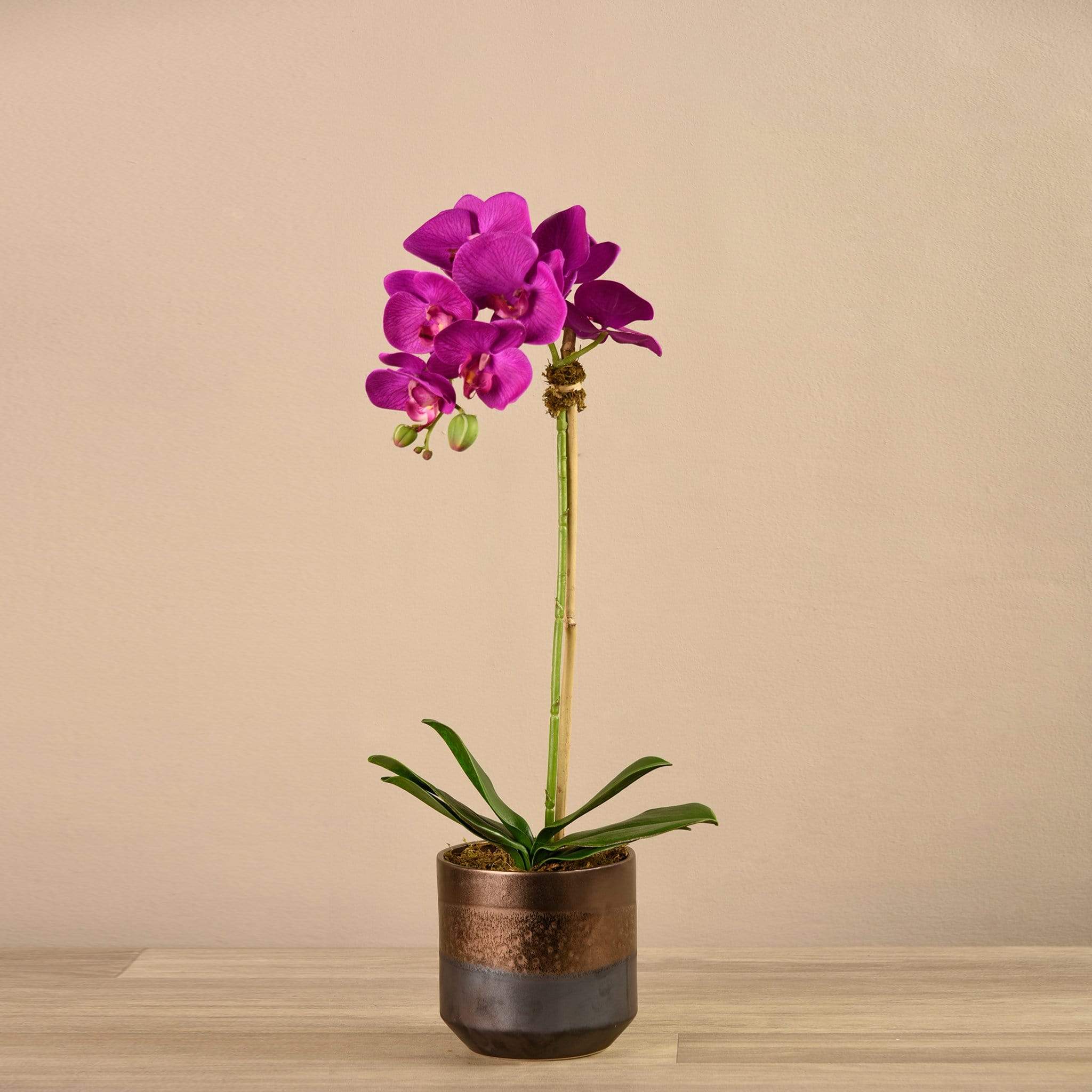 This beautiful orchid arrangement instantly makes any living space feel even more sophisticated. Handmade by expert florists using real-touch technology, these artificial orchids look and feel remarkably lifelike. Their copper and grey pot adds a modern touch.