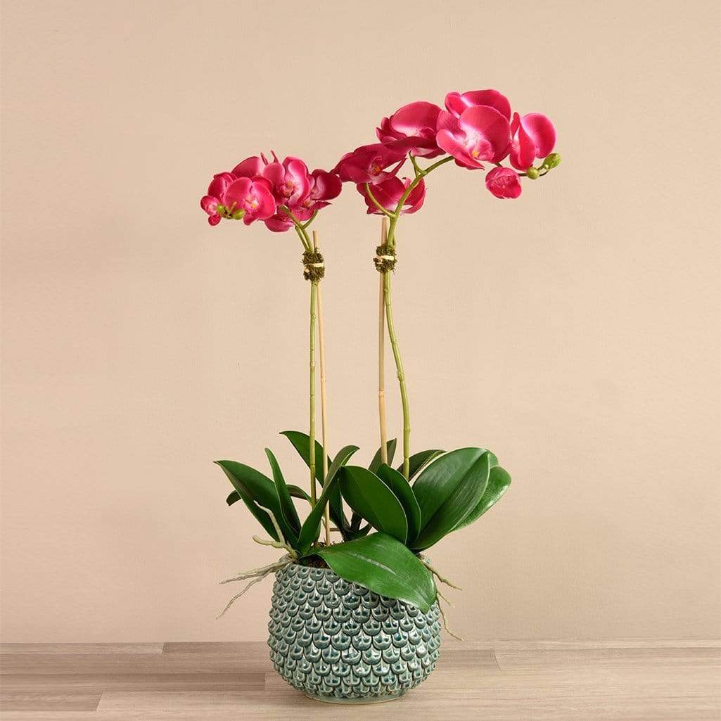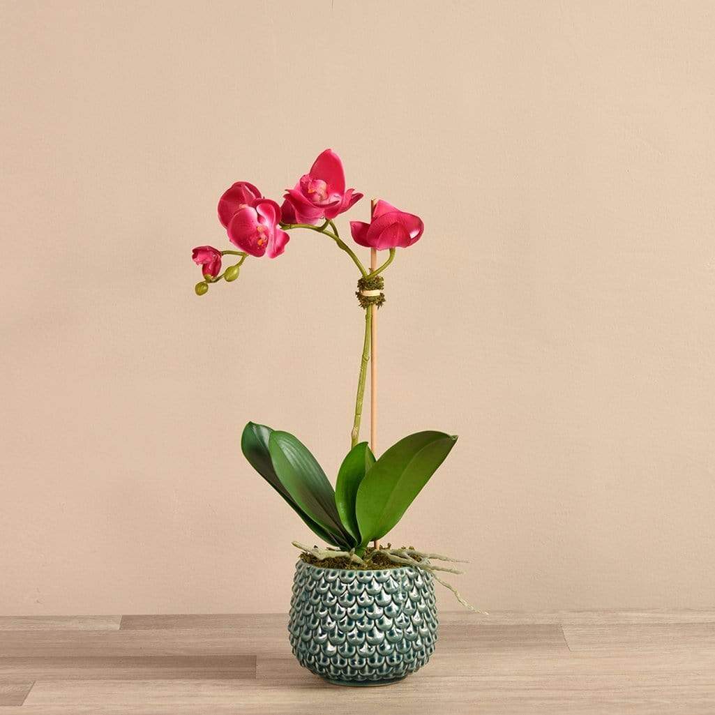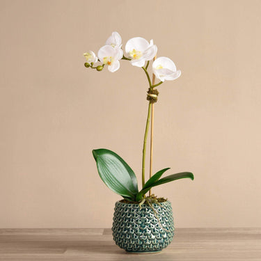 Bloomrs Pearl Artificial Orchid Arrangement is the perfect way to soften a masculine or industrial interior. With thoughtfully patterned teal ceramic vases, white faux orchids, and vibrantly green leaves, this silk floral centerpiece is neutral in tone and feminine by design. Place these on the kitchen counter, the breakfast table, or the living room floor for a brighter day every day. Made from the highest quality, real-touch orchids and always made to order by real florists.