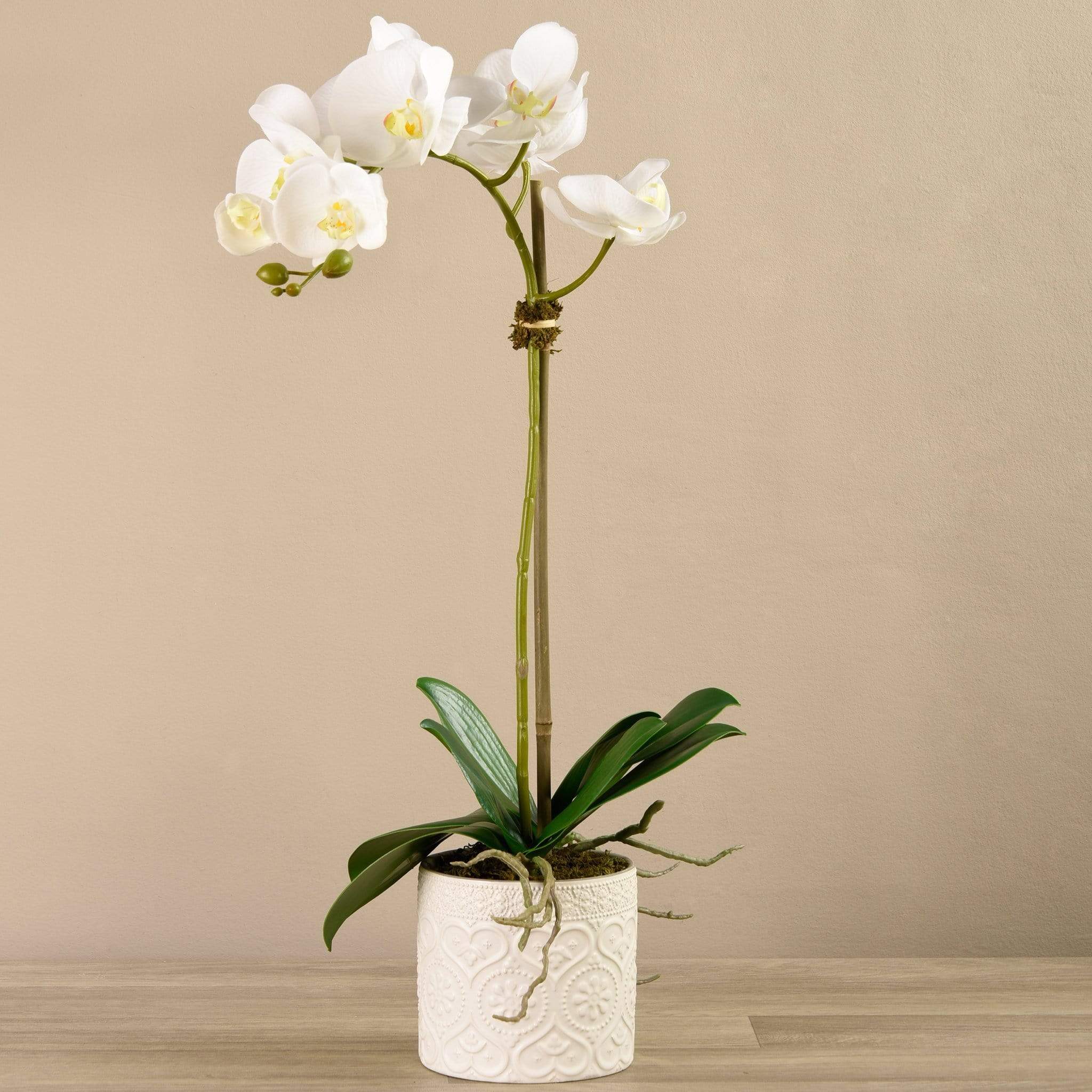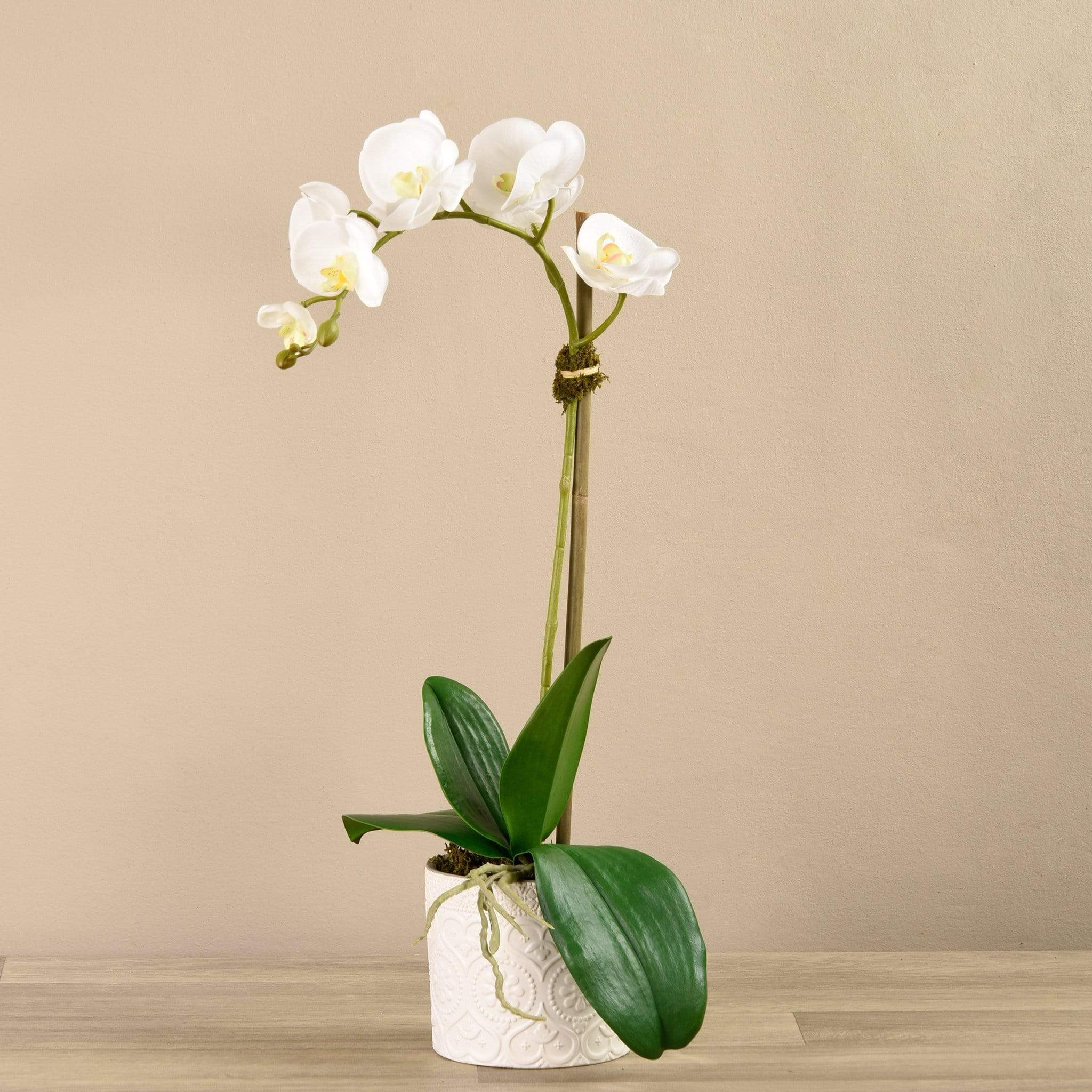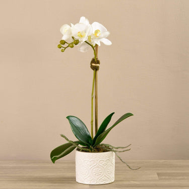Transform your space with the beauty of our Artificial Orchid Arrangement. Every meticulously detailed orchid bloom and lush foliage mirrors the natural charm of real orchids. Nestled in a modern planter, this artificial orchid is a low-maintenance yet high-impact addition to your decor.