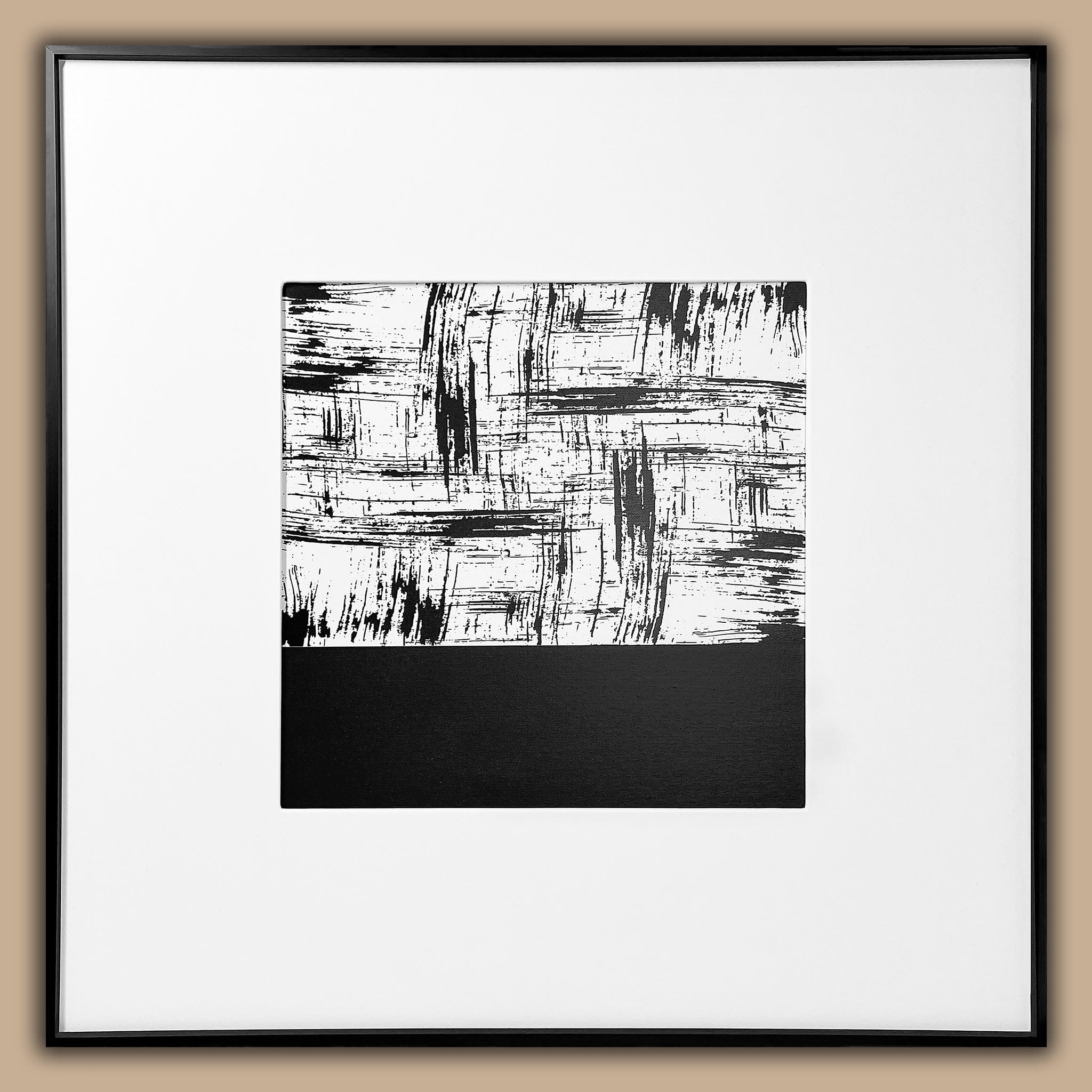 This graphic black-and-white painting is an invitation to appreciate the beauty found in the interplay of contrasting tones and textures. It is ideal for those seeking a contemporary piece to effortlessly elevate their space while exuding a timeless sense of sophistication.