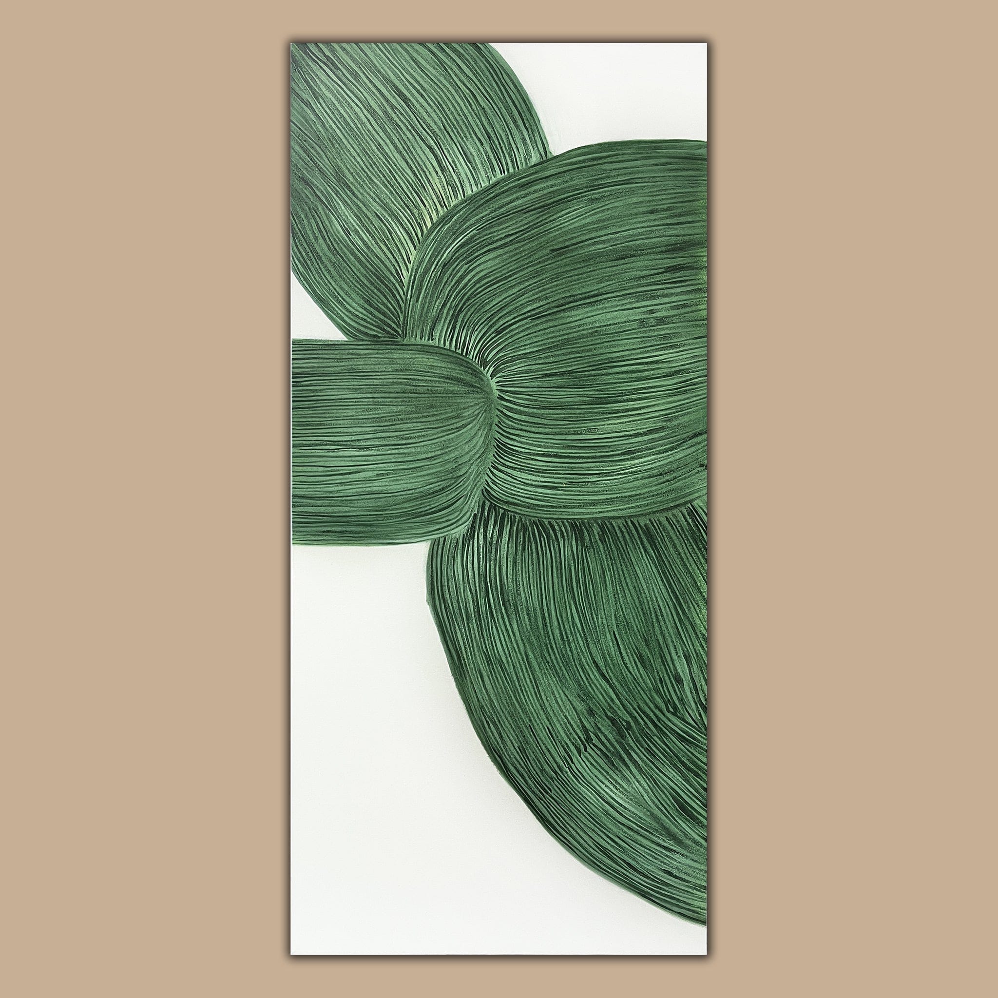 This frameless work of art captivates the senses, as the subtle contrast between white and green hues creates a visual treat of texture and tone. The frameless style encourages a direct and unobstructed connection between the observer and the art, enabling an immersive experience.