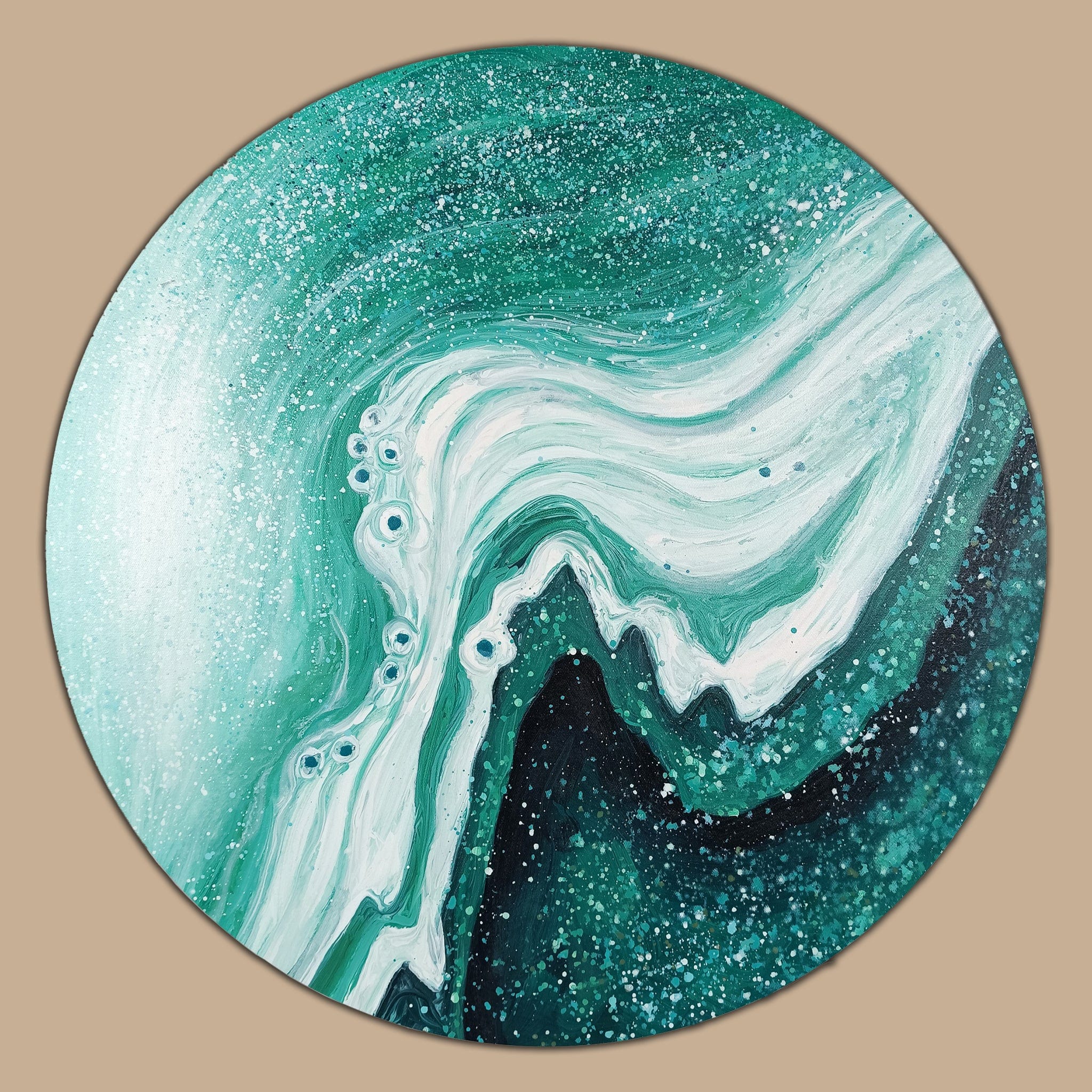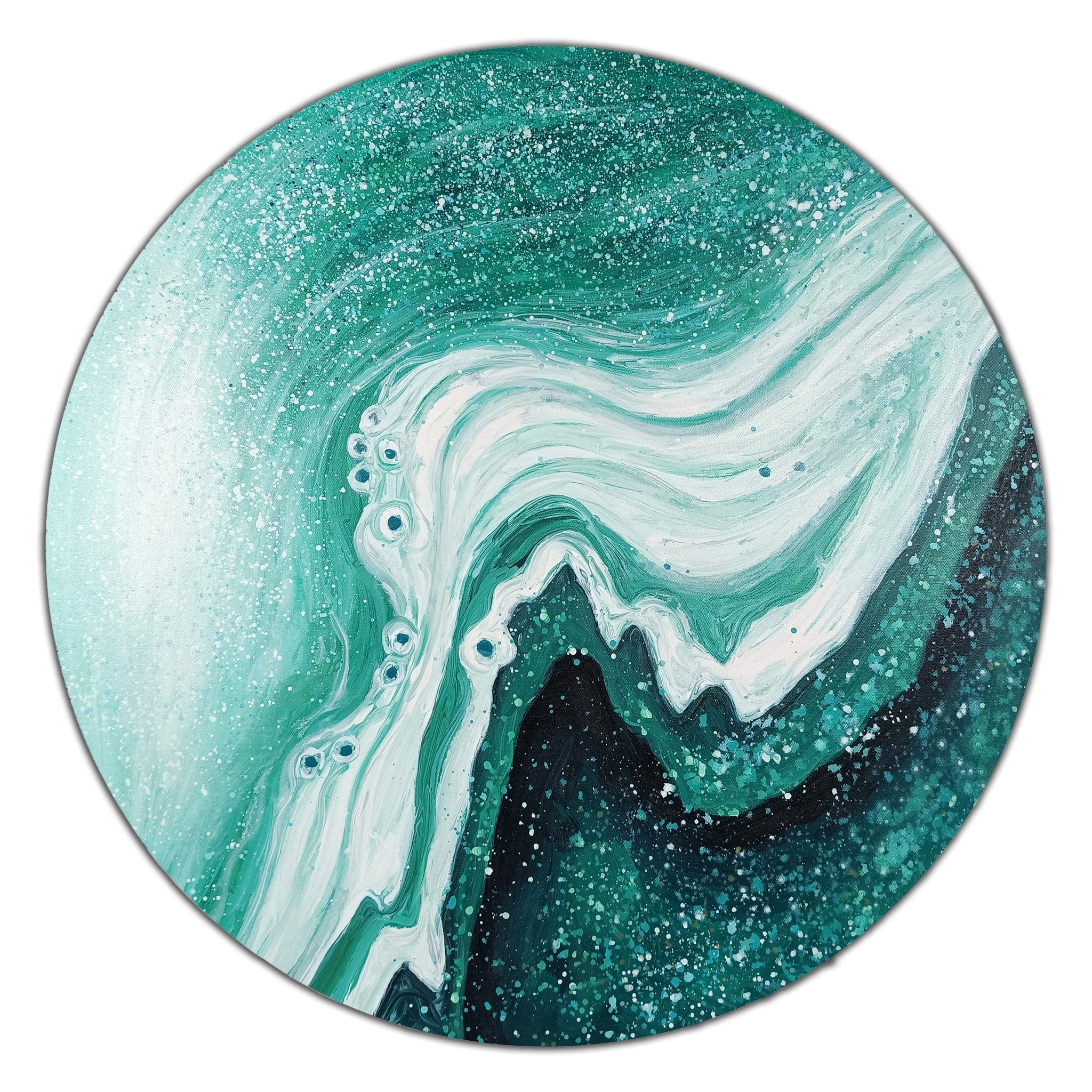 This captivating frameless abstract painting transcends boundaries for bold impact. It is crafted with resin and detailed with a touch of gold glitter to unfold like a dance of wavelike designs in a tranquil palette of blues, greens, and whites.