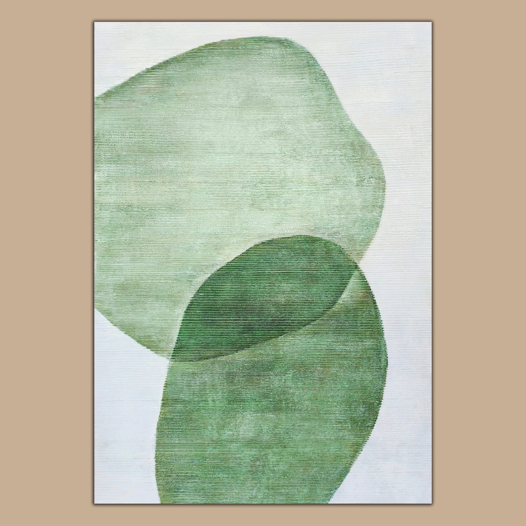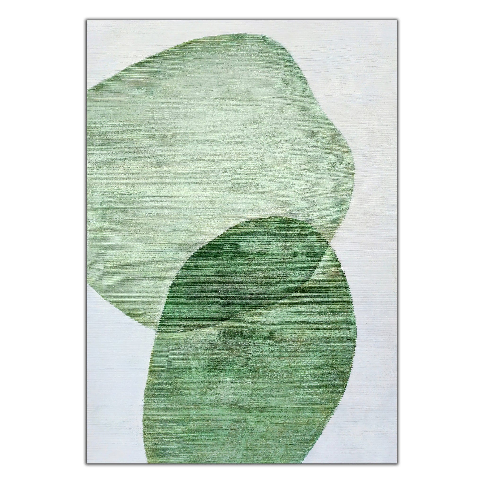 Simple yet elegant this modern painting uses beautiful shades of green set against a white backdrop to create a visual delight. The frameless style adds to the contemporary look making this a wonderful choice for a minimalist or transitional interior style.
