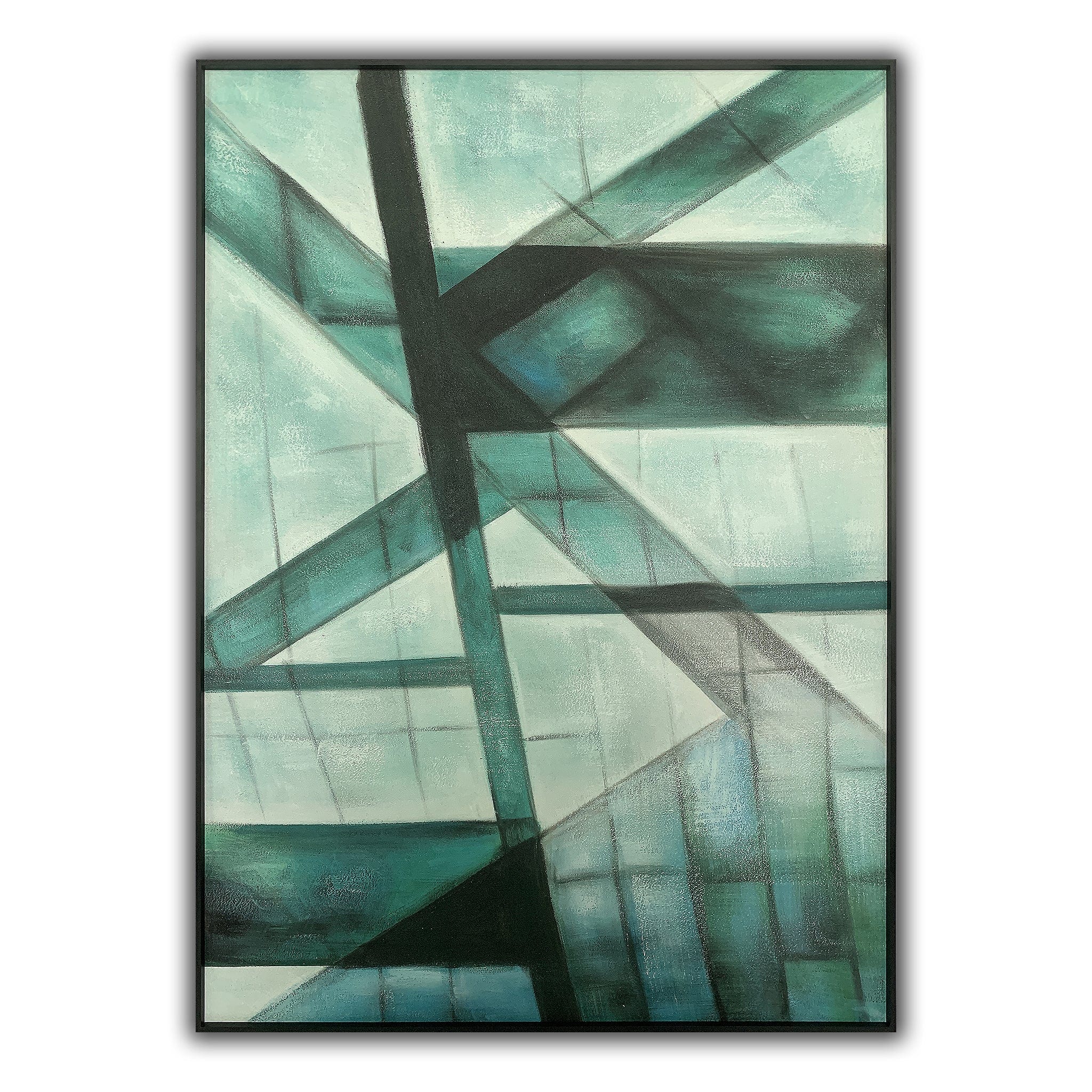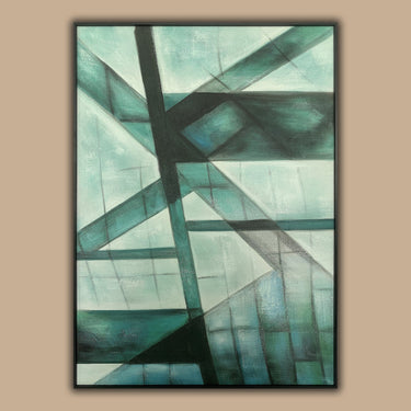 Evoking urban design and structures this abstract painting features clean lines and soft tones, highlighted by touches of black and grey. It effortlessly captures the modern city vibe, harmonizing elegance with a touch of urban energy.