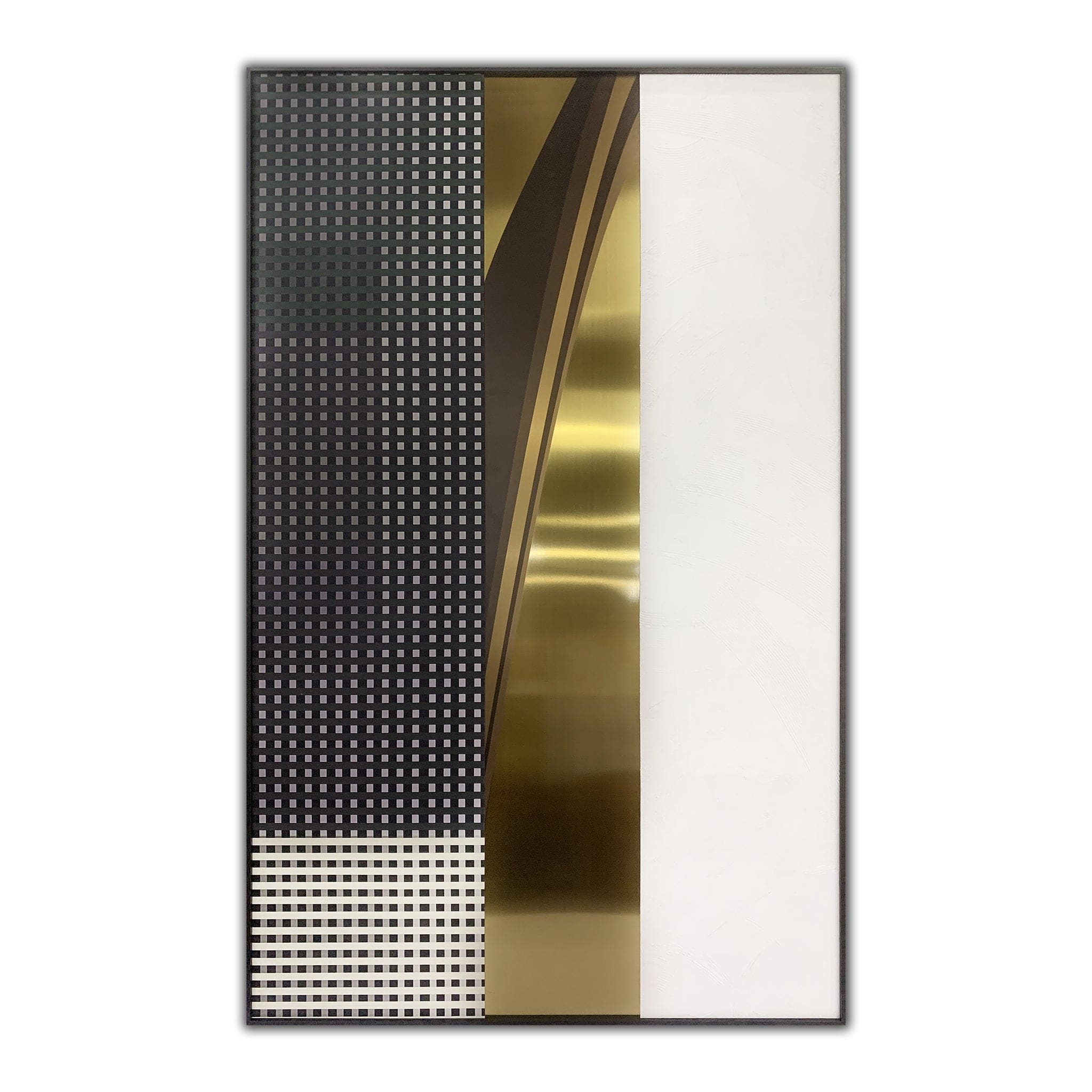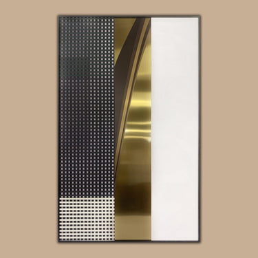 This contemporary acrylic print boasts a 1mm brushed titanium gold stainless steel UV coating, enhancing its allure. Hand-painted textures enrich the surface, harmonizing with clean lines. A fusion of modern elegance and craftsmanship, this piece stands as a captivating expression of refined sophistication.