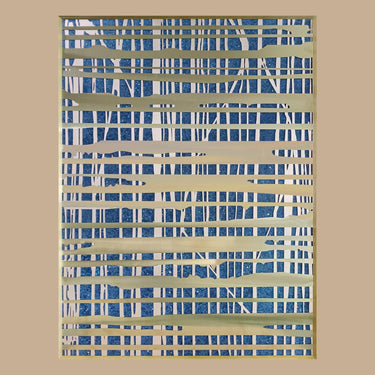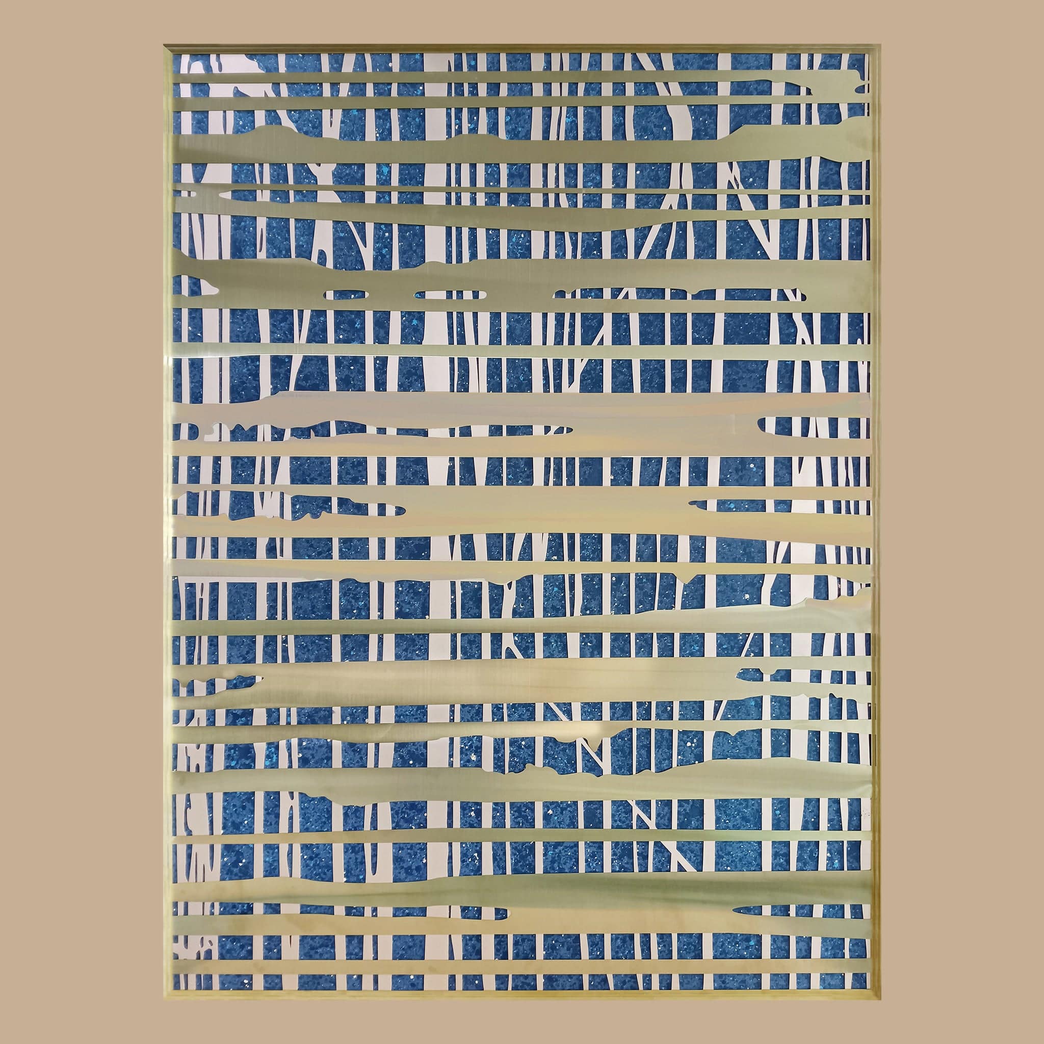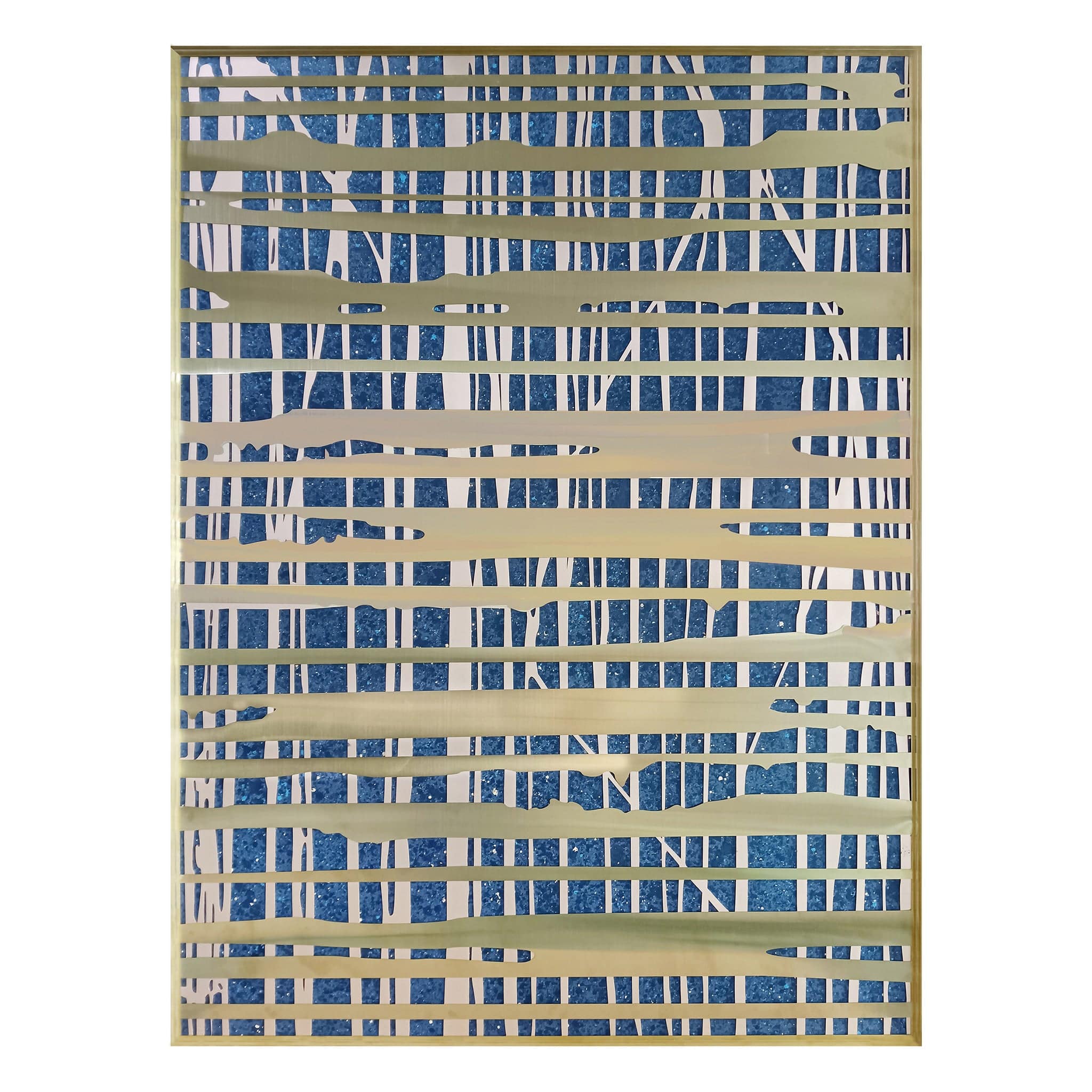 Enjoy elegance with this contemporary painting, featuring an abstract grid design adorned with luxurious gold foil. The interplay of gold and shades of blue evokes a sense of sophistication all encased in a champagne frame for a captivating visual narrative.