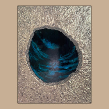 This contemporary artwork is a frameless beauty crafted through woodcarving, texture painting, coloring, painting at the back, and resin techniques. Hues of blues and neutrals converge, creating an effect reminiscent of a geode segment. The blend of craftsmanship and artistic innovation yields a mesmerizing composition that captures the essence of modern elegance and natural beauty.