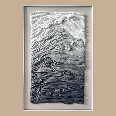 Enhance your aesthetic with this silver framed work of art. The composition is alive with soft clay shaping, acrylic sheeting, and a brushed leather bottom to create a dynamic visual resulting in a contemporary artwork that captivates with its depth and composition.
