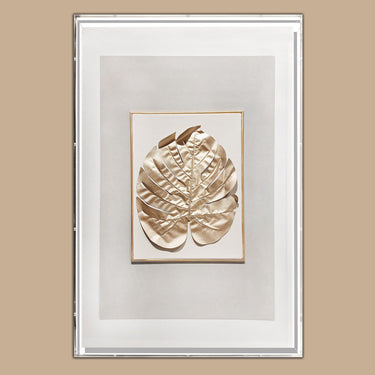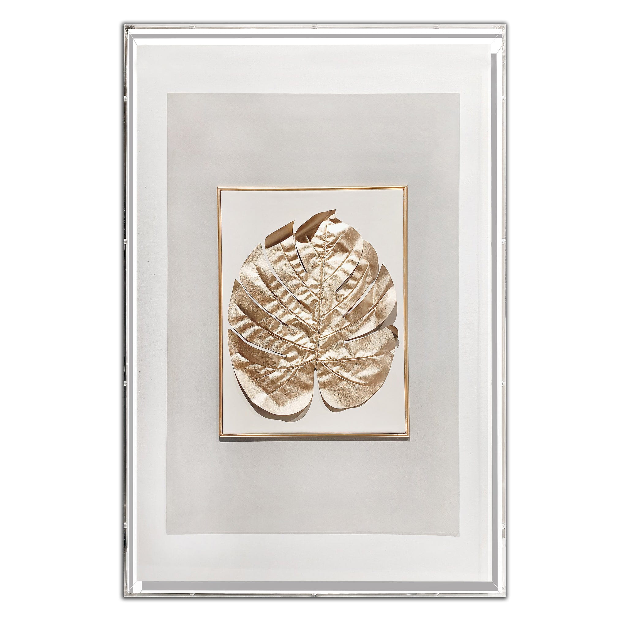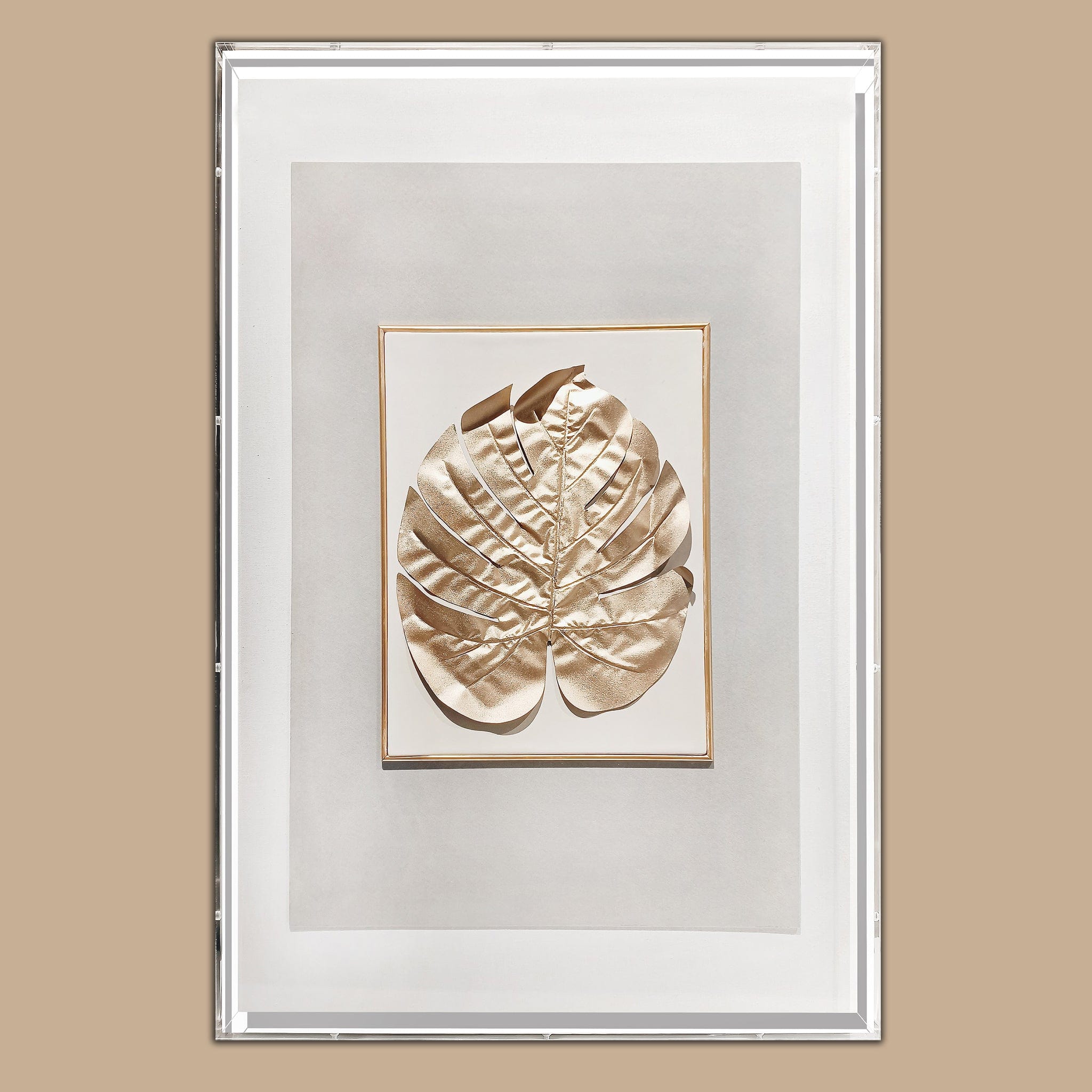 This artwork is presented in an acrylic box, creating a modern aesthetic. It showcases a finely detailed leaf at its center to captivate viewers and bring a natural touch to any decor. Crafted with leather and wood carving techniques, this piece will add texture and is well-suited to enhance any wall in a home or office.