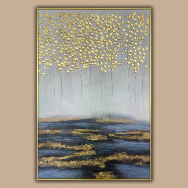 Painted with oil, this abstract artwork is encased in a sleek champagne frame, providing a sophisticated contrast to the luminous hues within the composition. The contemporary flair and skillful use of color are prominently showcased in this beautifully crafted handmade oil painting, making it an ideal addition to various decorating styles.