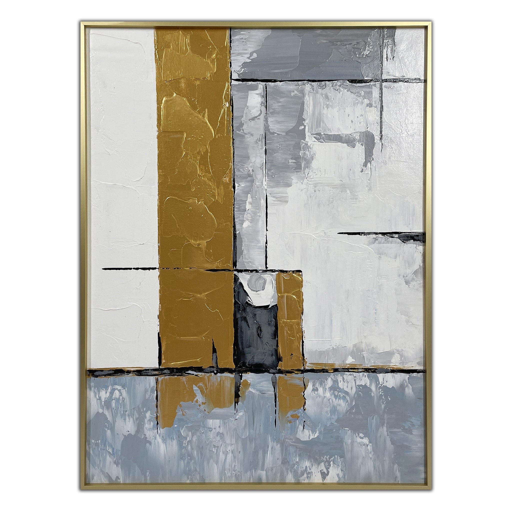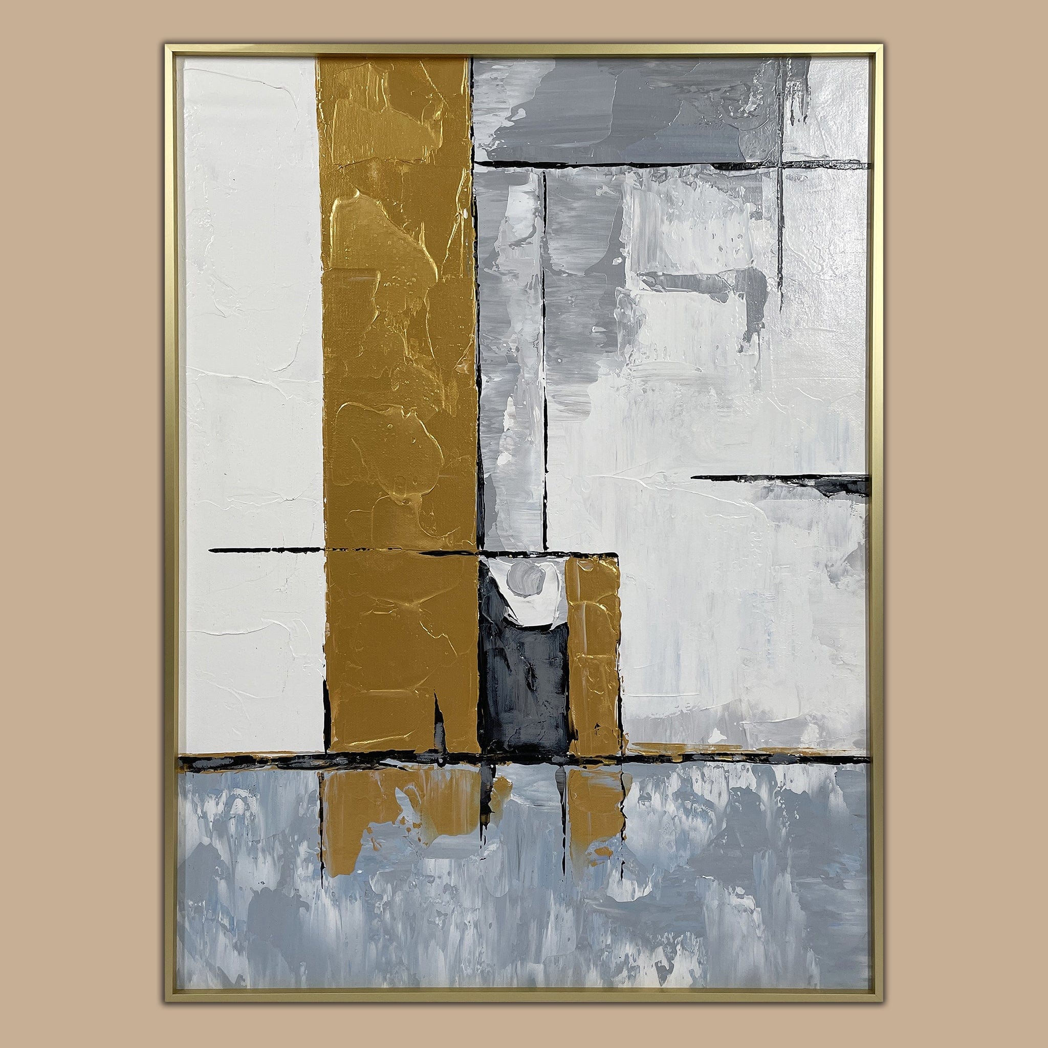 Painted with oil, this abstract artwork is encased in a sleek champagne frame, providing a sophisticated contrast to the neutral and gold tones within the composition. This beautifully crafted handmade oil painting prominently showcases the contemporary flair and skillful use of form and shape, making it an ideal addition to various decorating styles
