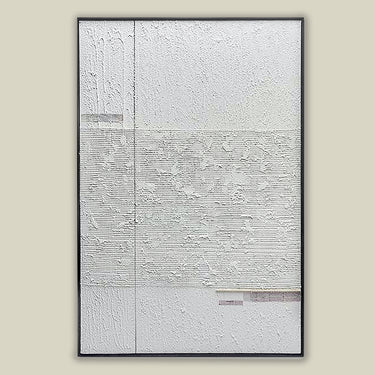 Plunge into the world of abstract art with this beautiful acrylic painting, framed in black. This artwork invites interpretation and admiration, featuring only white, shapes, and textures. Enhance your space with this modern and expressive piece that sparks imagination.