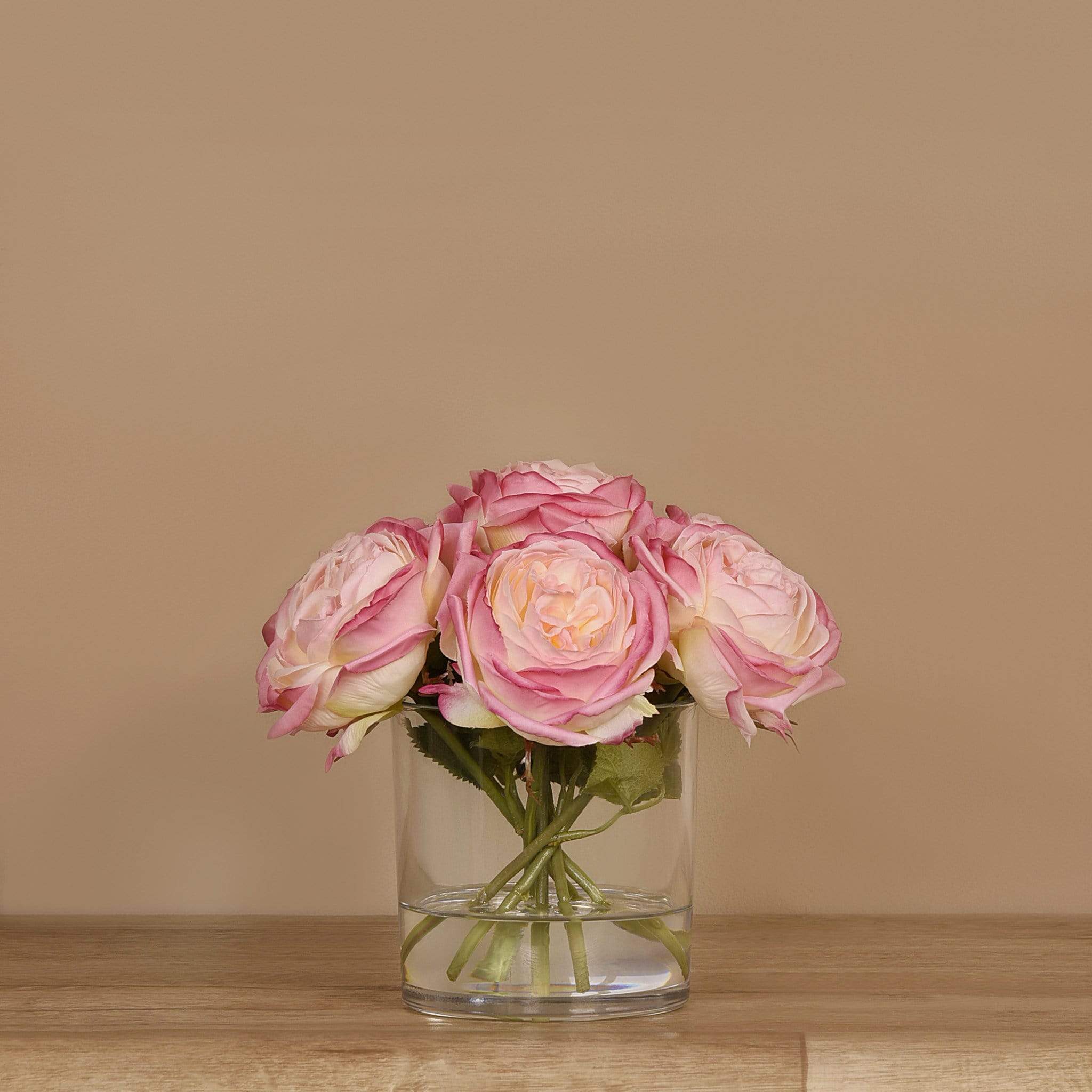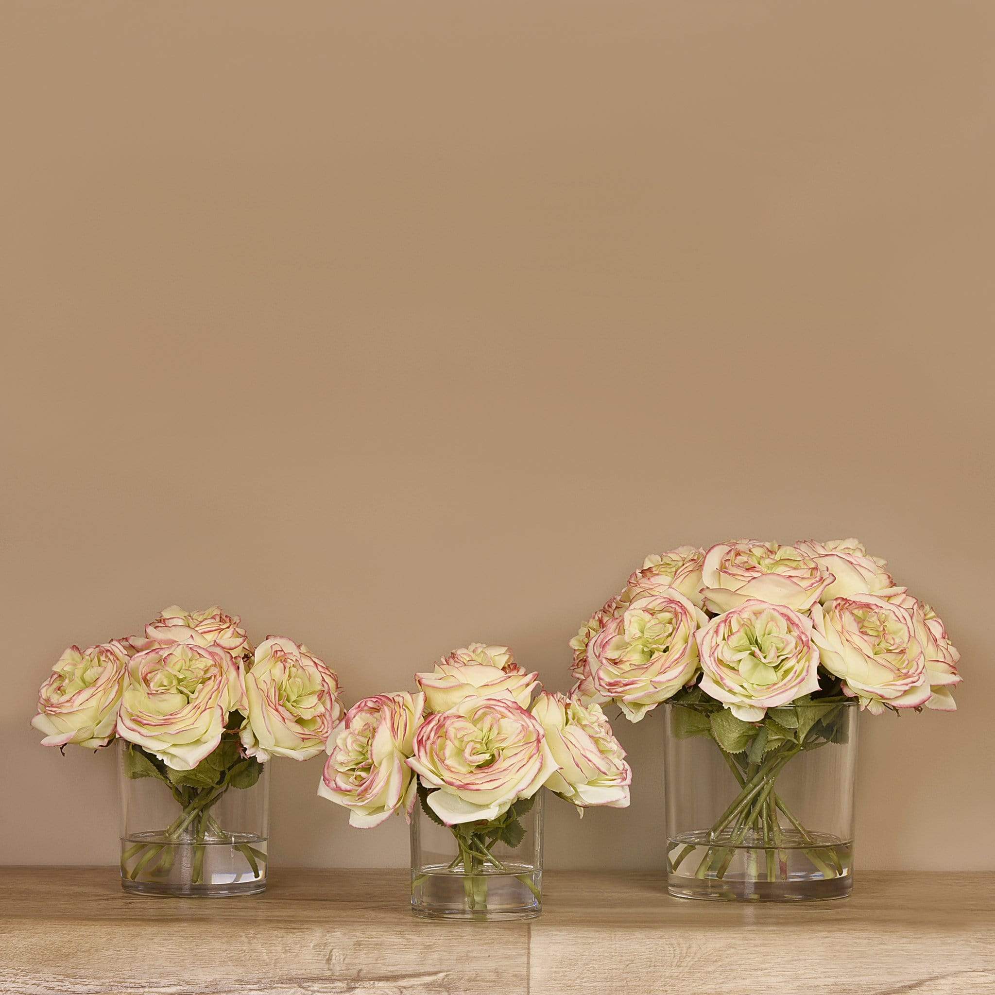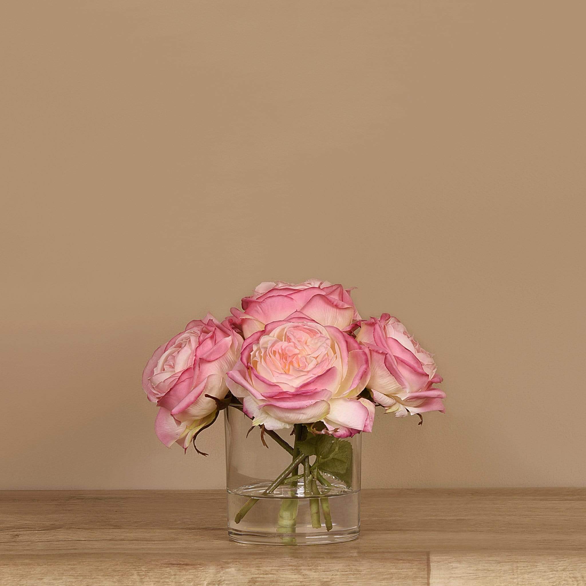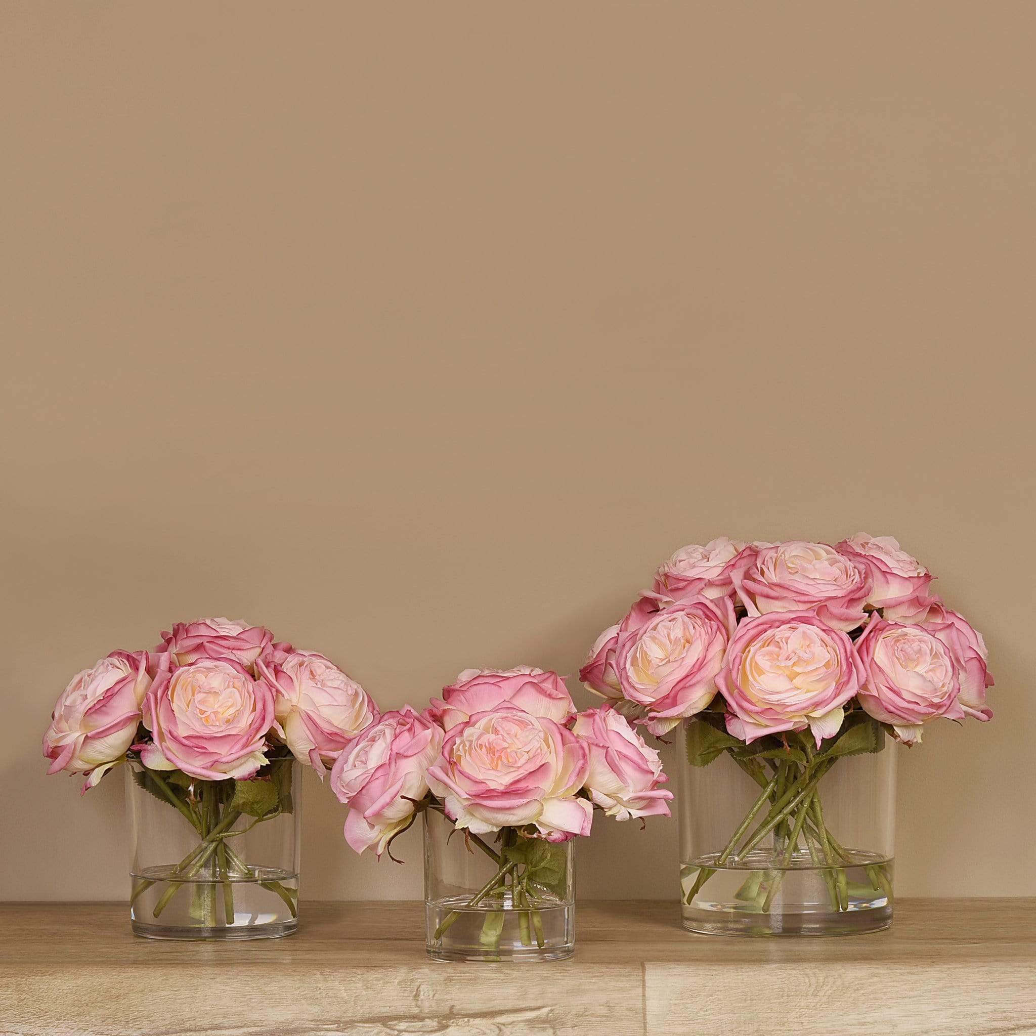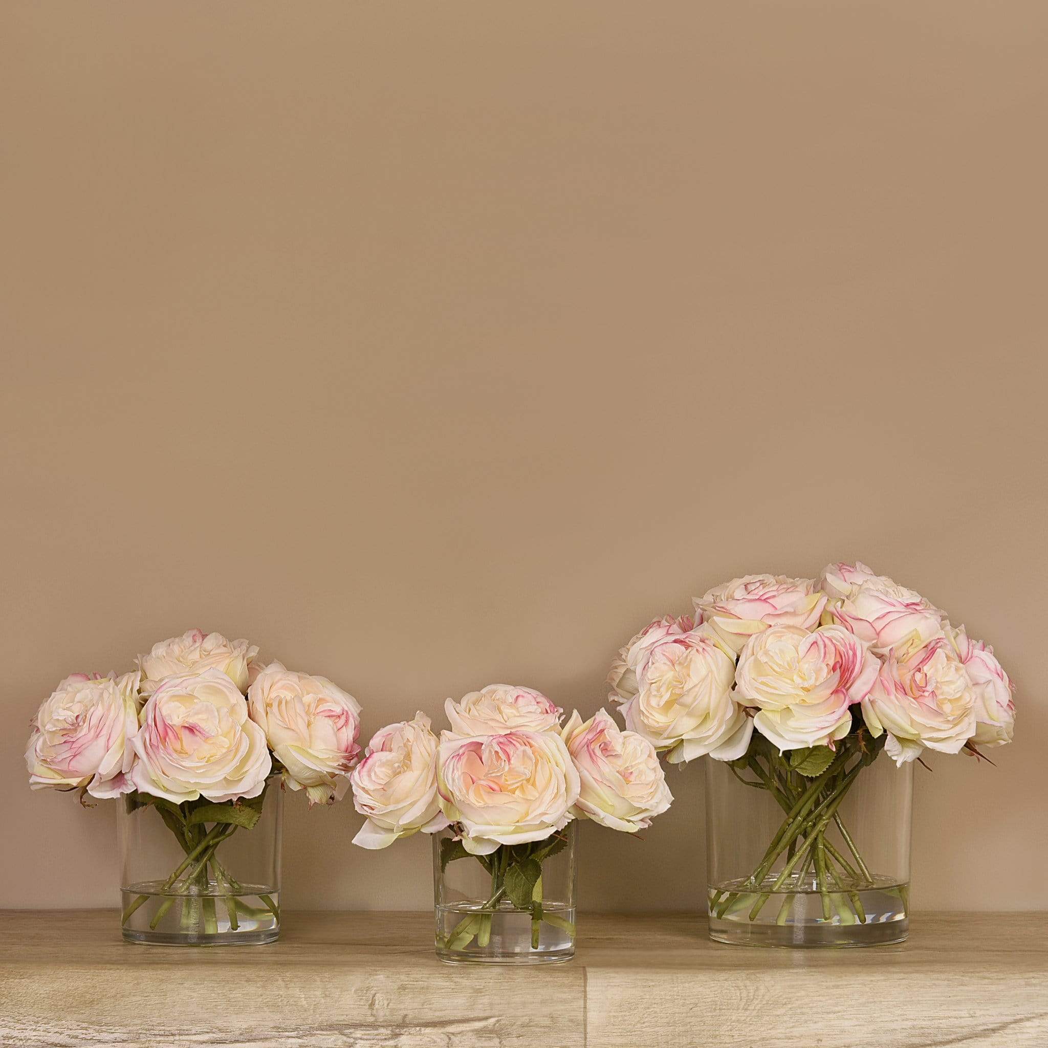 A universal symbol of love and passion, these roses will surely beautify any living space. Their light pink silk petals and green stems look remarkably real set in a delicate glass vase.