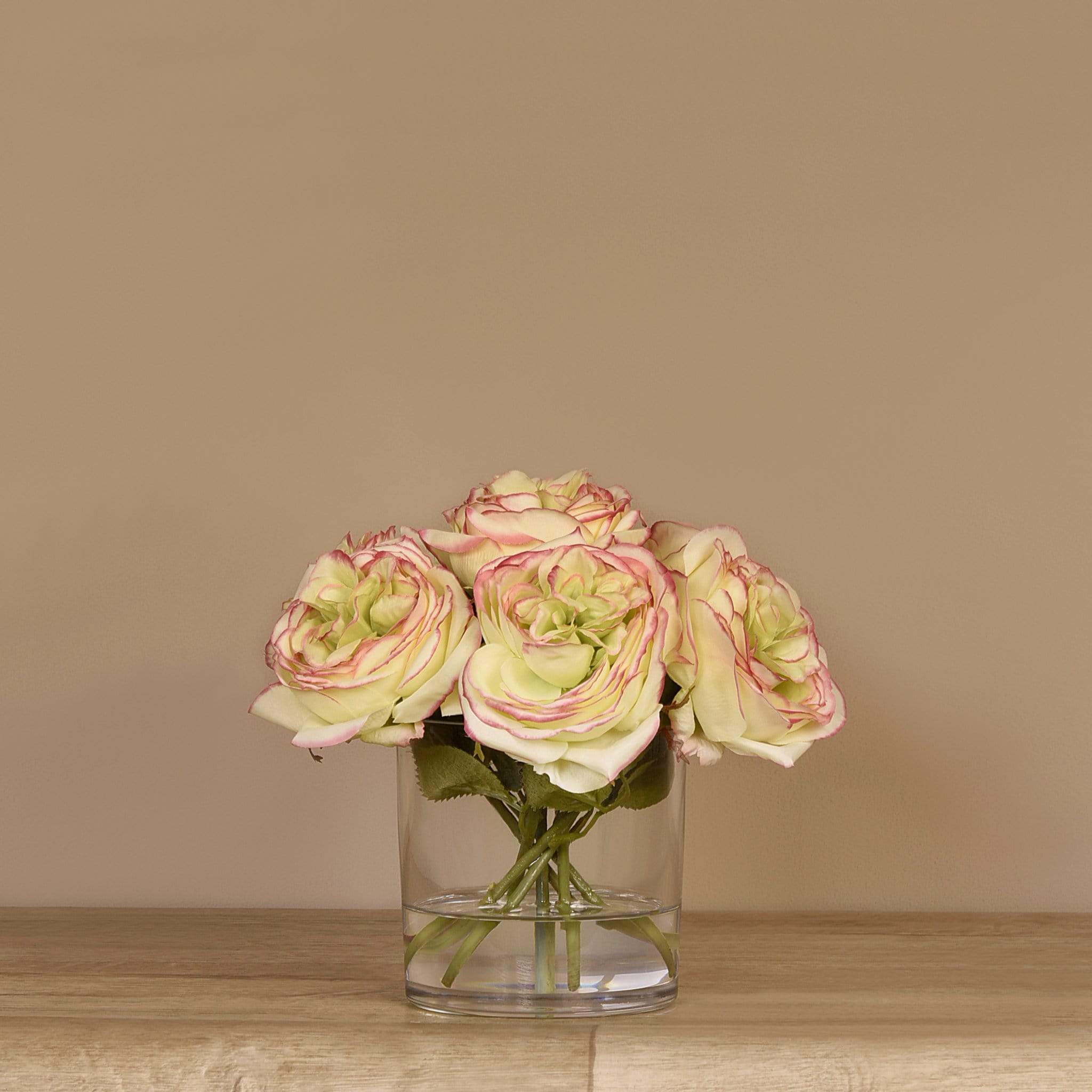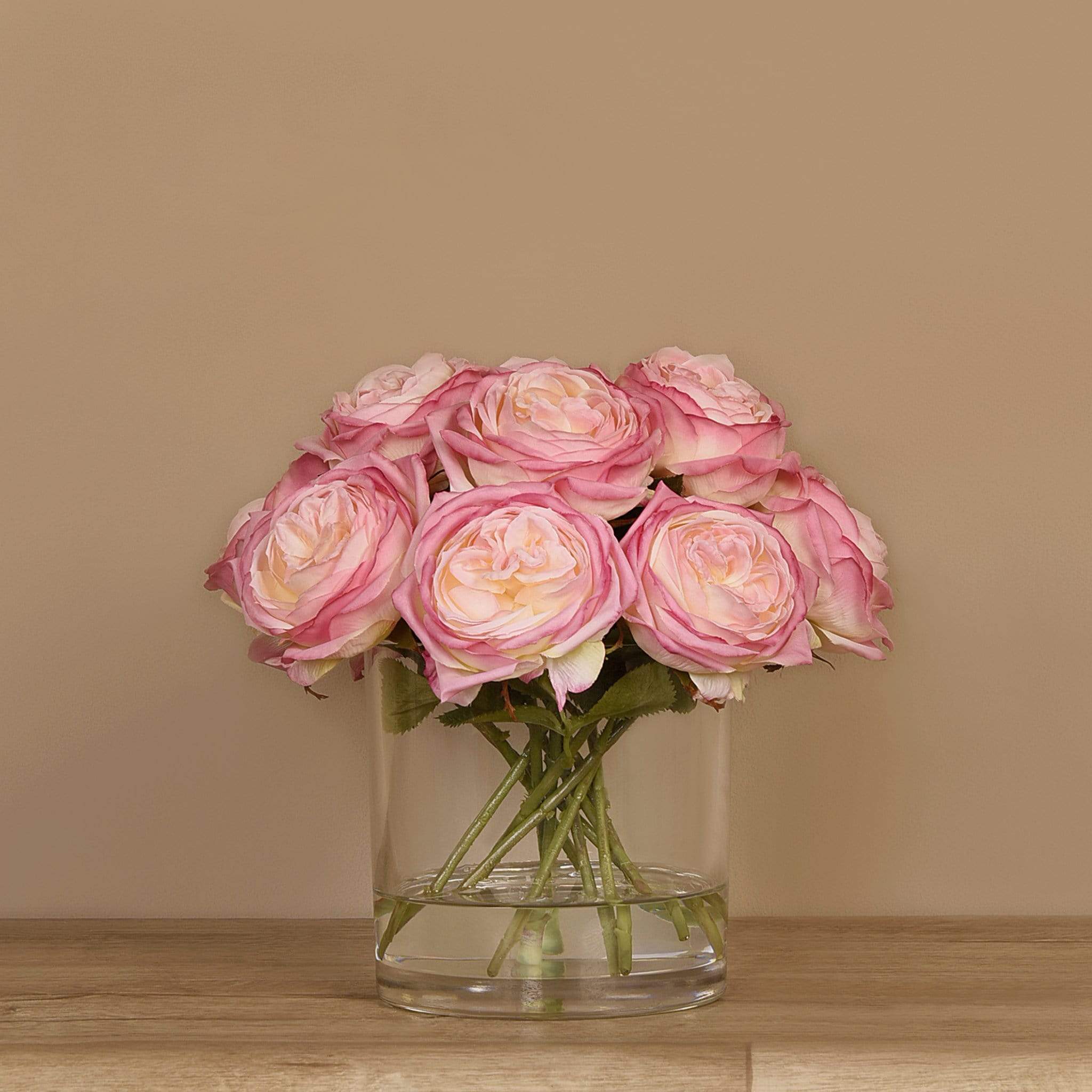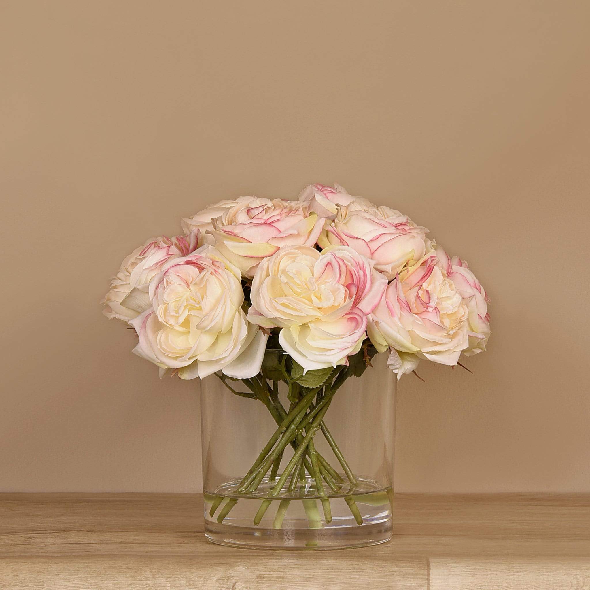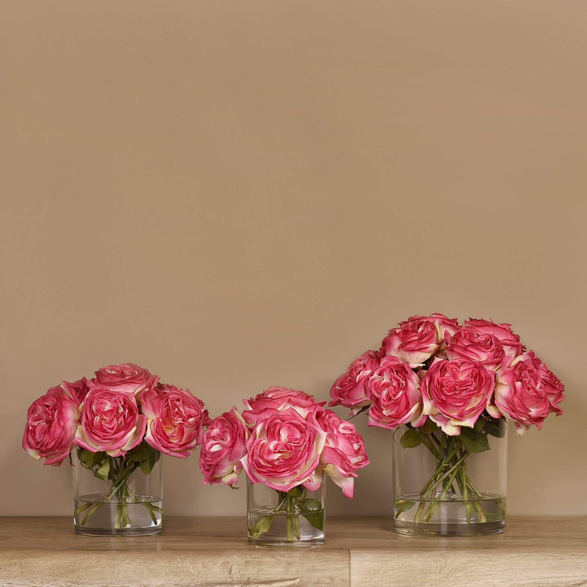 A universal symbol of love and passion, these roses will surely beautify any living space. Their light pink silk petals and green stems look remarkably real set in a delicate glass vase.