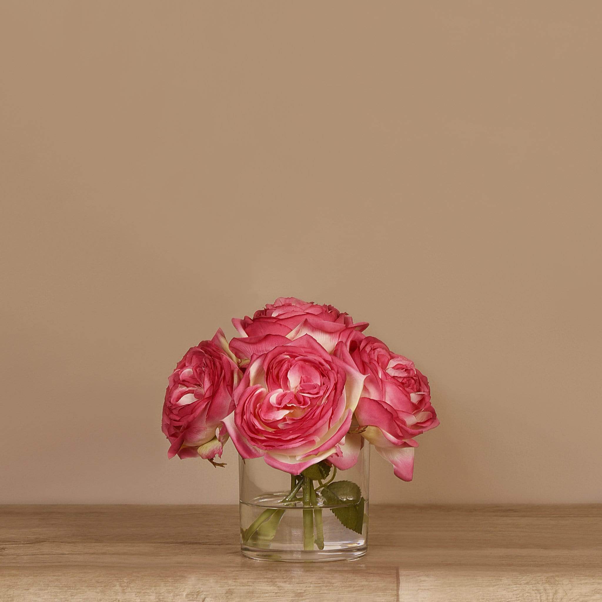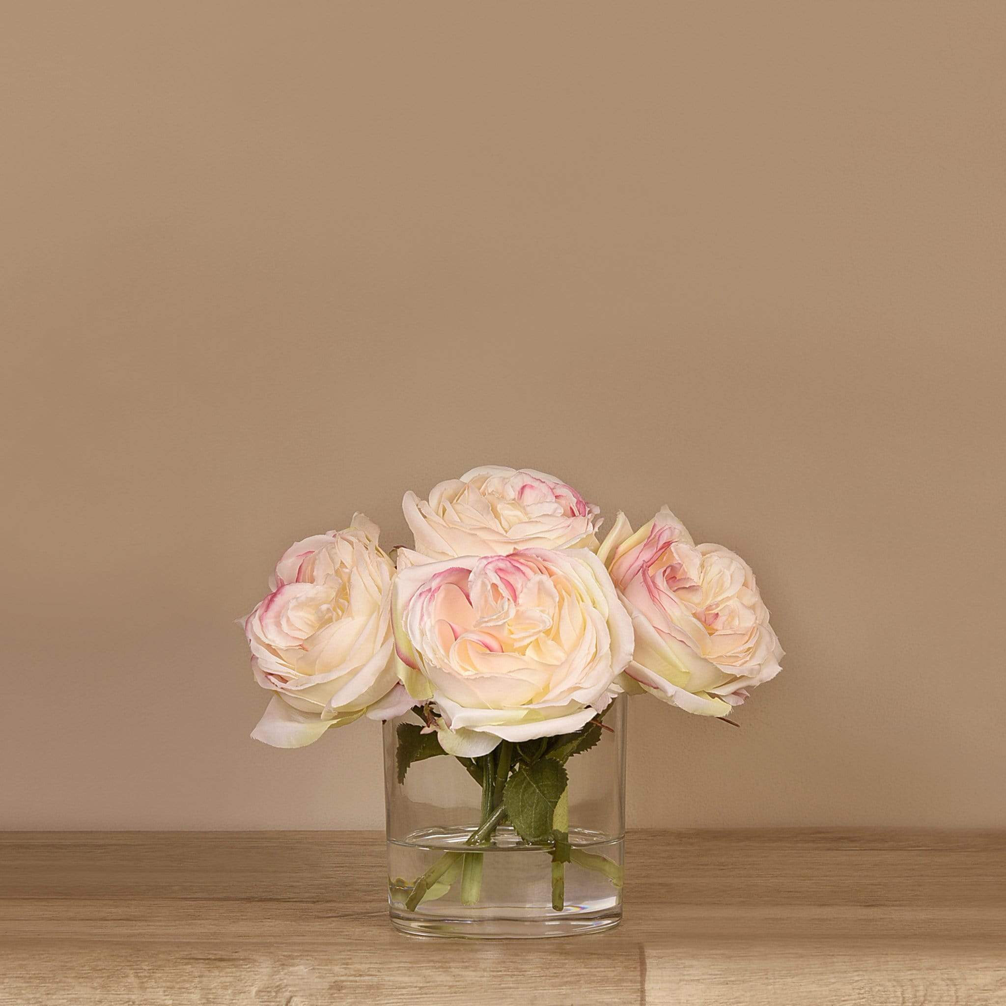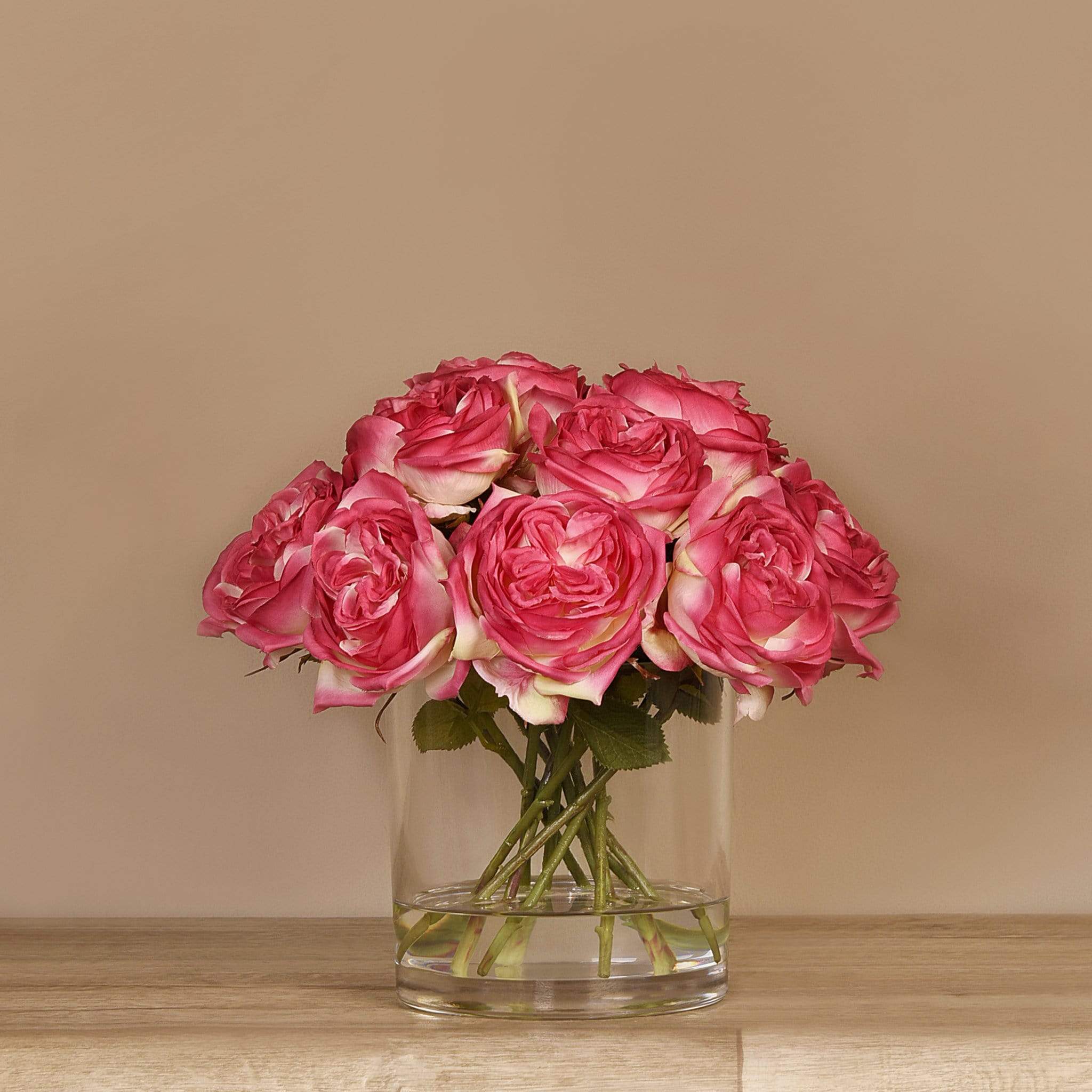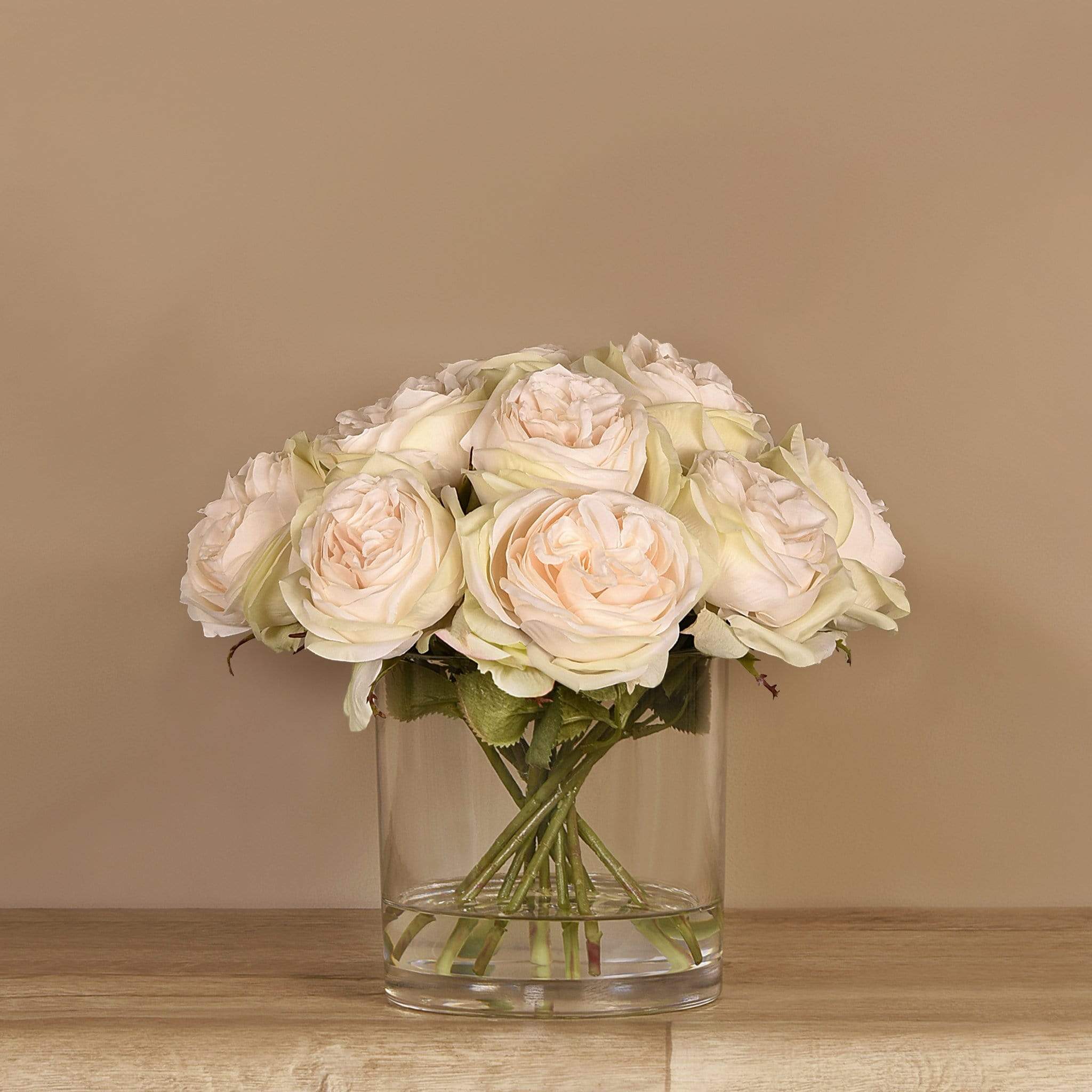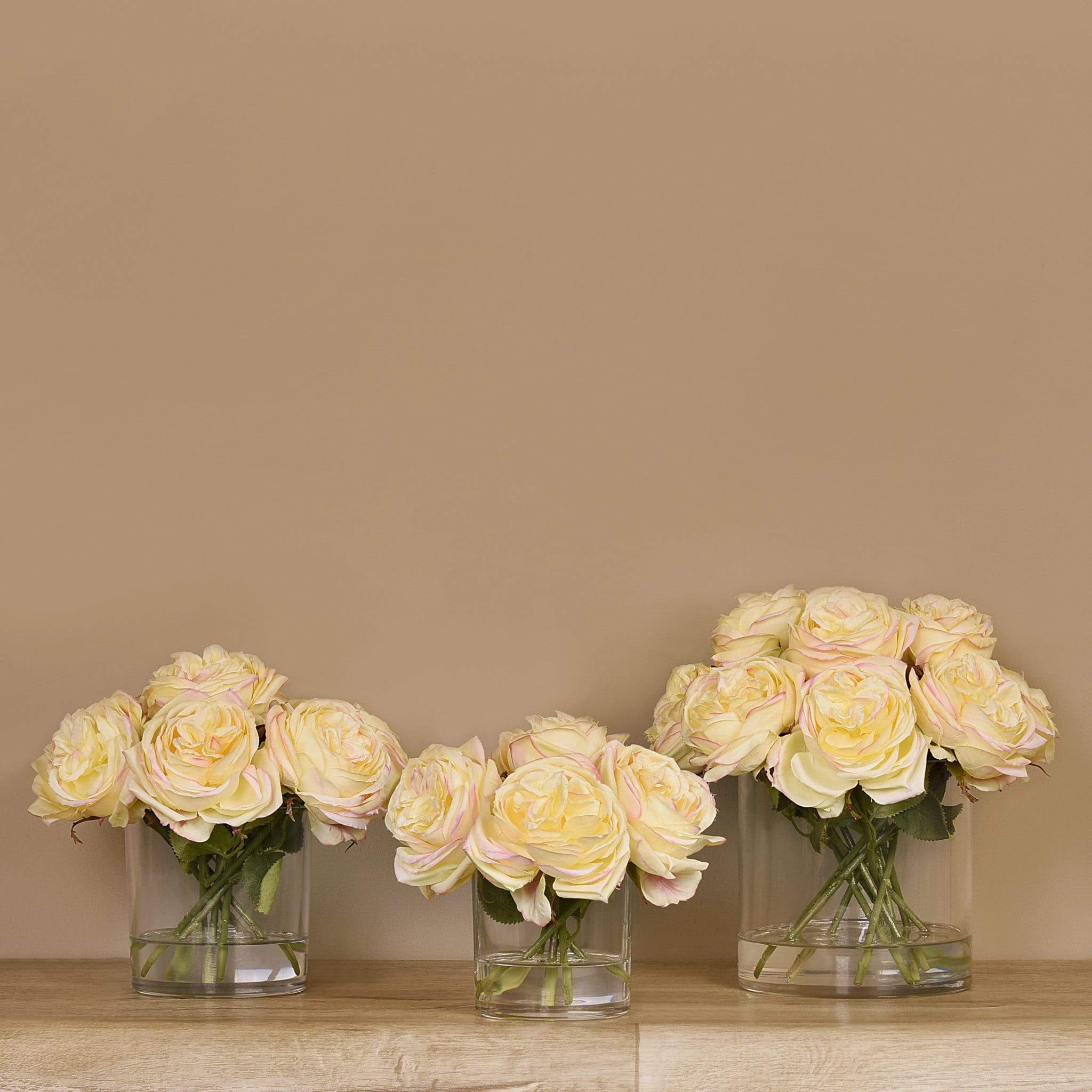 A universal symbol of love and passion, these roses will surely beautify any living space. Their light pink silk petals and green stems look remarkably real set in a delicate glass vase.