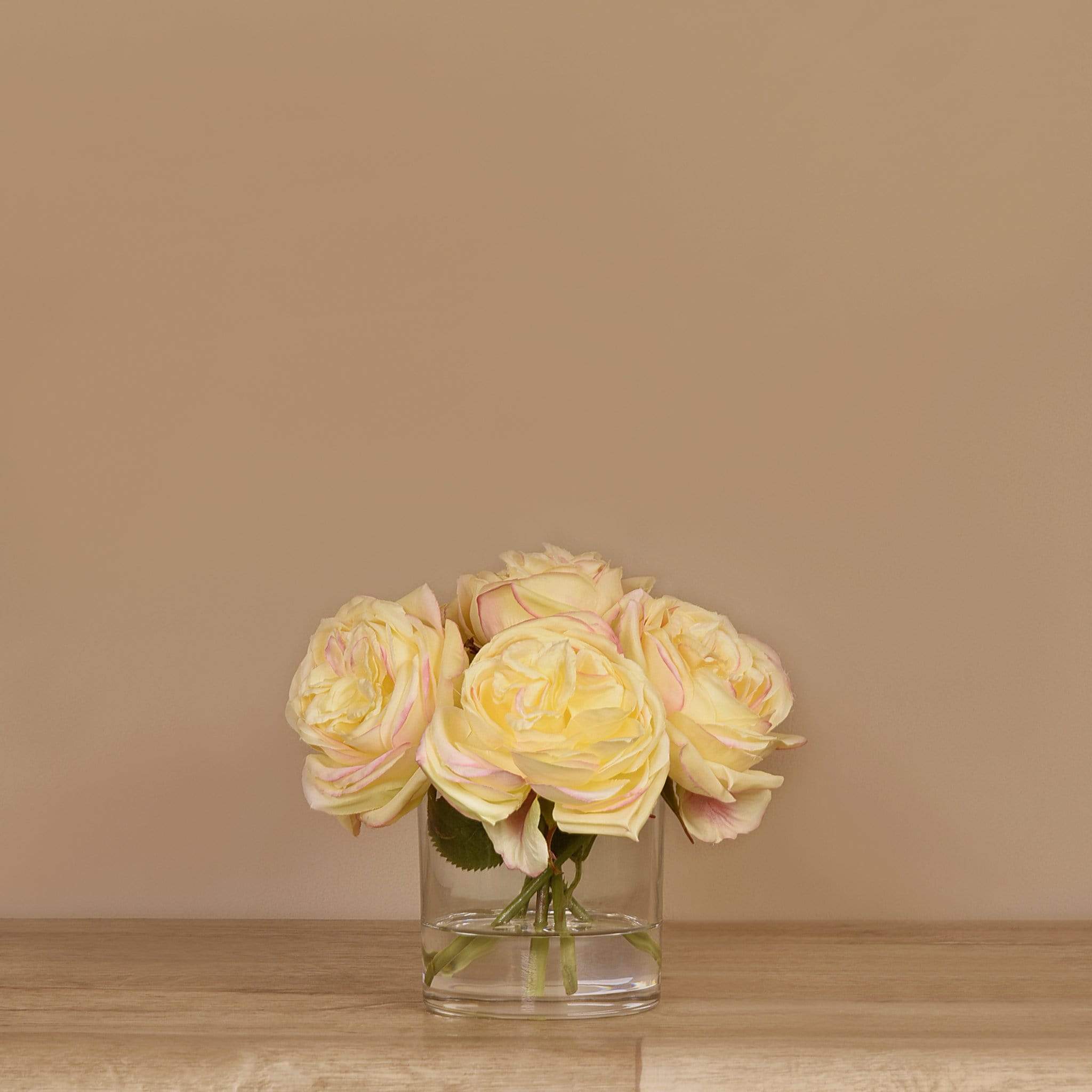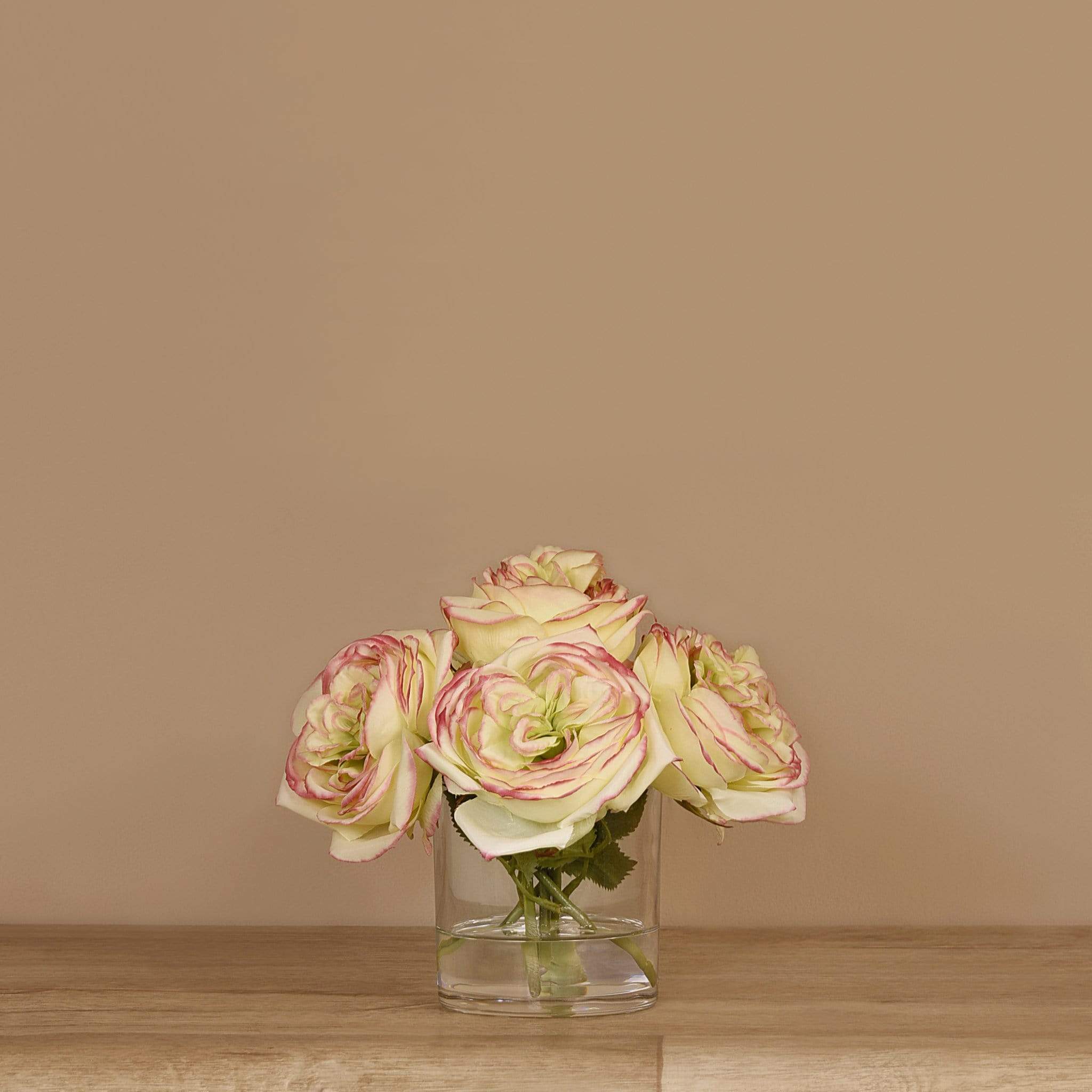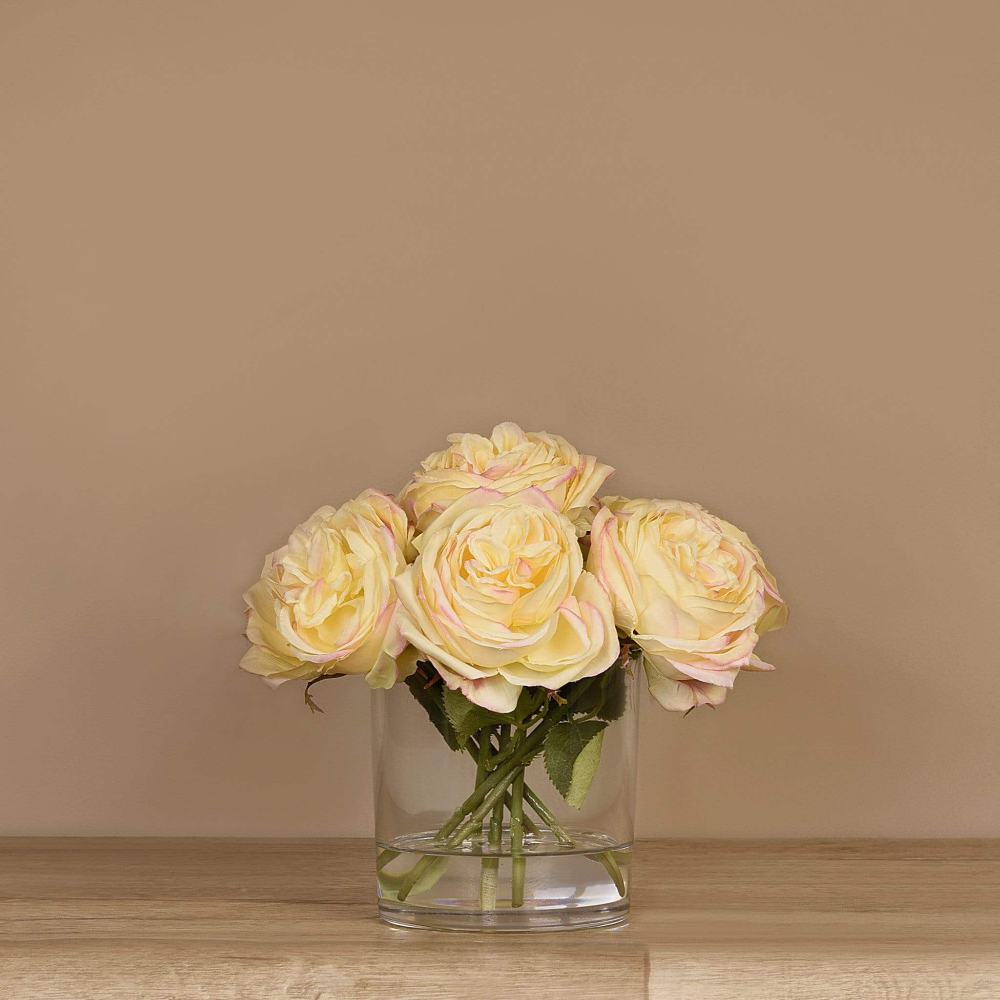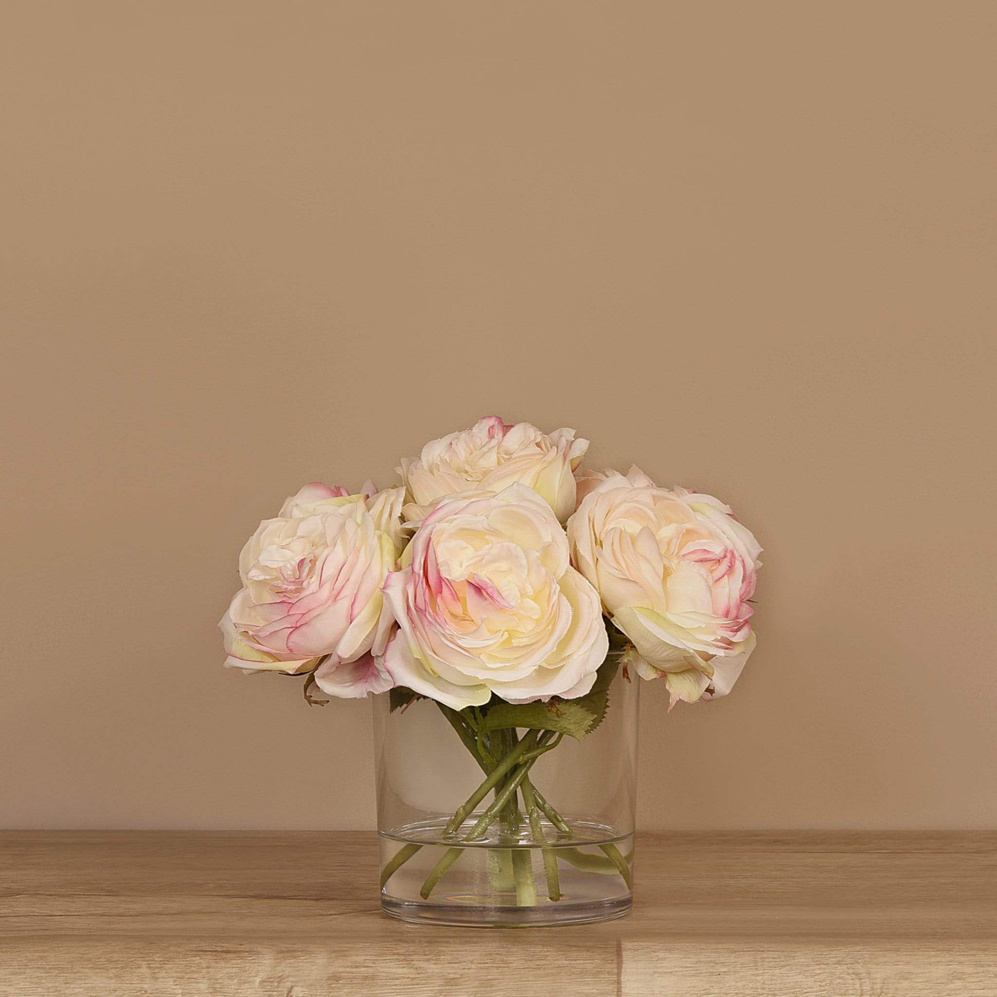A universal symbol of love and passion, these roses will surely beautify any living space. Their light pink silk petals and green stems look remarkably real set in a delicate glass vase.