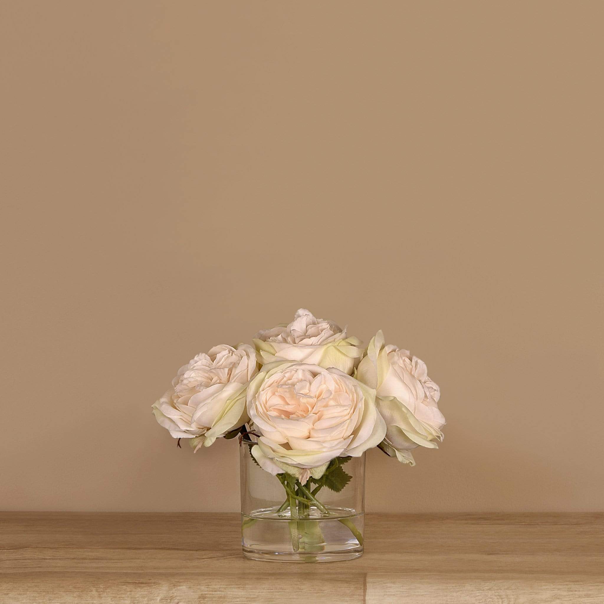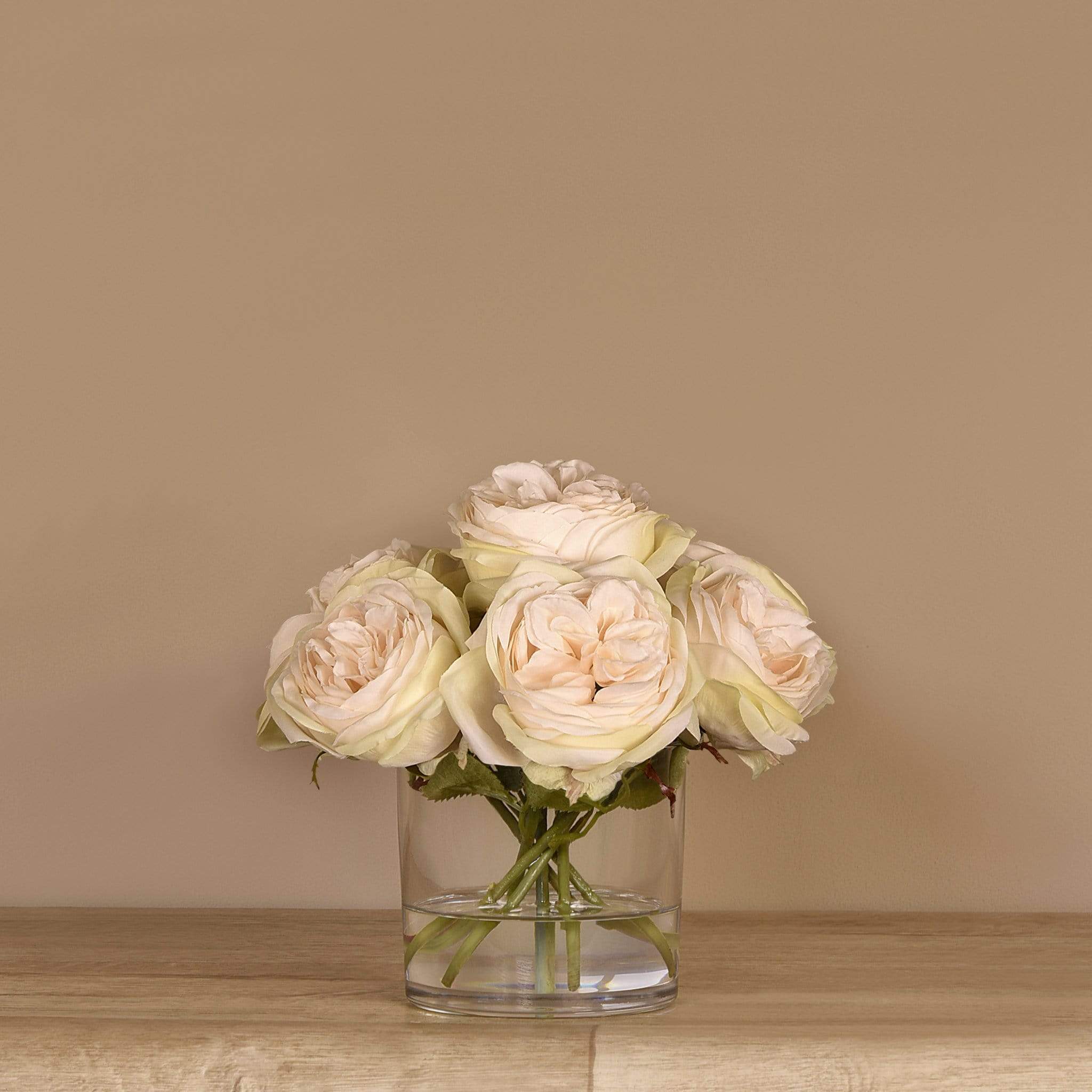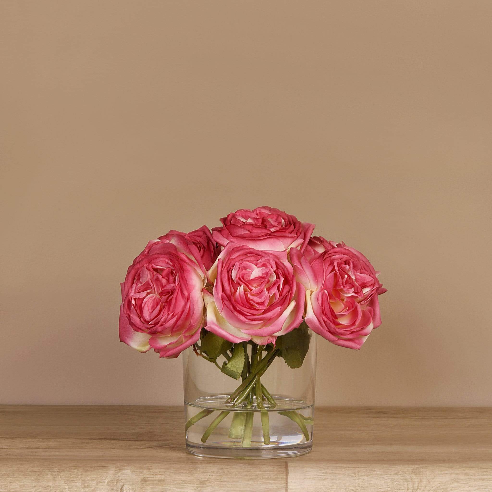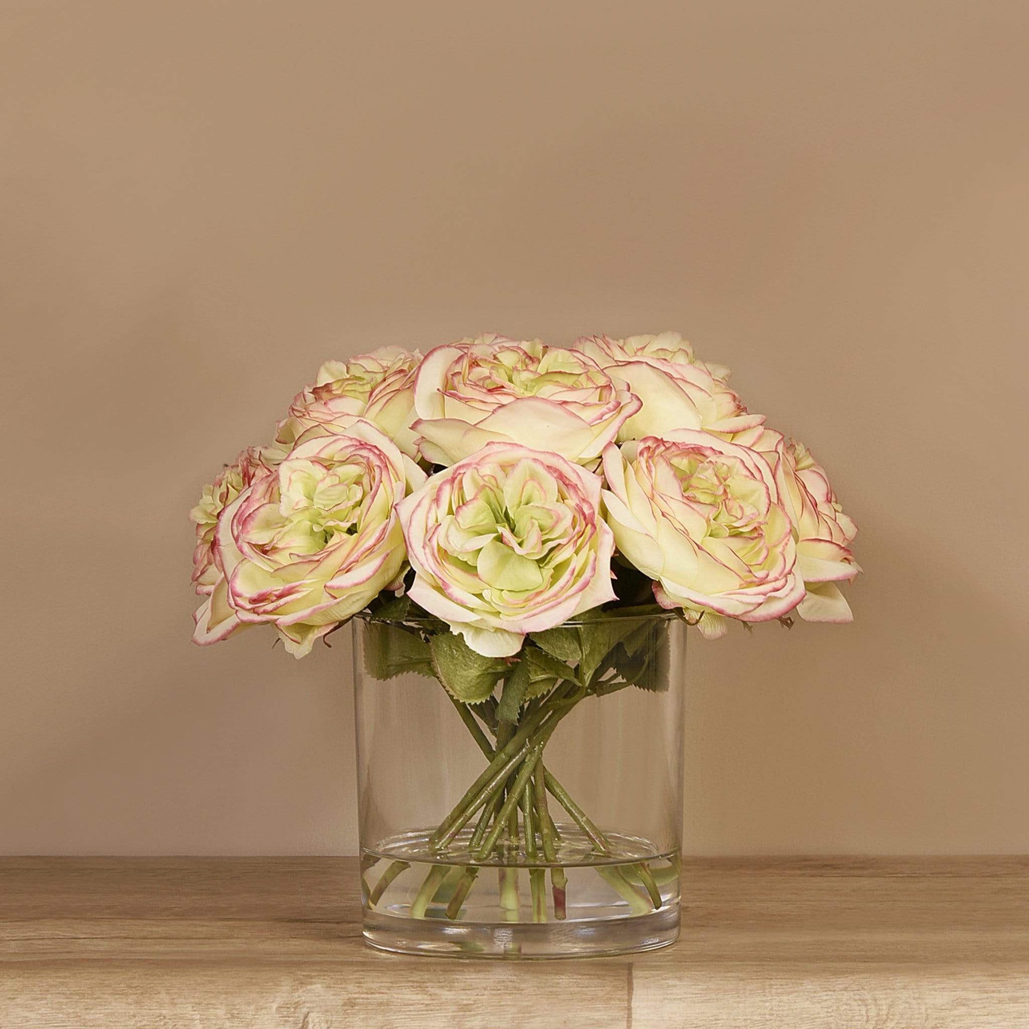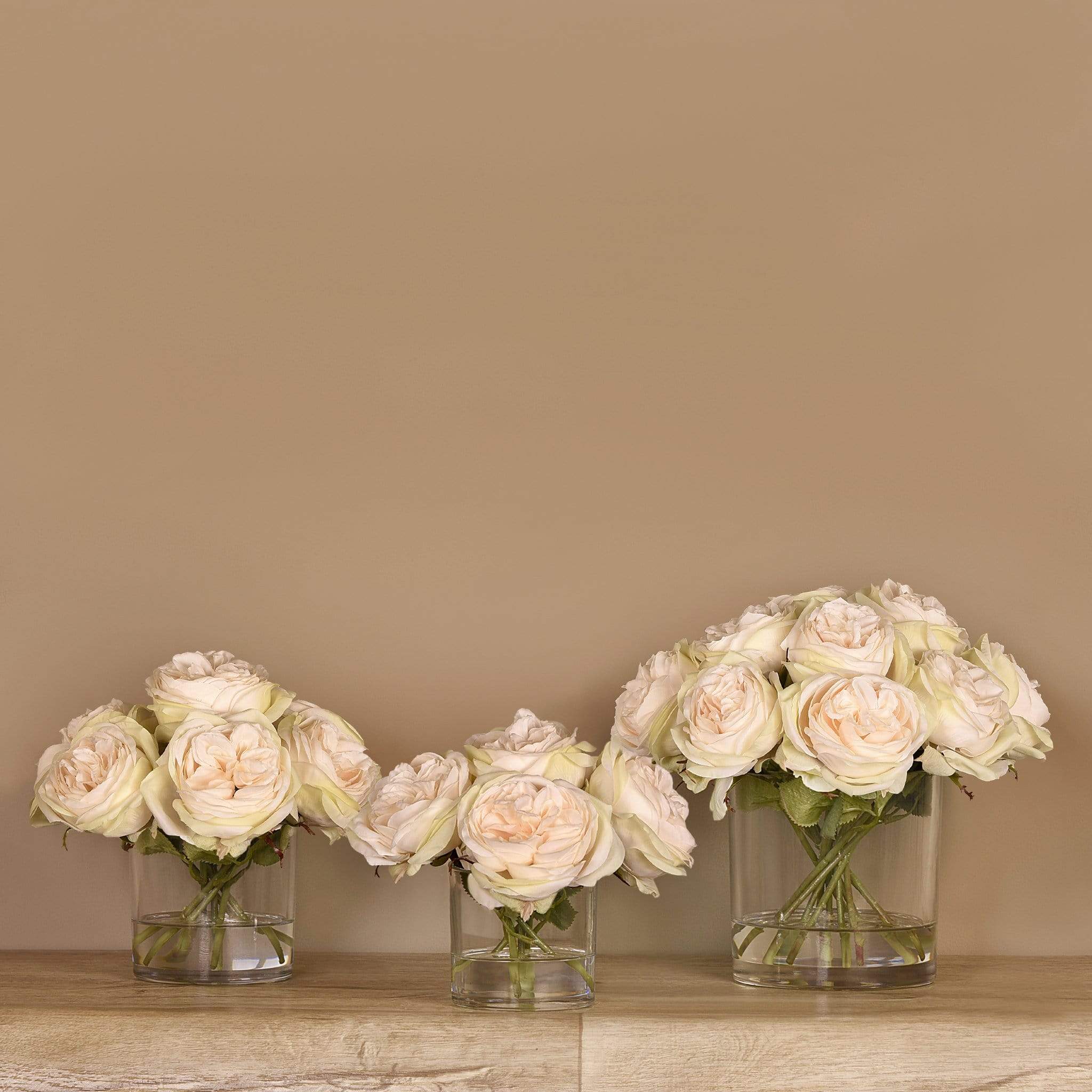 A universal symbol of love and passion, these roses will surely beautify any living space. Their light pink silk petals and green stems look remarkably real set in a delicate glass vase.