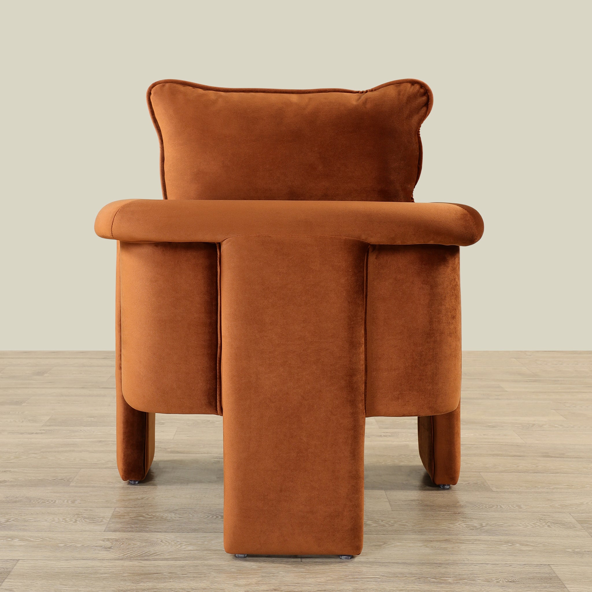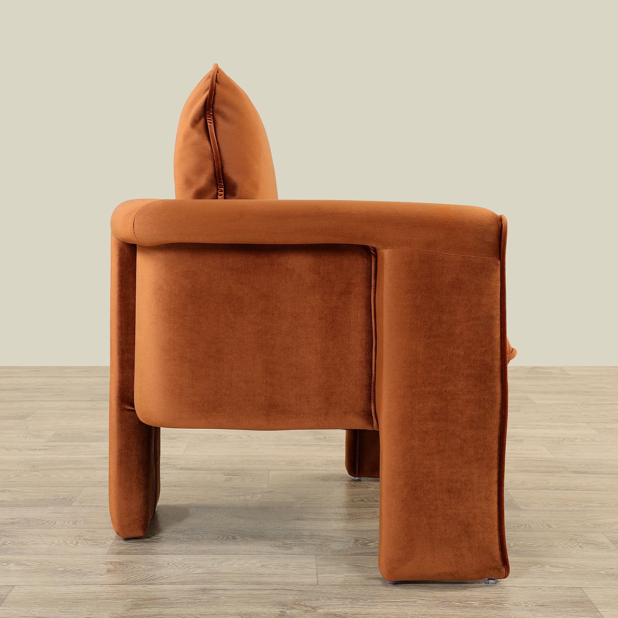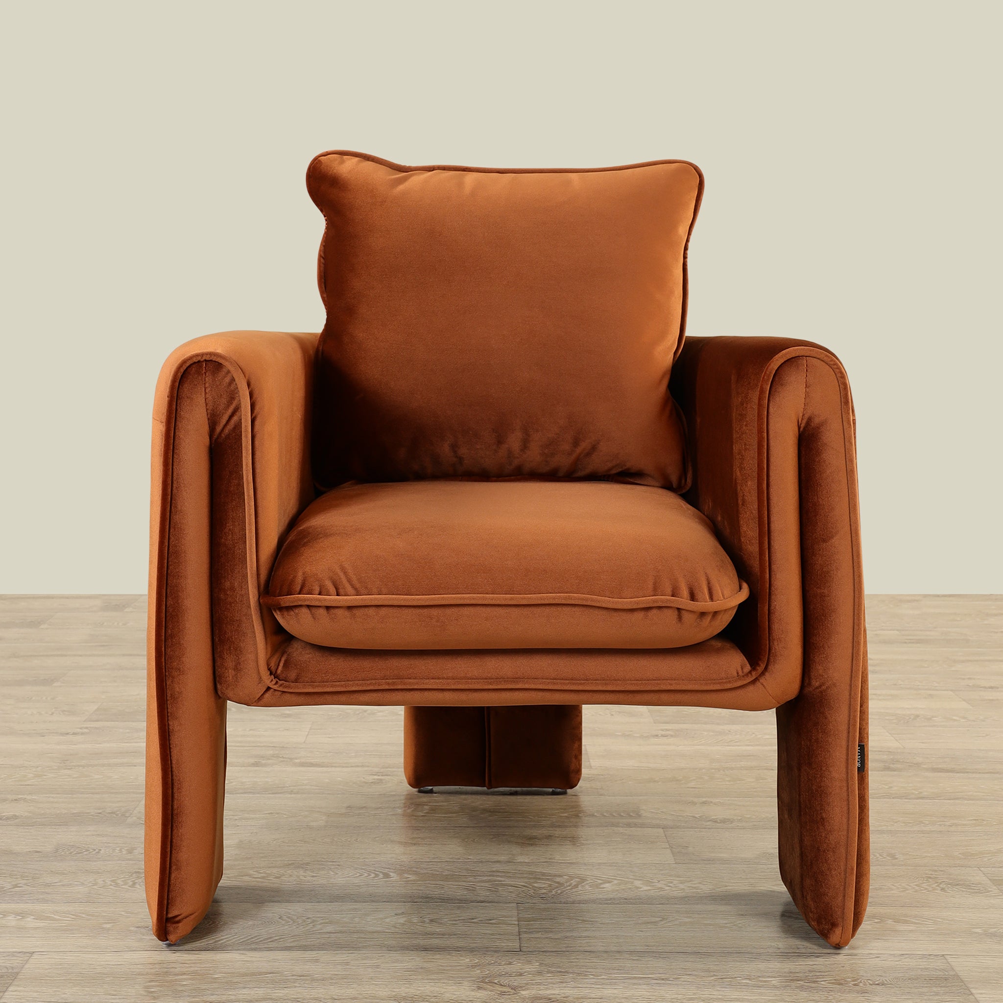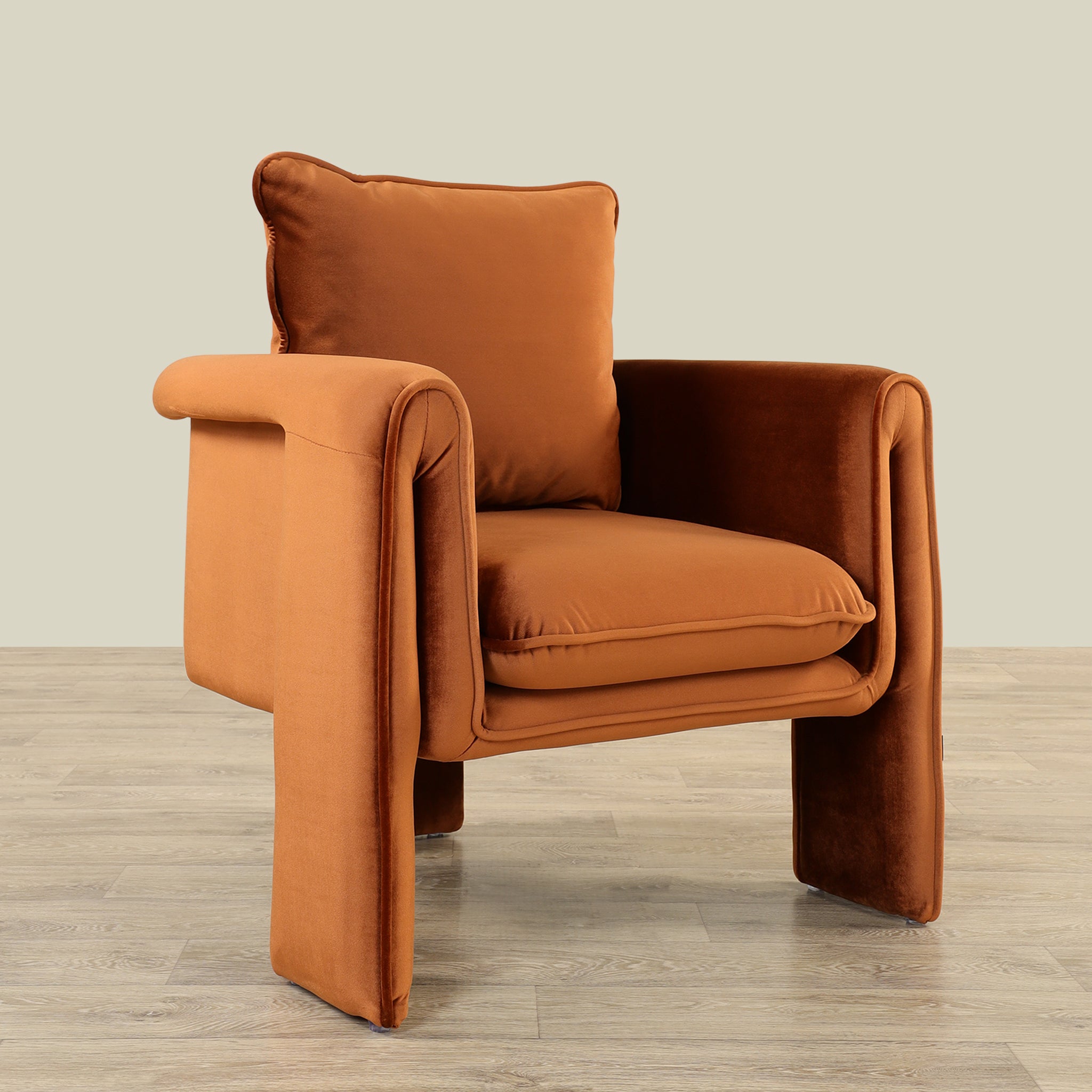 Crafted with a metal frame and molded foam then wrapped in sumptuous velvet fabric, the Rumi Lounge Chair has a warm and sophisticated appeal. It features a generously padded seat and back along with rounded arms for comfort and it is all situated on three wide slat legs for a contemporary touch..
