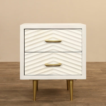 Raised on shining metal legs, this Bedside Table offers space for display and storage. It has sleek lines and a minimalist look as well as two spacious drawers for storage. The textured face and versatile finish are sure to fit into many decorating schemes.