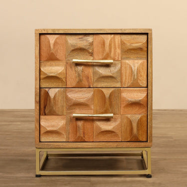 Raised on a shining metal base, this Bedside Table offers space for display and storage. It has sleek lines and a minimalist look as well as two spacious drawers for storage. The textural face and versatile natural finish are sure to fit into many decorating schemes.