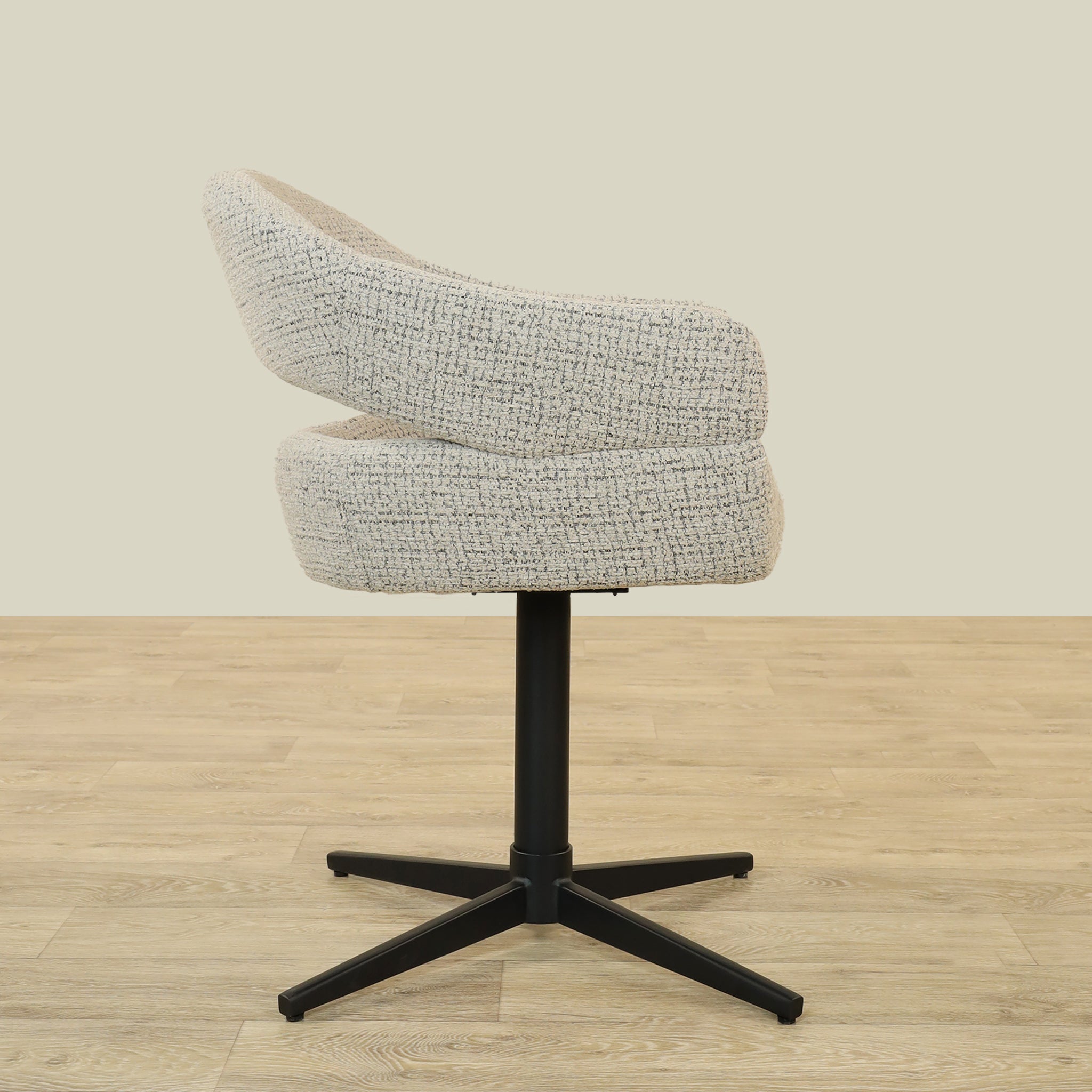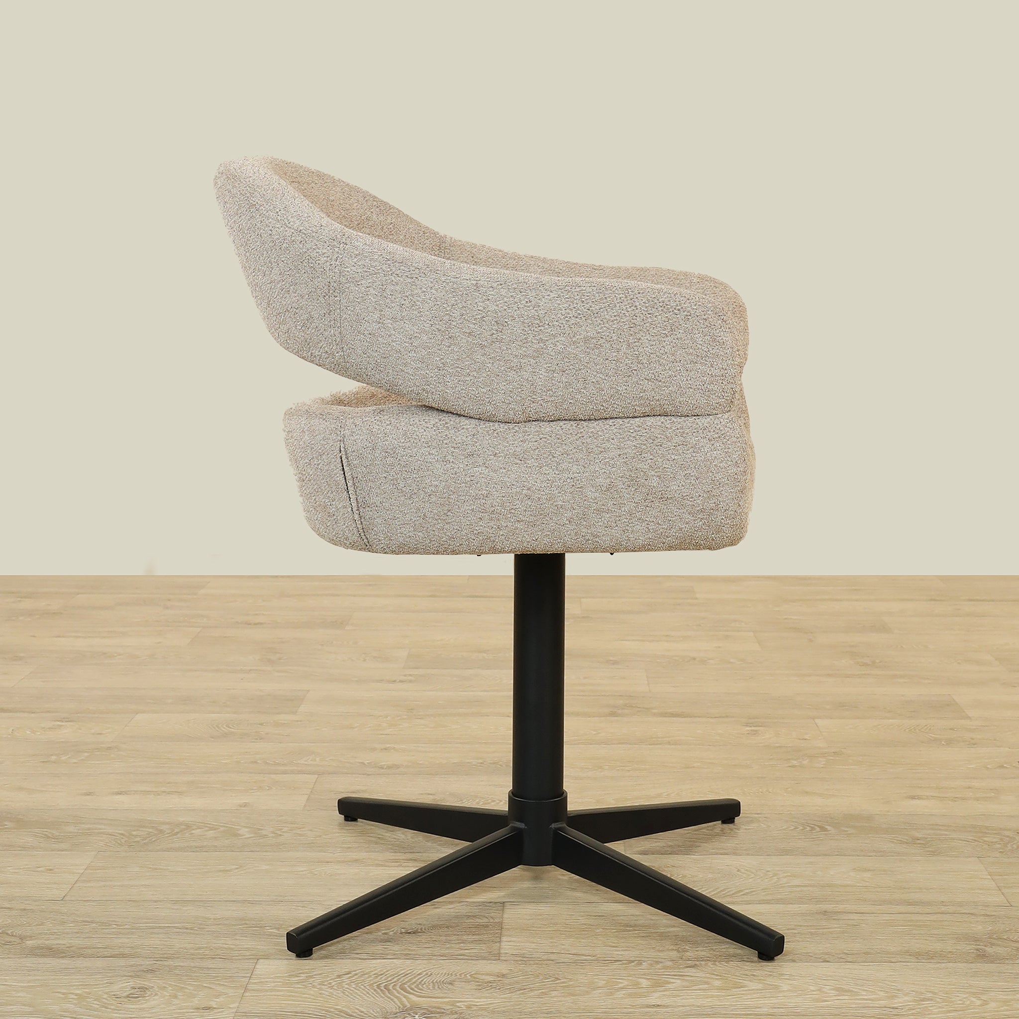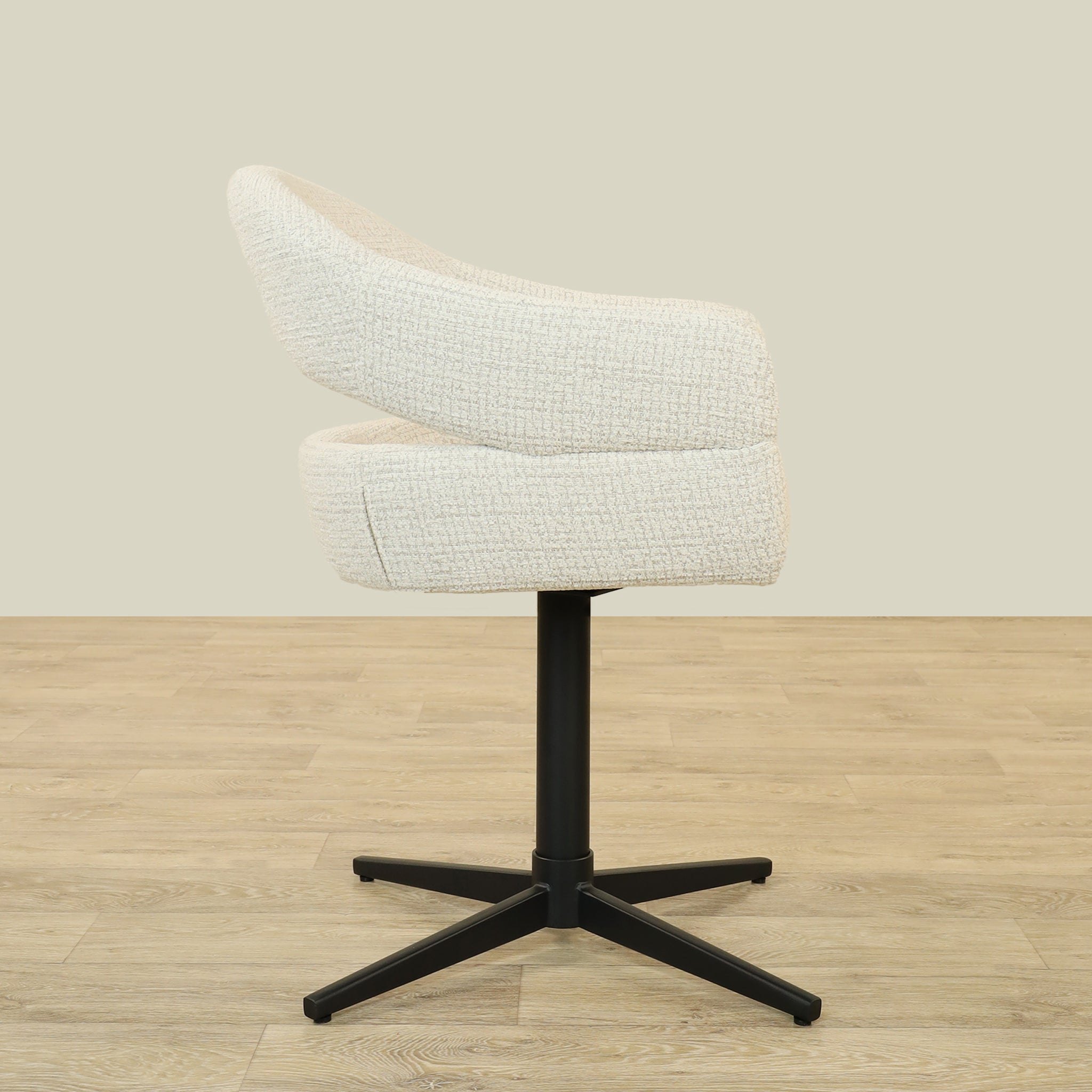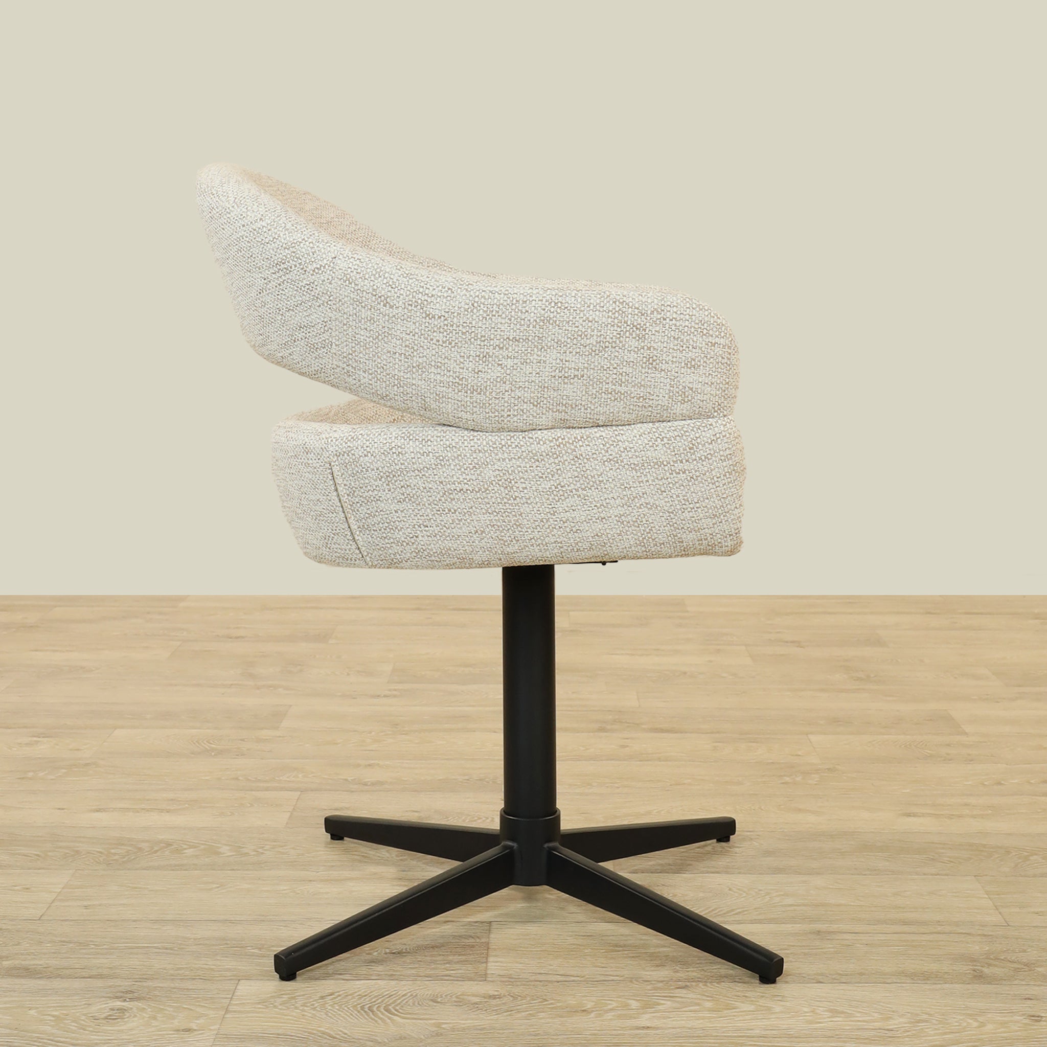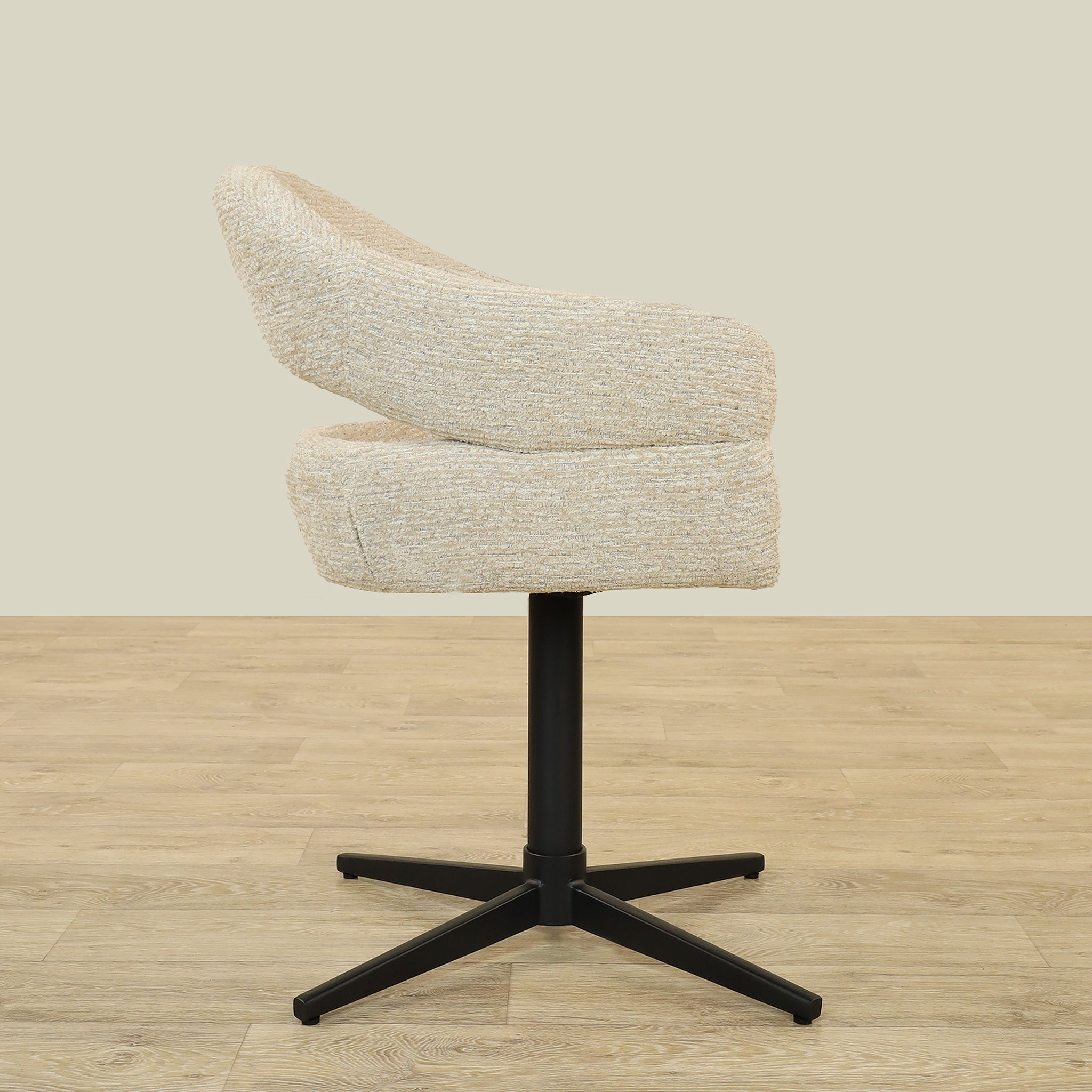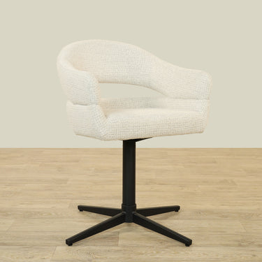 The Vega Dining Chair combines sleek plywood craftsmanship with soft fabric upholstery and a sturdy metal base, offering both elegance and durability.
