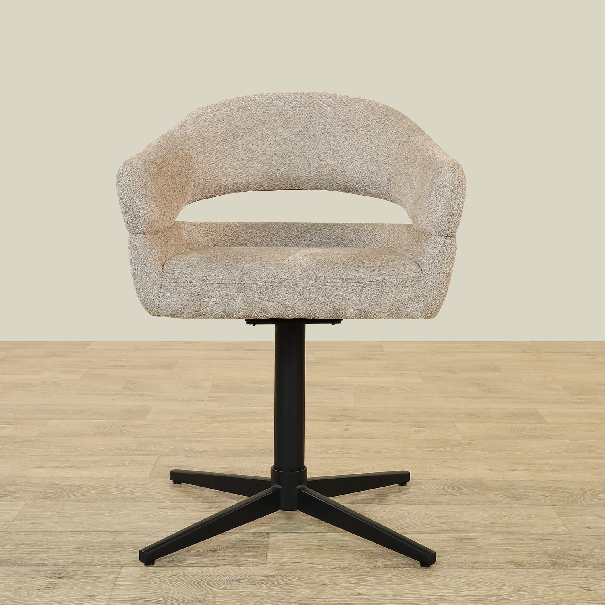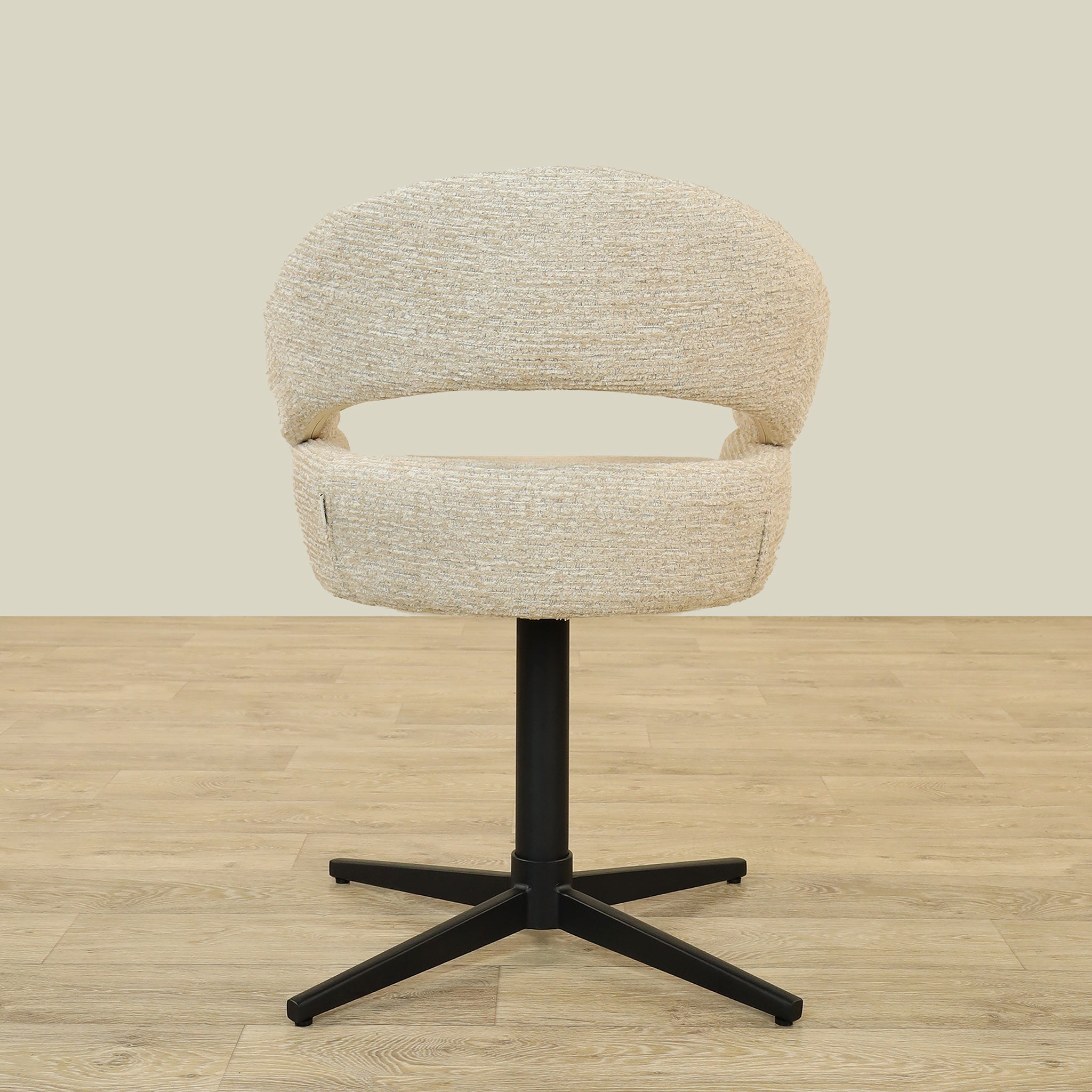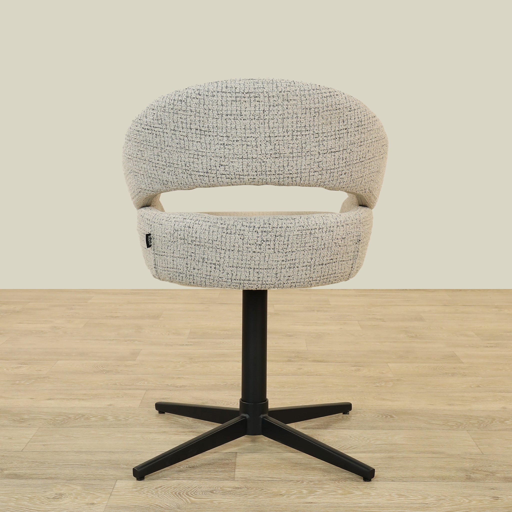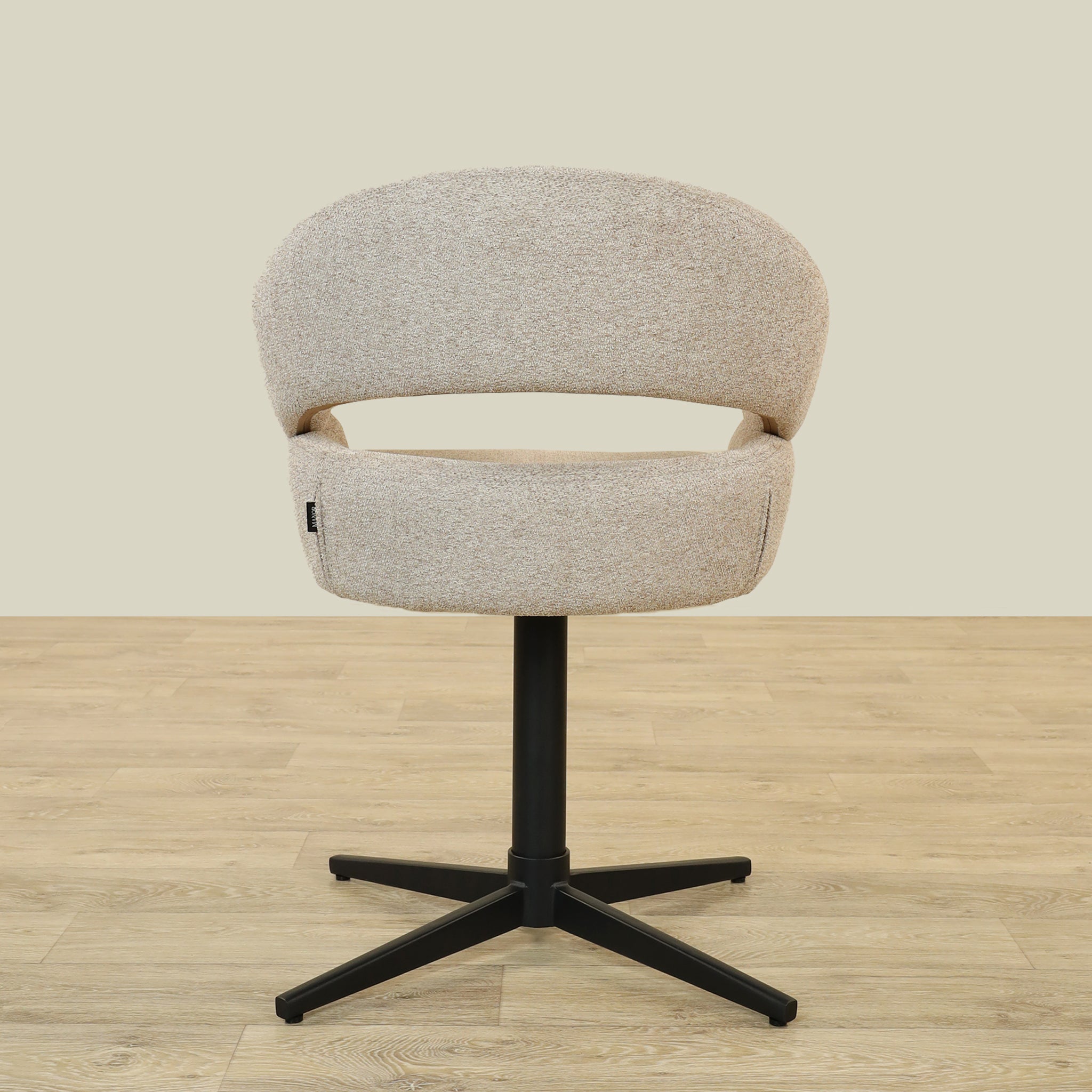 The Vega Dining Chair combines sleek plywood craftsmanship with soft fabric upholstery and a sturdy metal base, offering both elegance and durability.