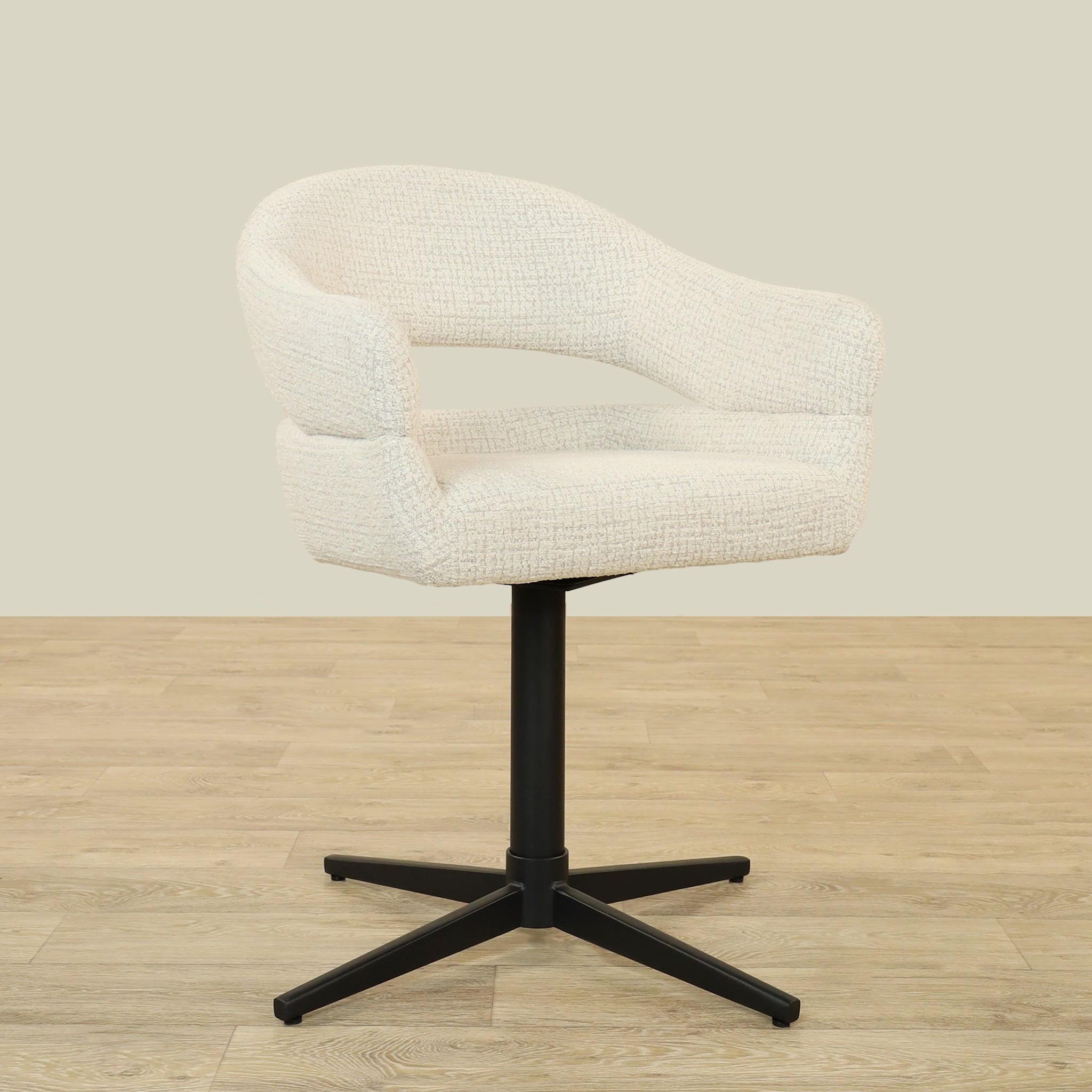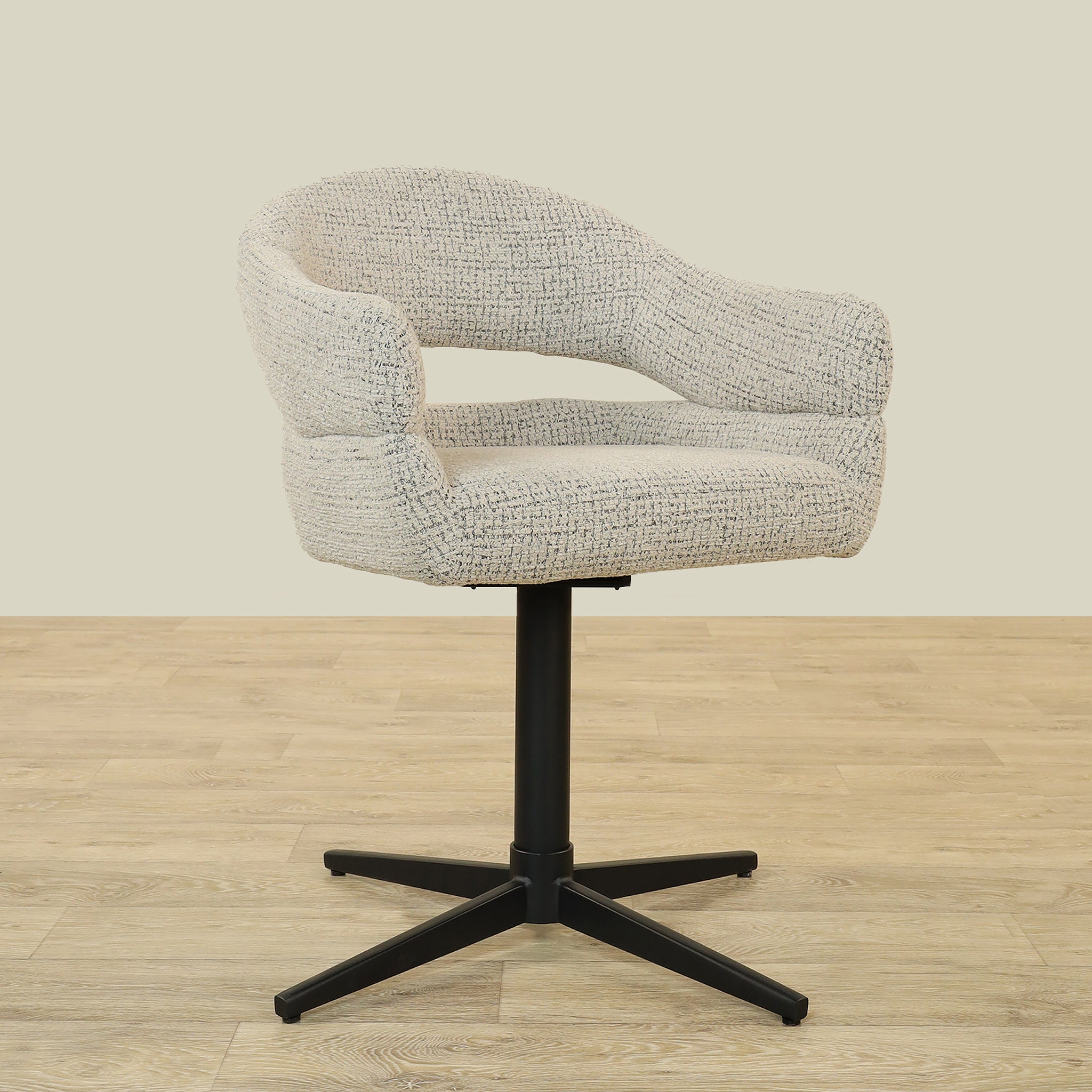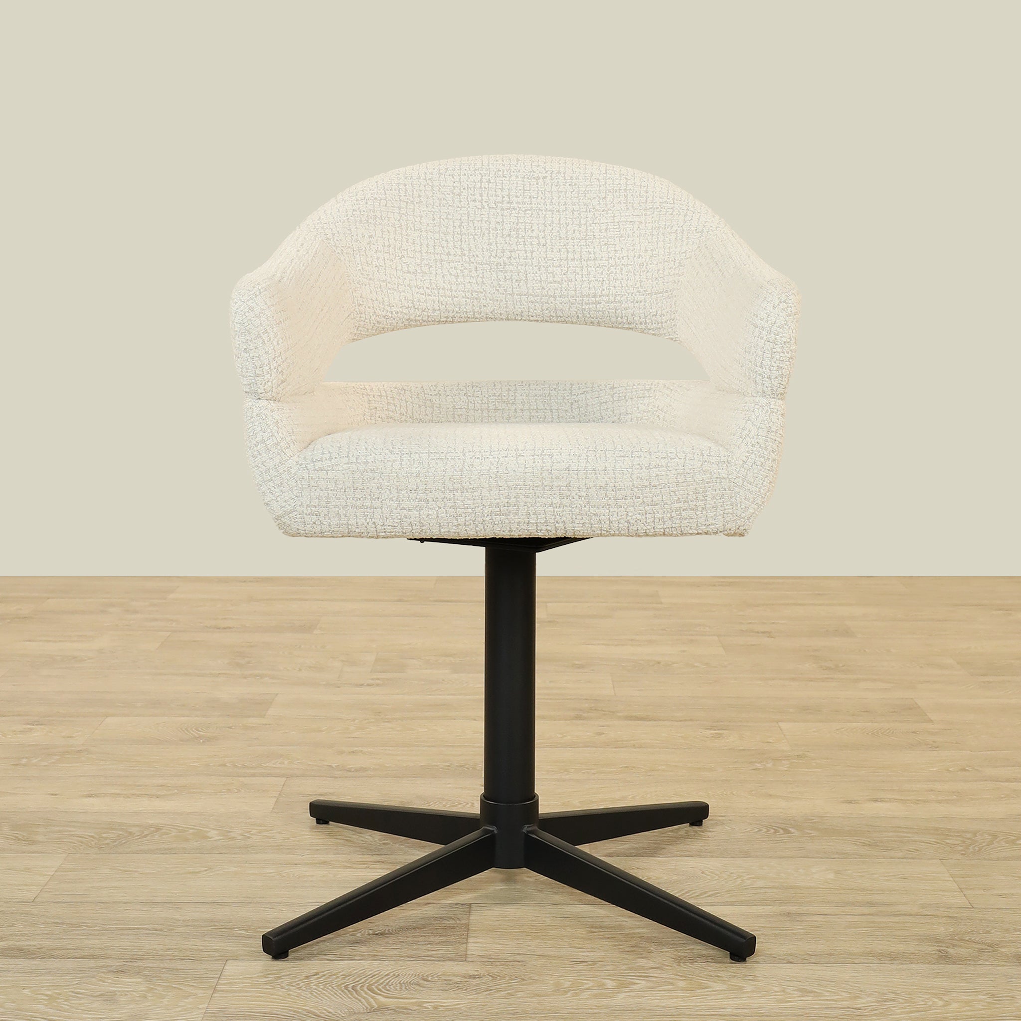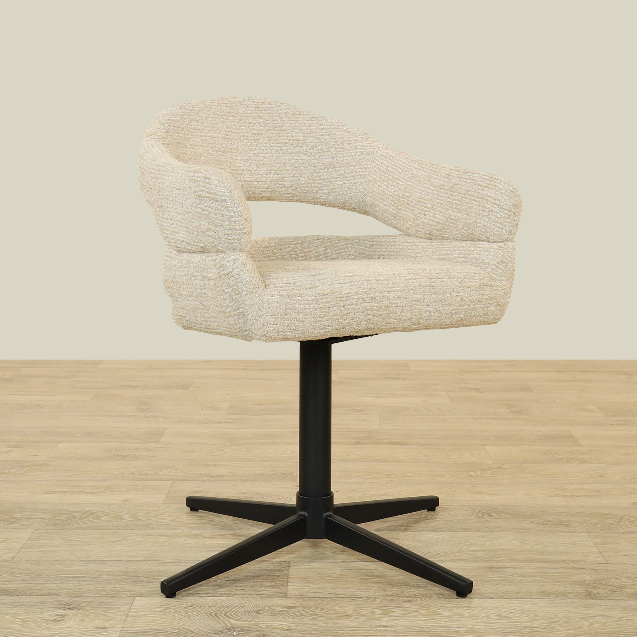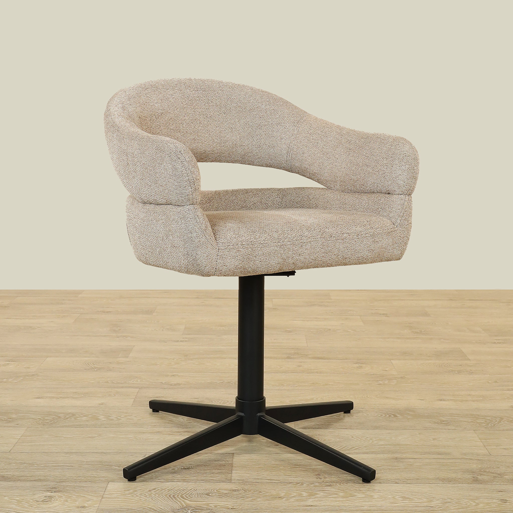The Vega Dining Chair combines sleek plywood craftsmanship with soft fabric upholstery and a sturdy metal base, offering both elegance and durability.