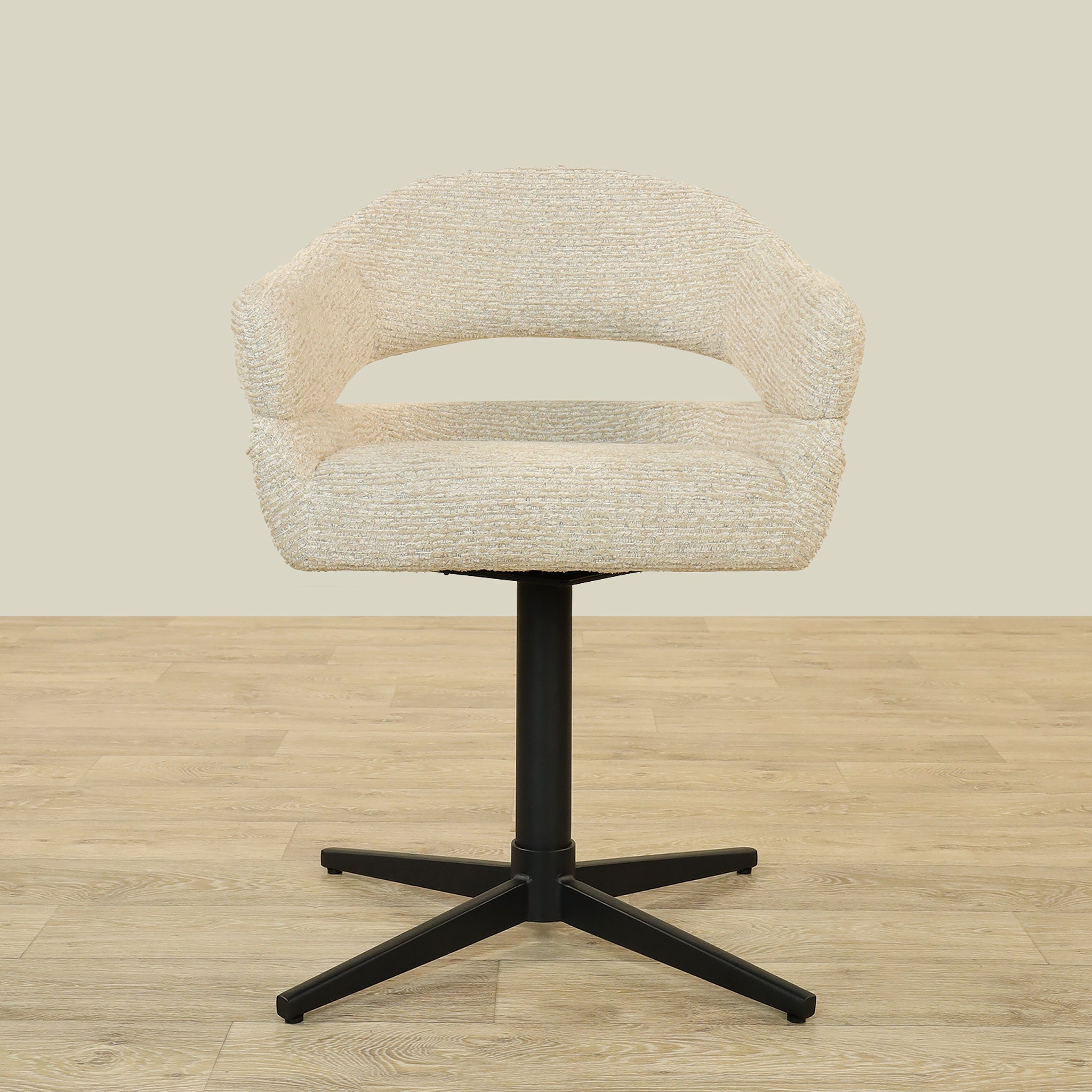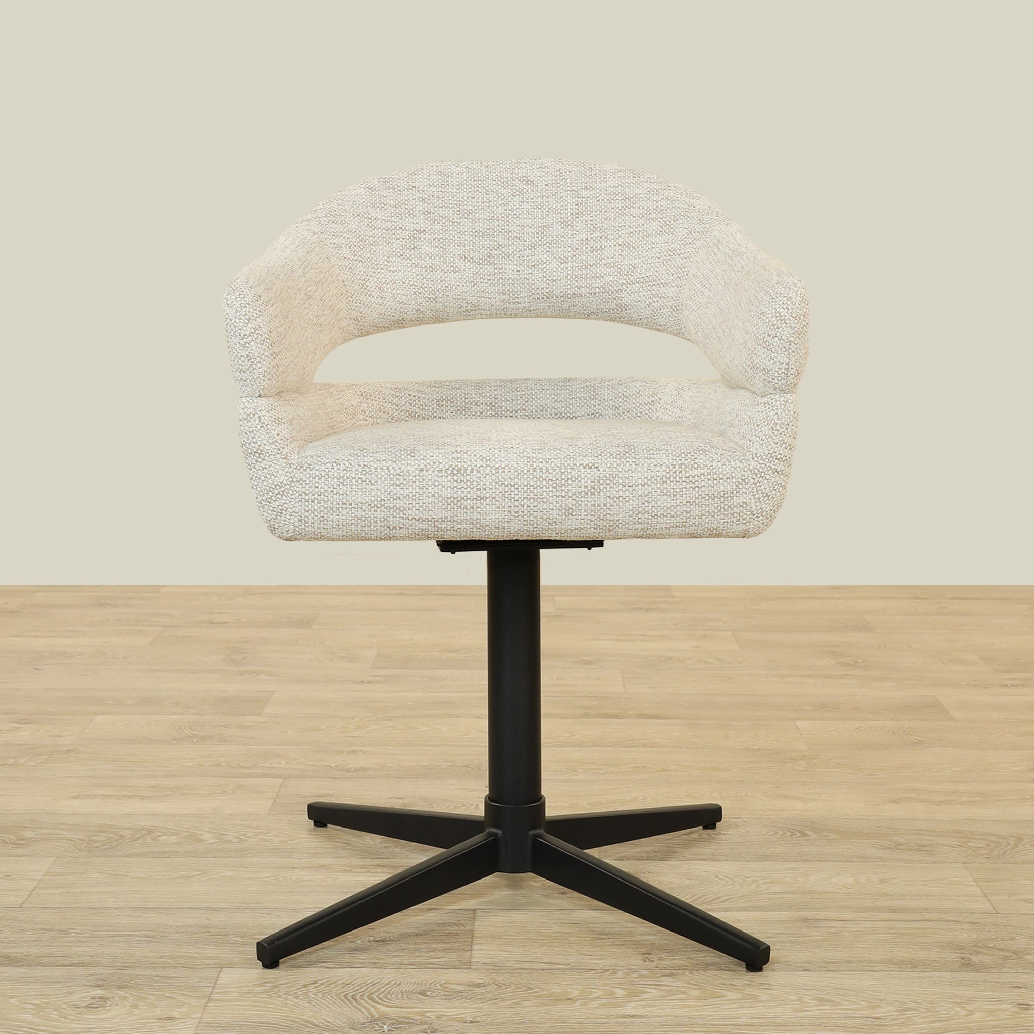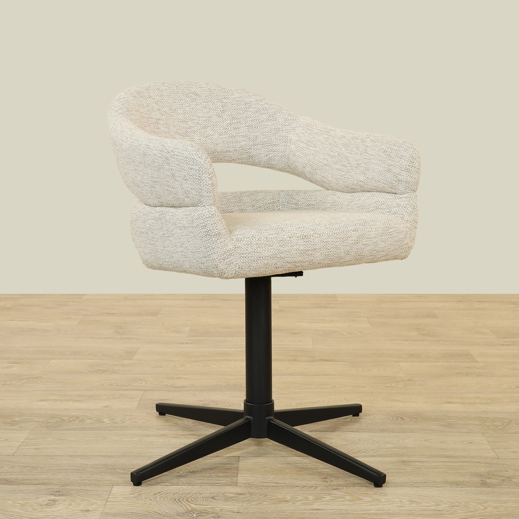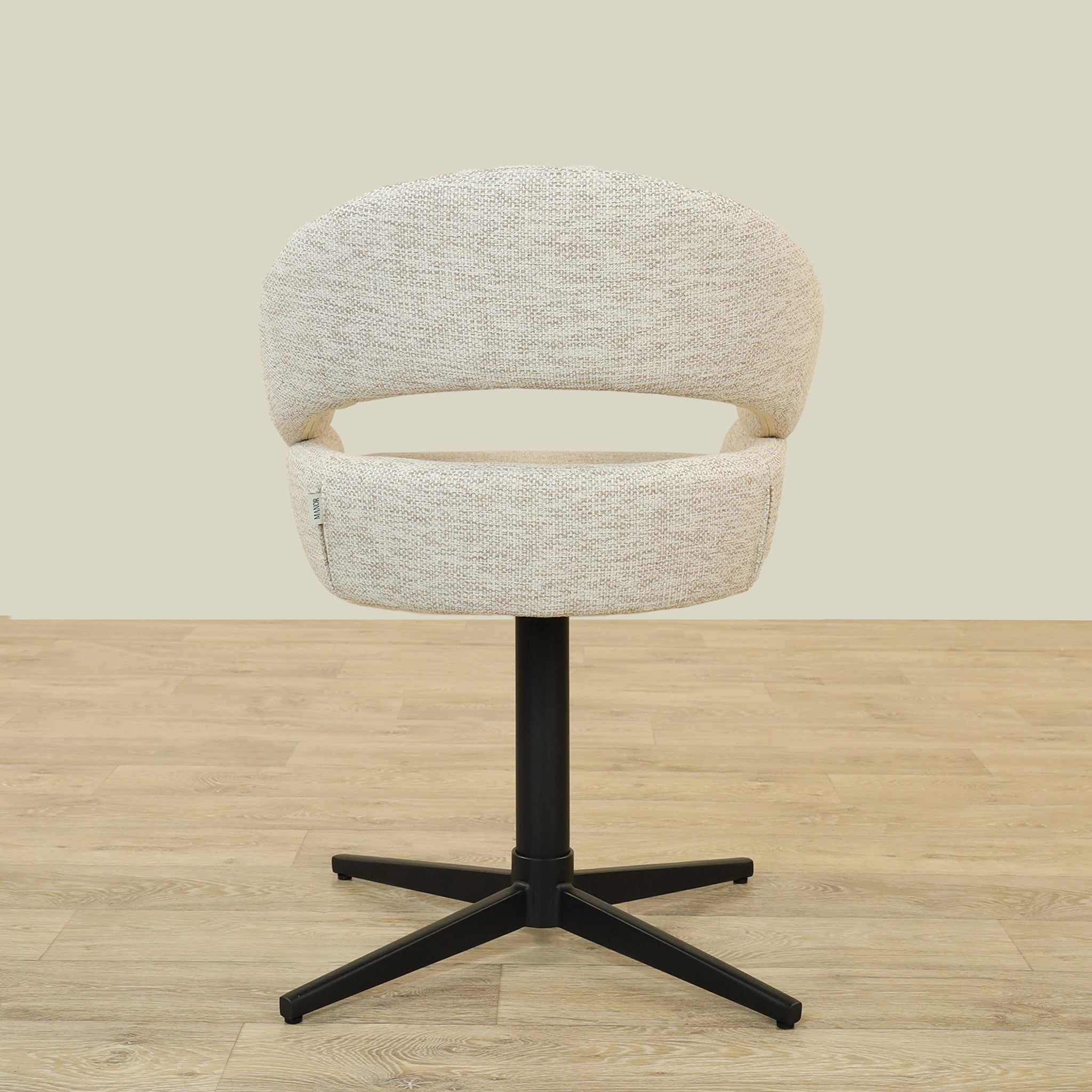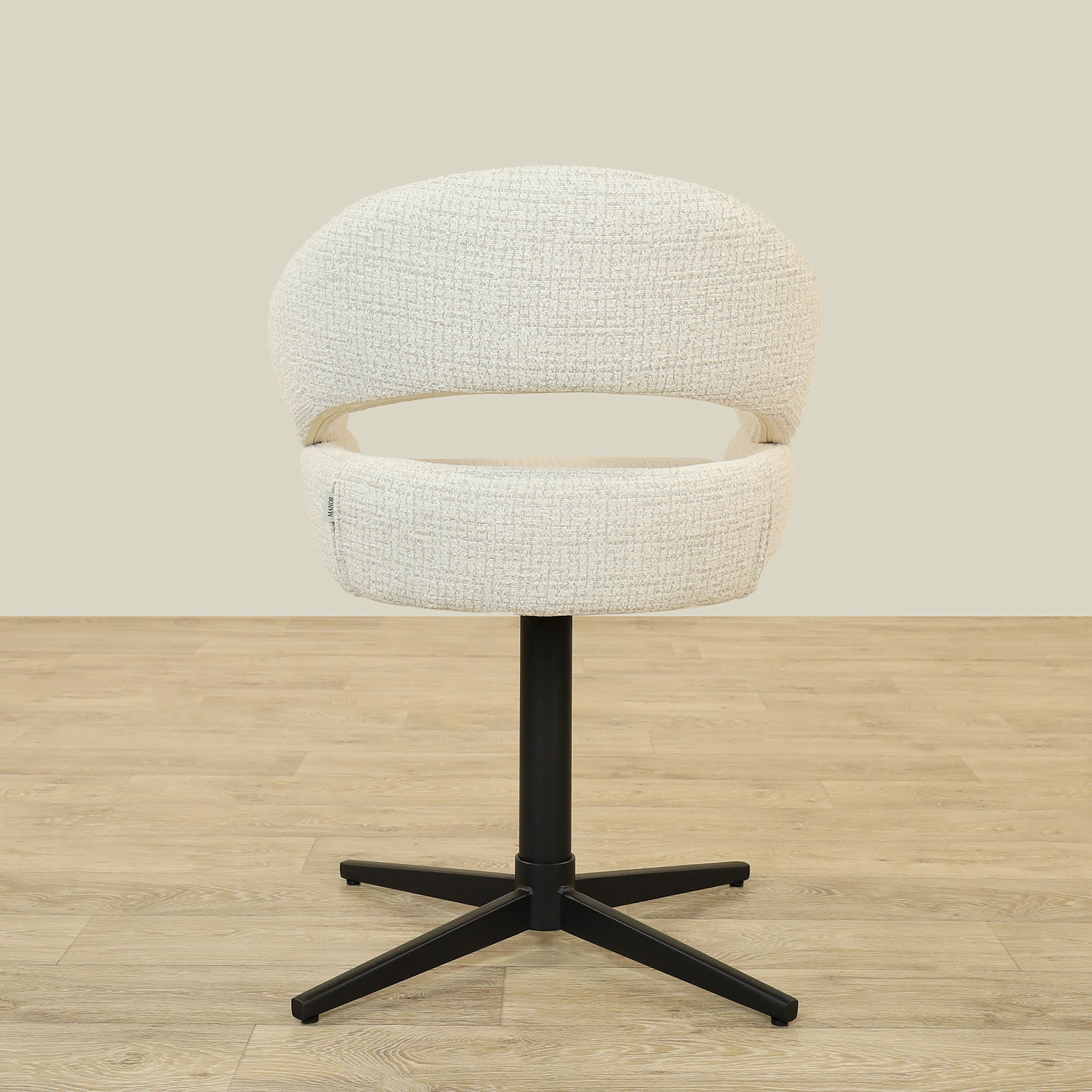 The Vega Dining Chair combines sleek plywood craftsmanship with soft fabric upholstery and a sturdy metal base, offering both elegance and durability.