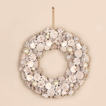 'Tis the season for displaying beautiful wreaths like this one on your front door. Featuring monochromatic pinecones, ornaments, and flowers, this snowy wreath will have you dreaming of a white Christmas.