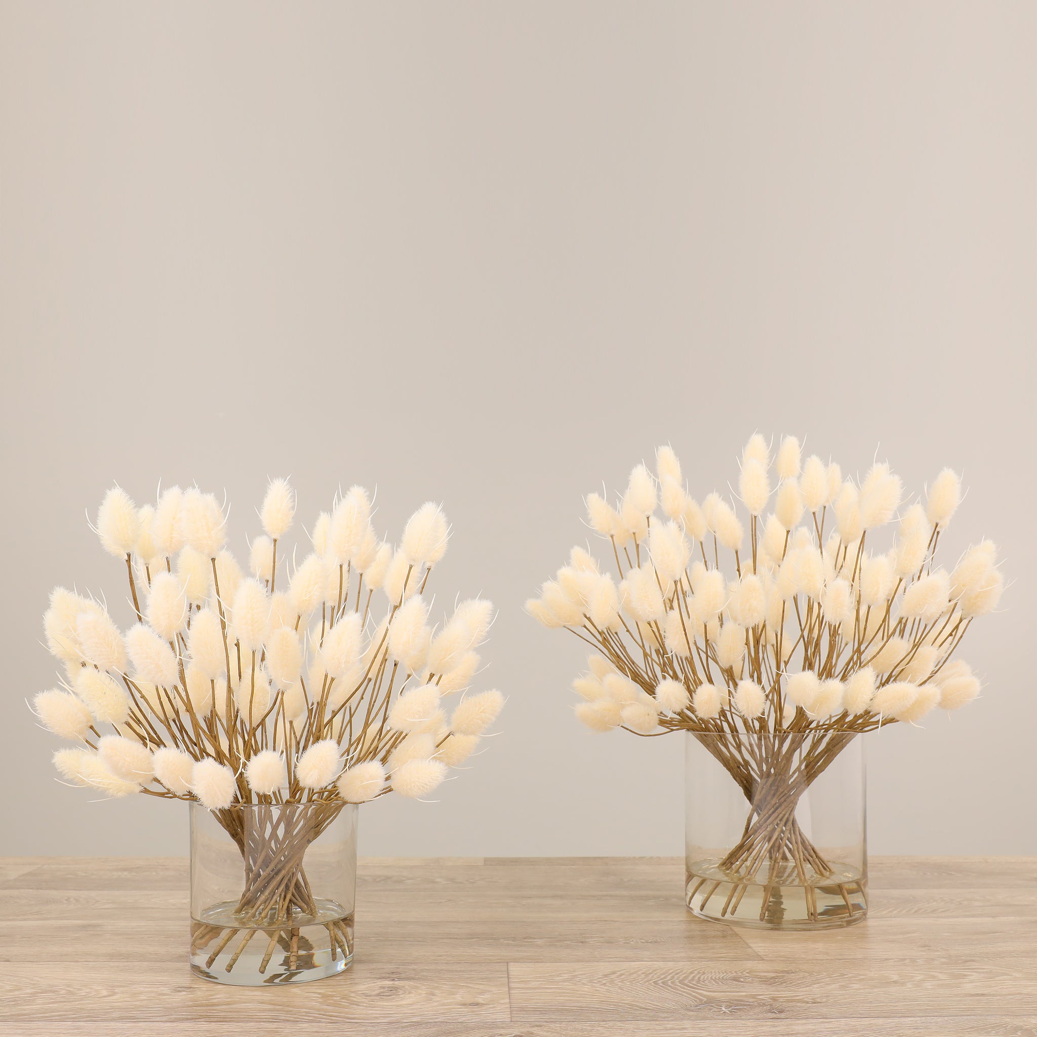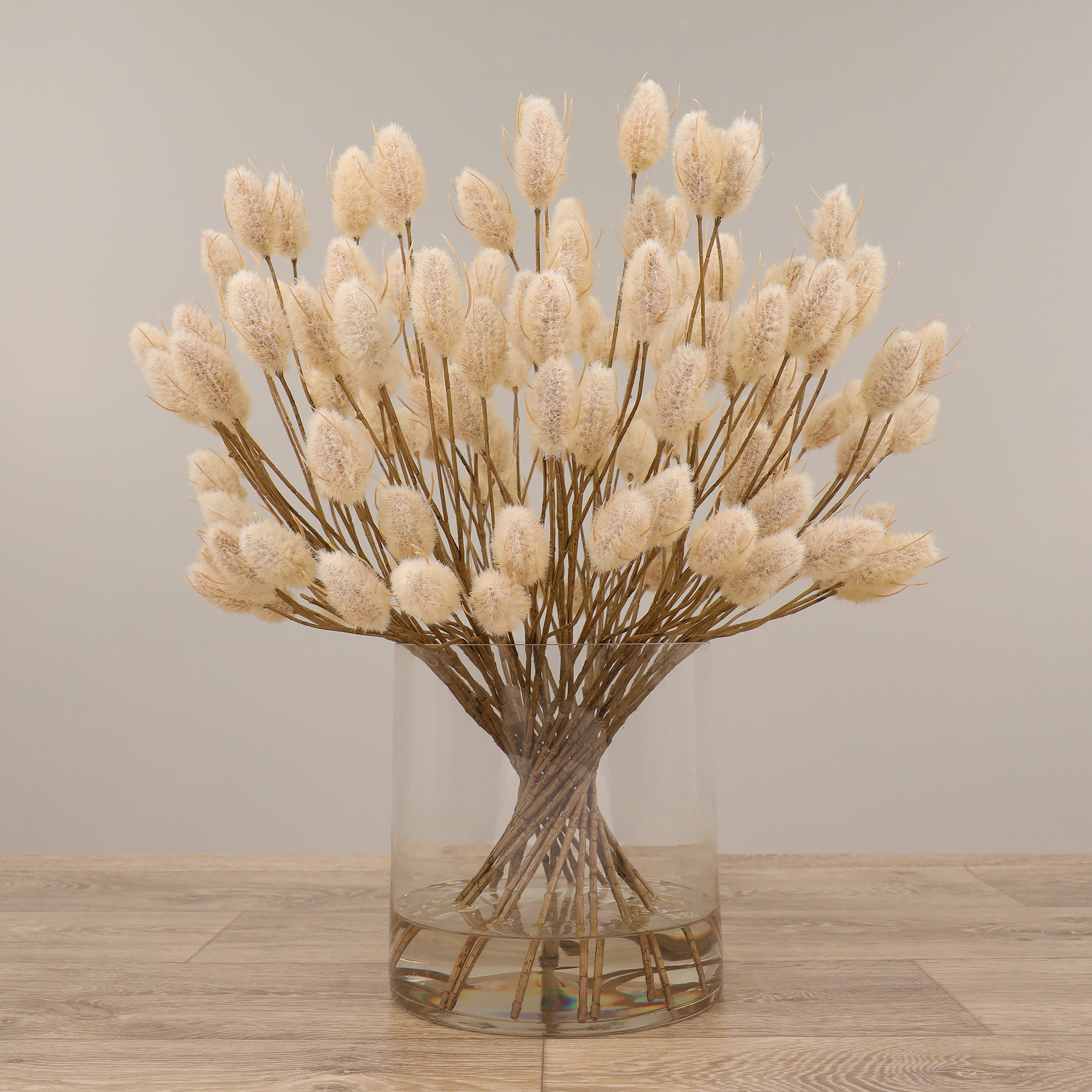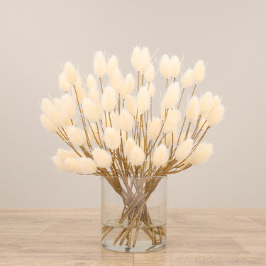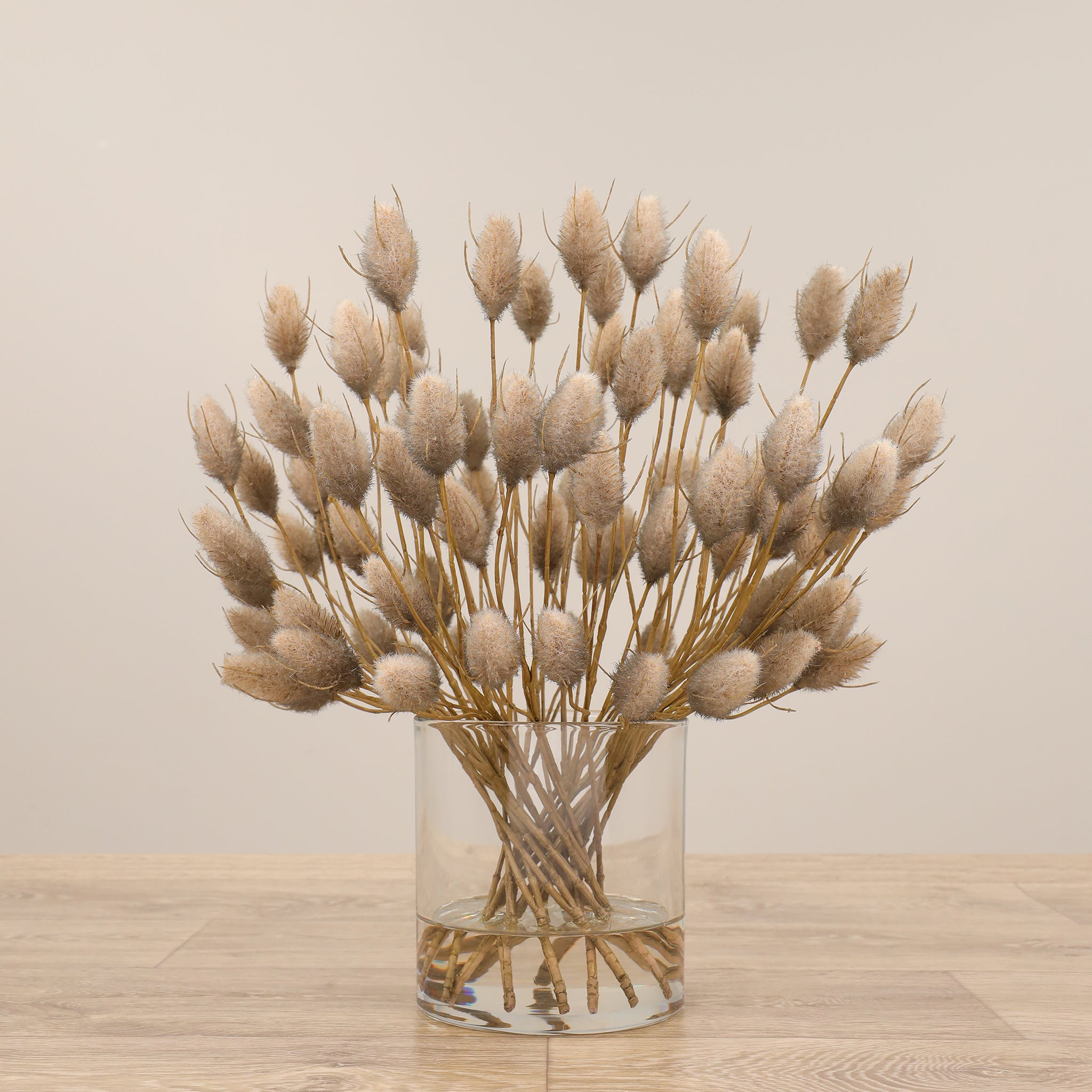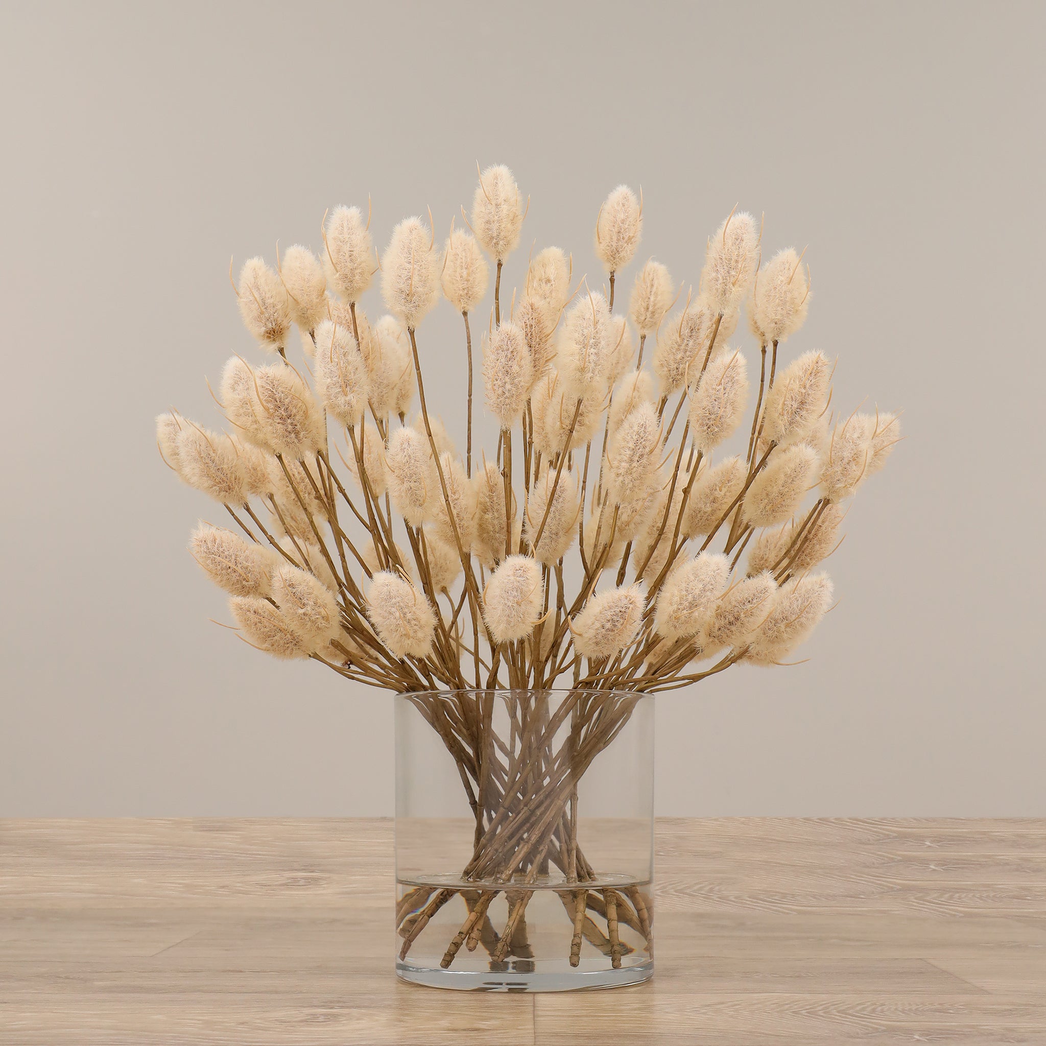 Композиция из искусственных заячьих хвостов в стеклянной вазе