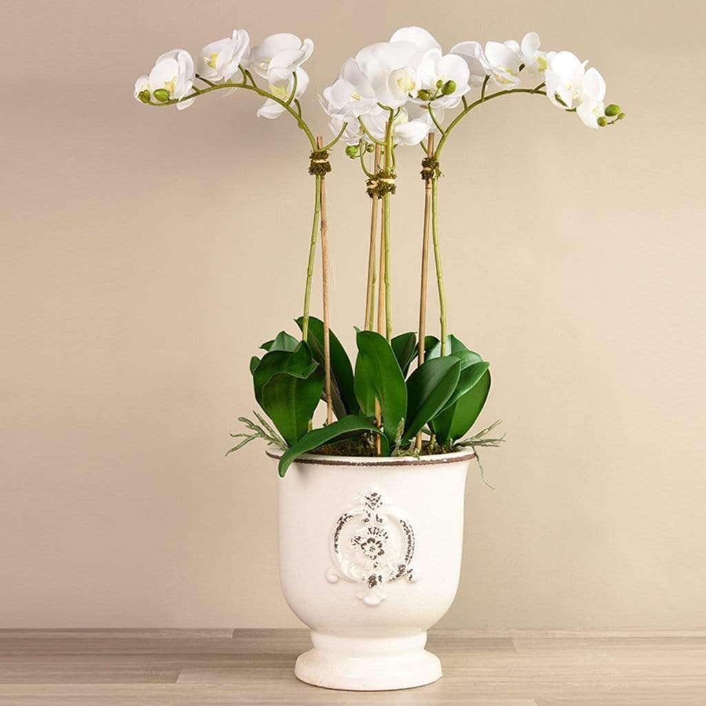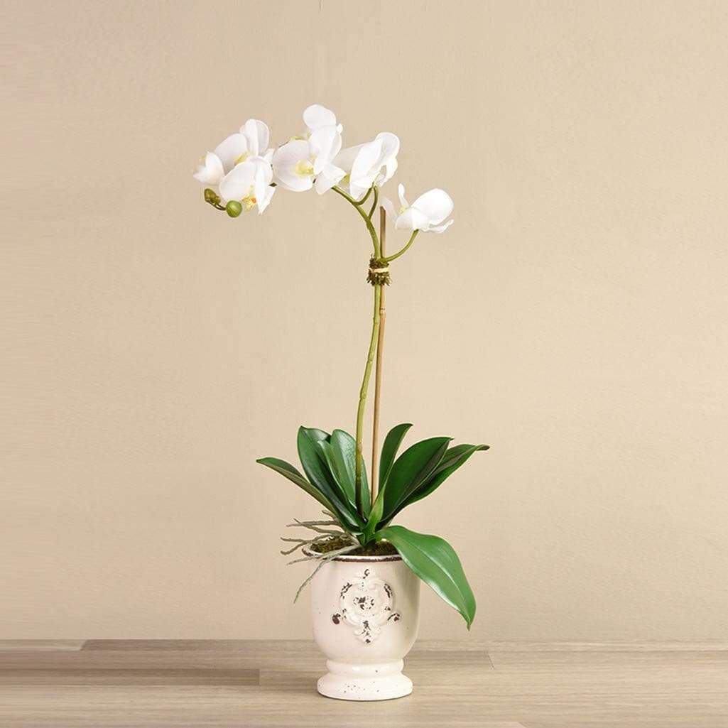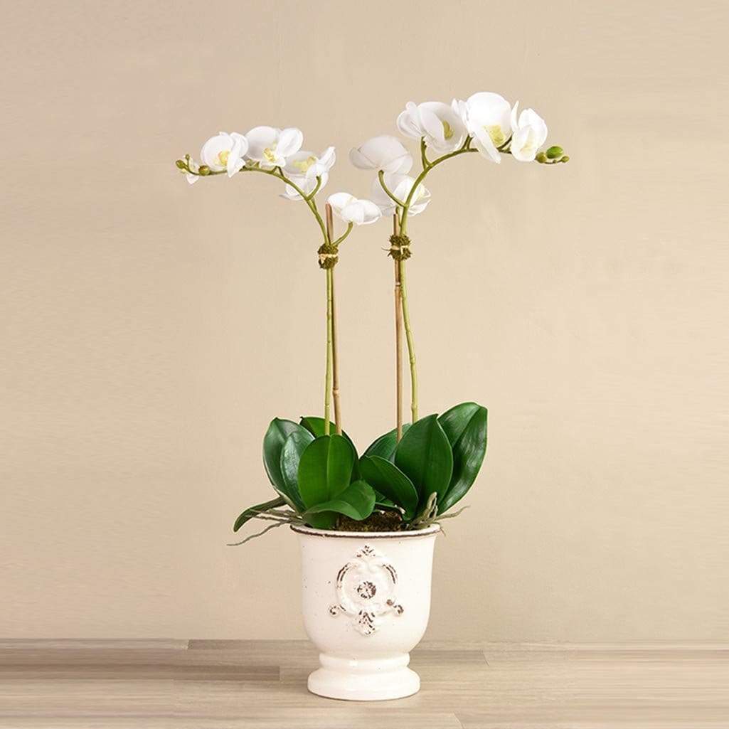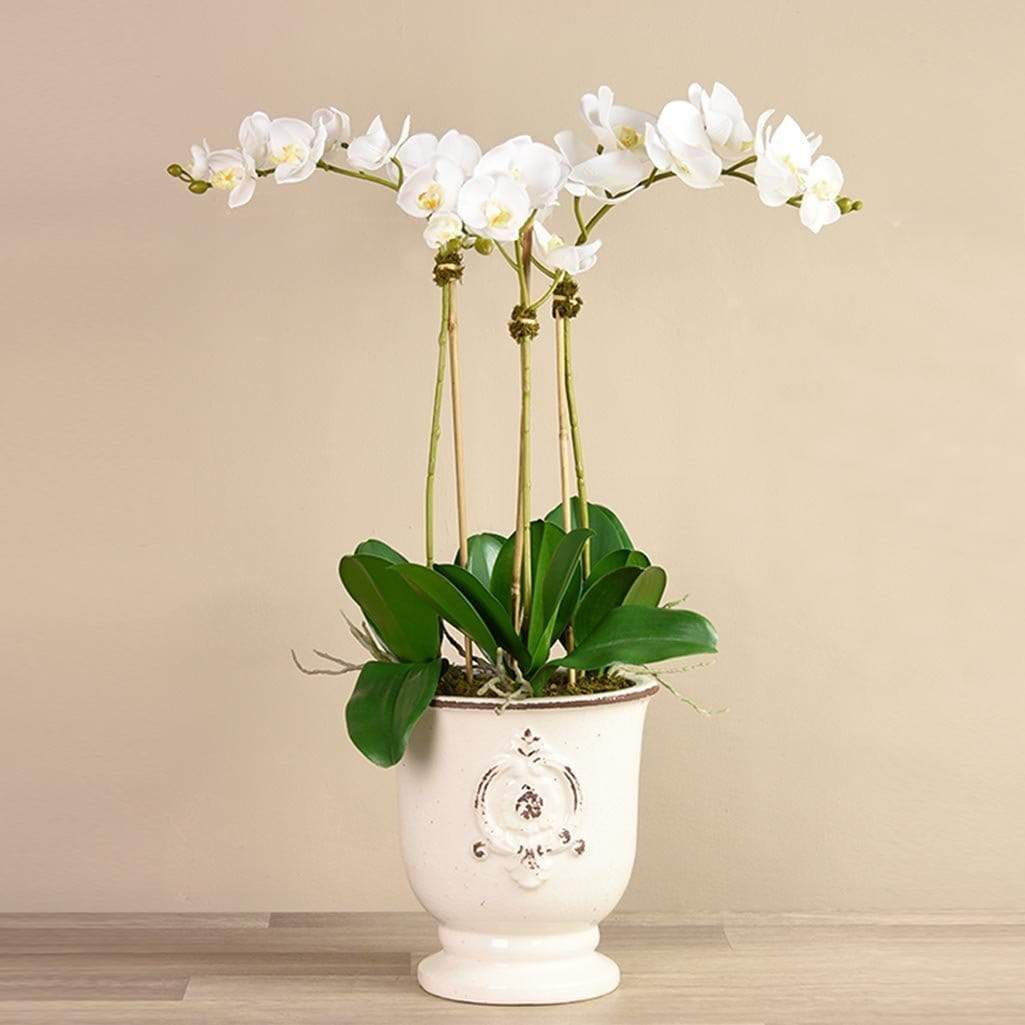 Величественные орхидеи встречаются с винтажным стилем в этой красивой композиции. Эти искусственные белые орхидеи выглядят и ощущаются на удивление реалистично благодаря их экспертному флористическому дизайну и инновационной технологии real-touch. Антикварный вид белого горшка делает его особенно уникальным.