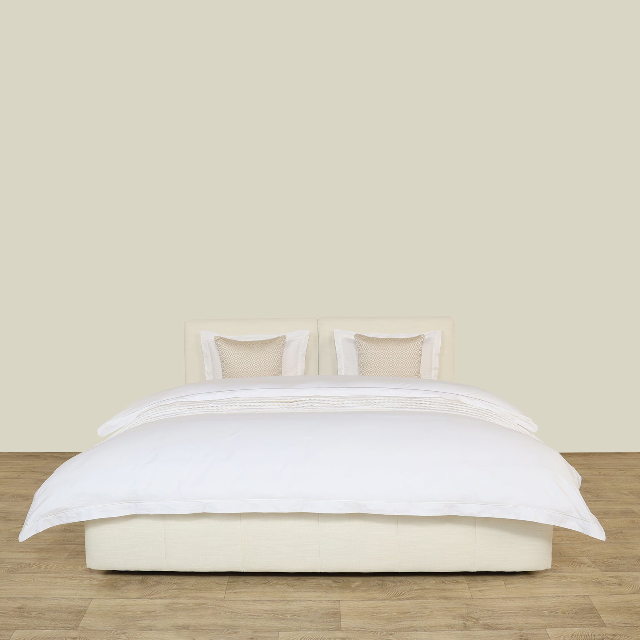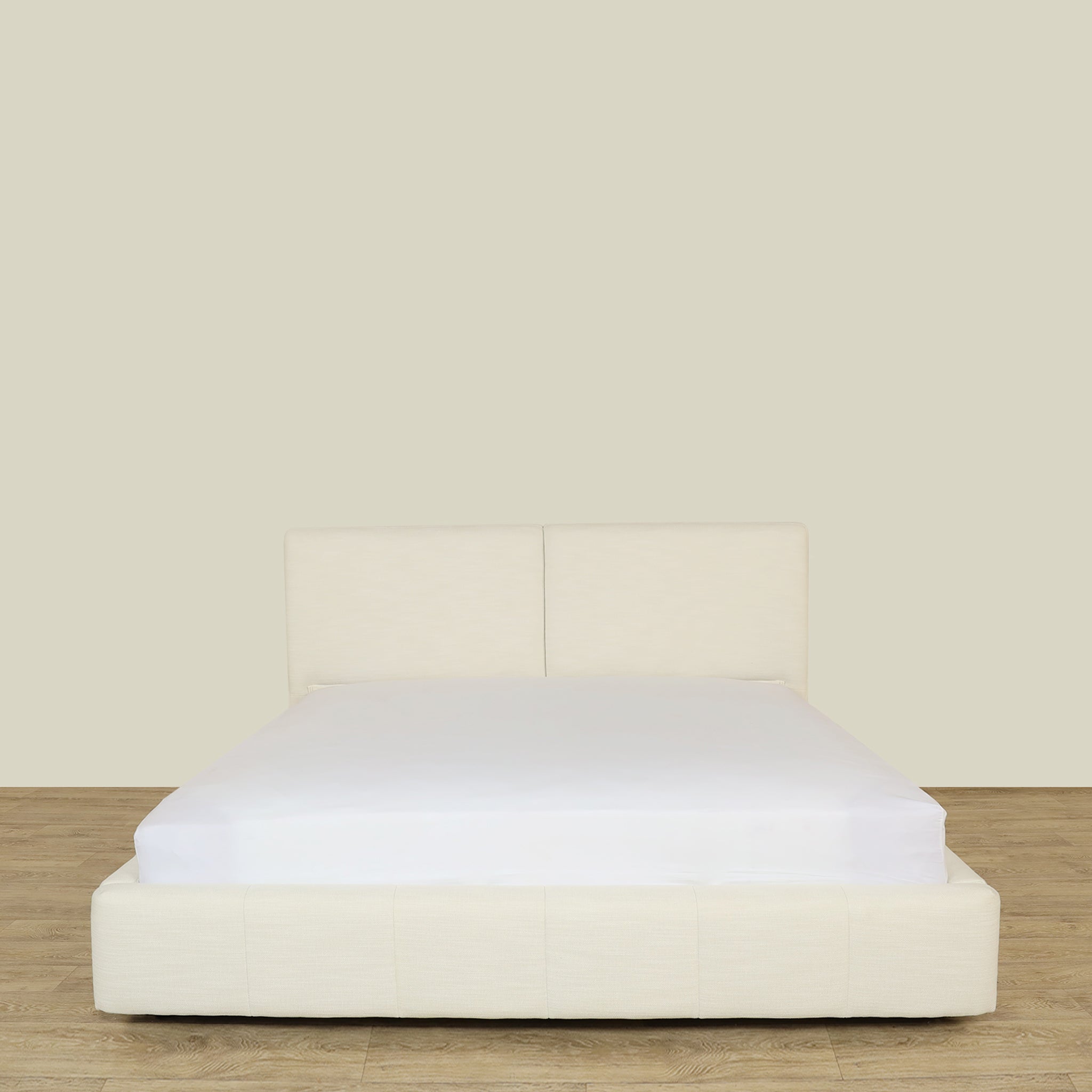 Кровать Mellow представляет собой изысканное сочетание прочного деревянного каркаса и мягкой тканевой обивки элегантного белого цвета.
