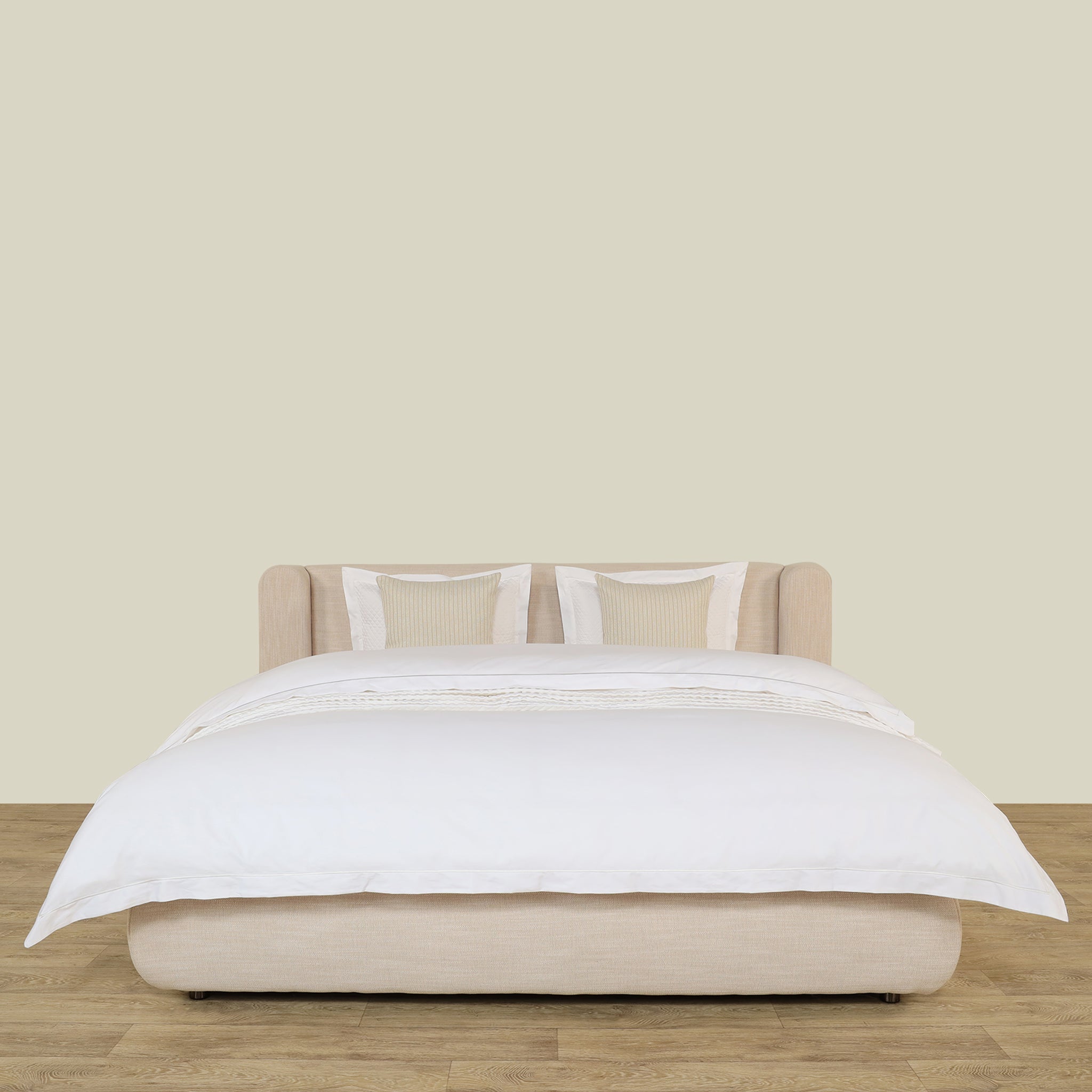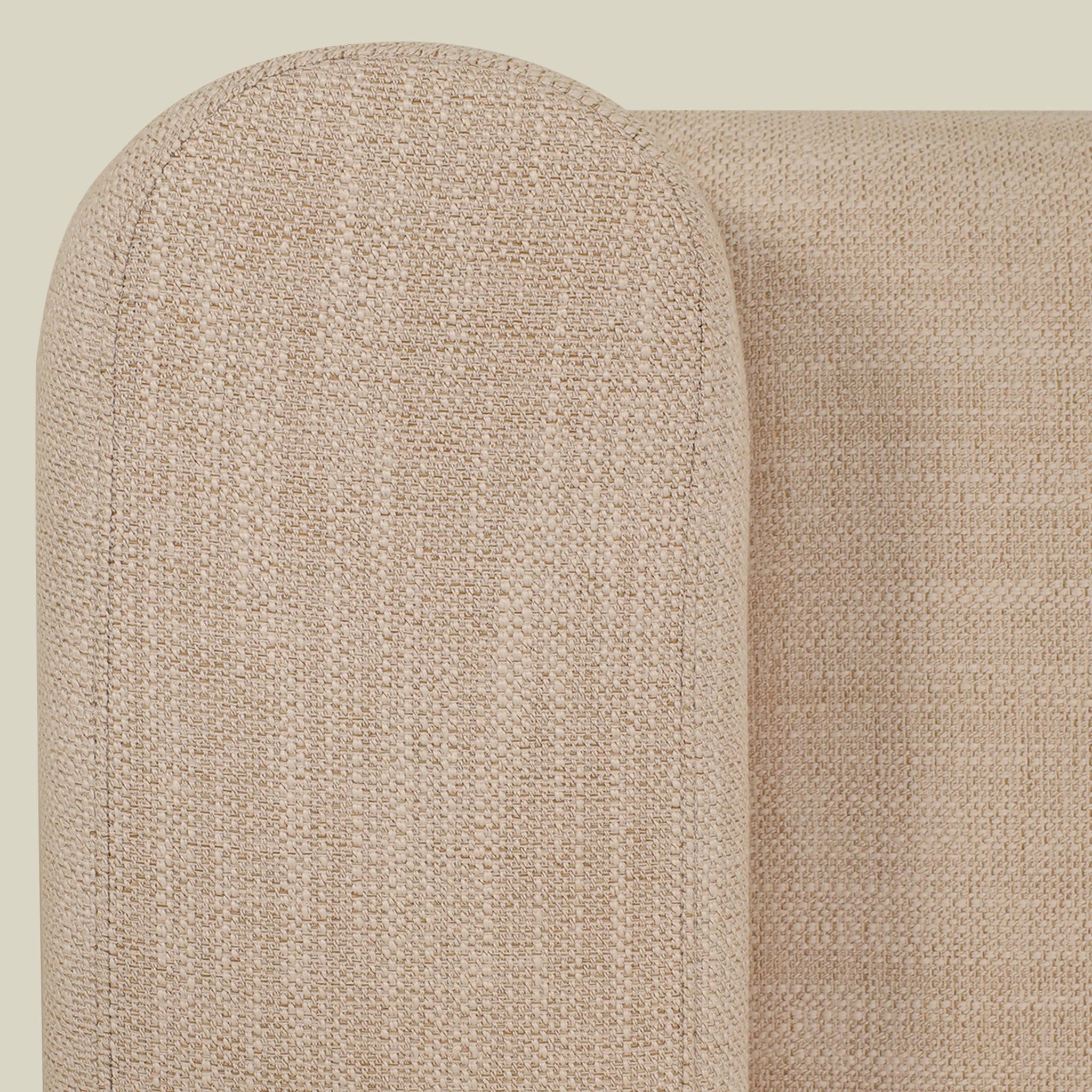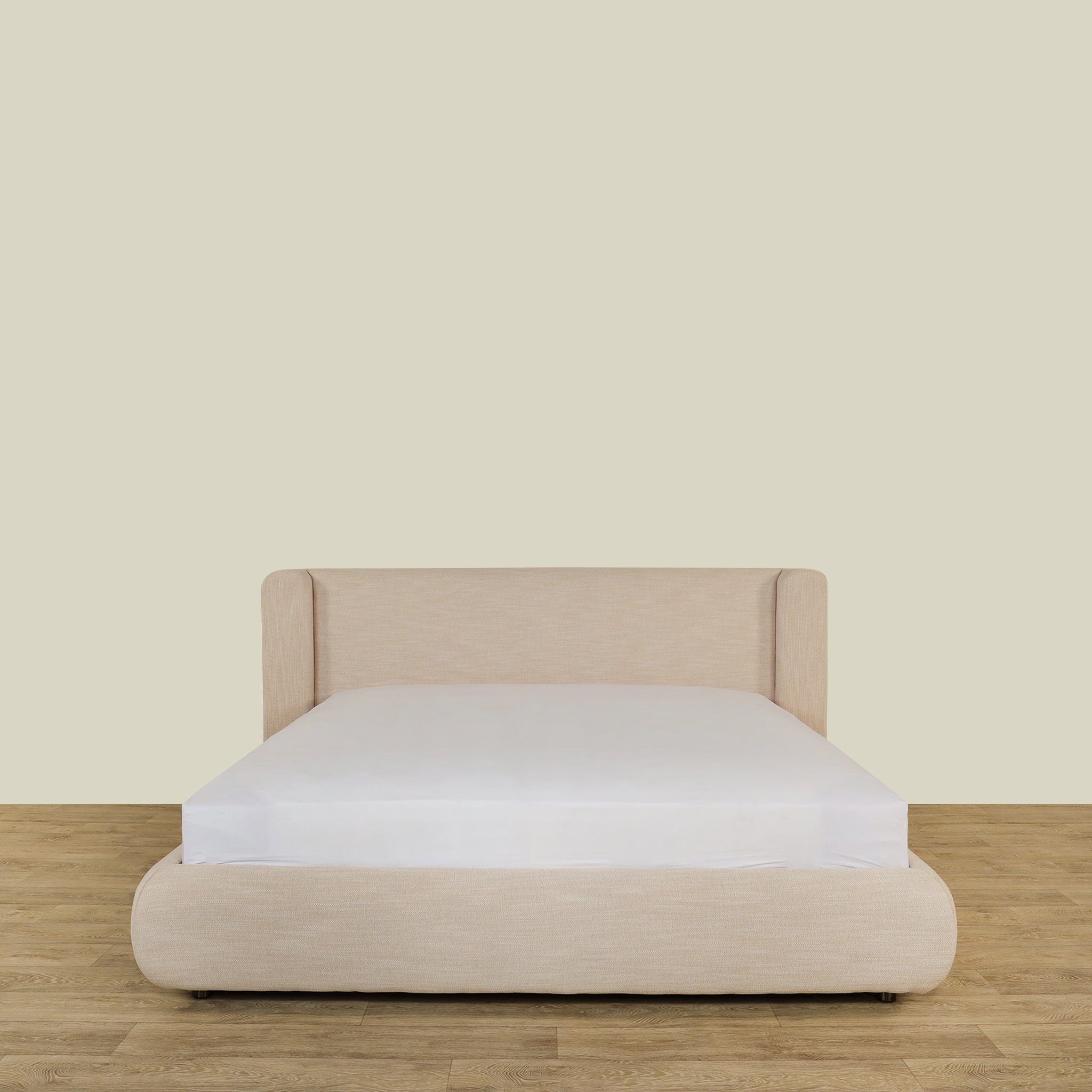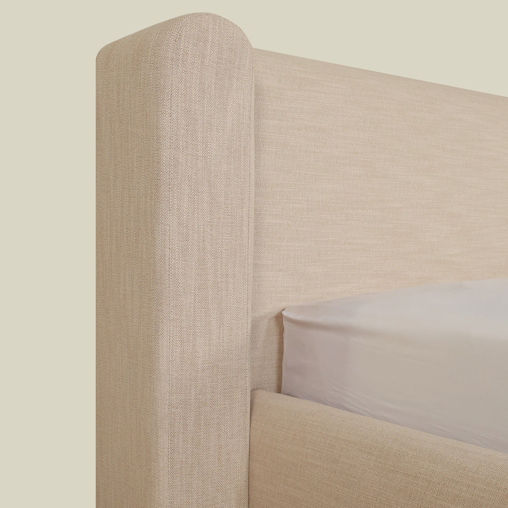 Сочетание прочного деревянного каркаса и мягкой бежевой ткани обеспечивает этой кровати как долговечность, так и сдержанную элегантность.