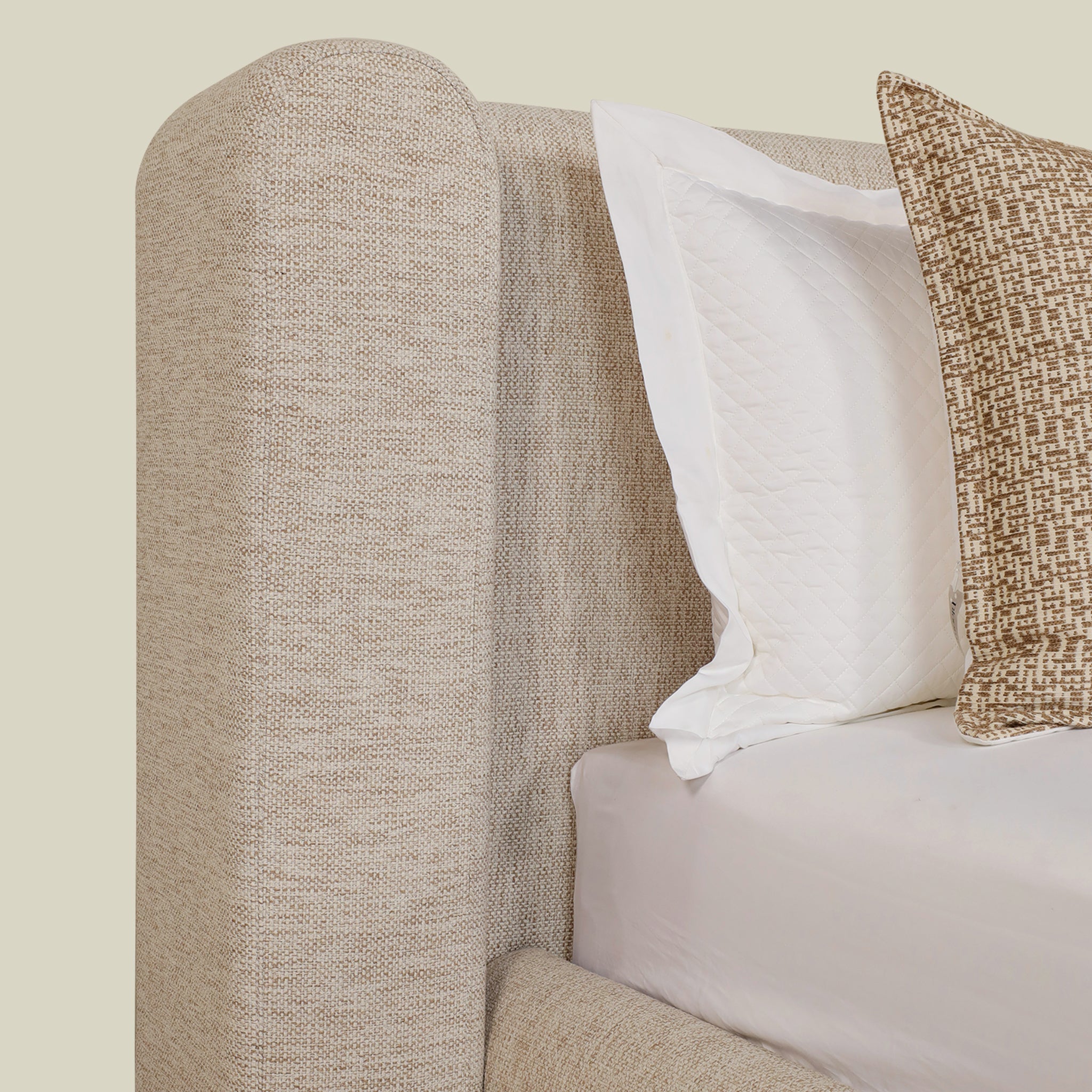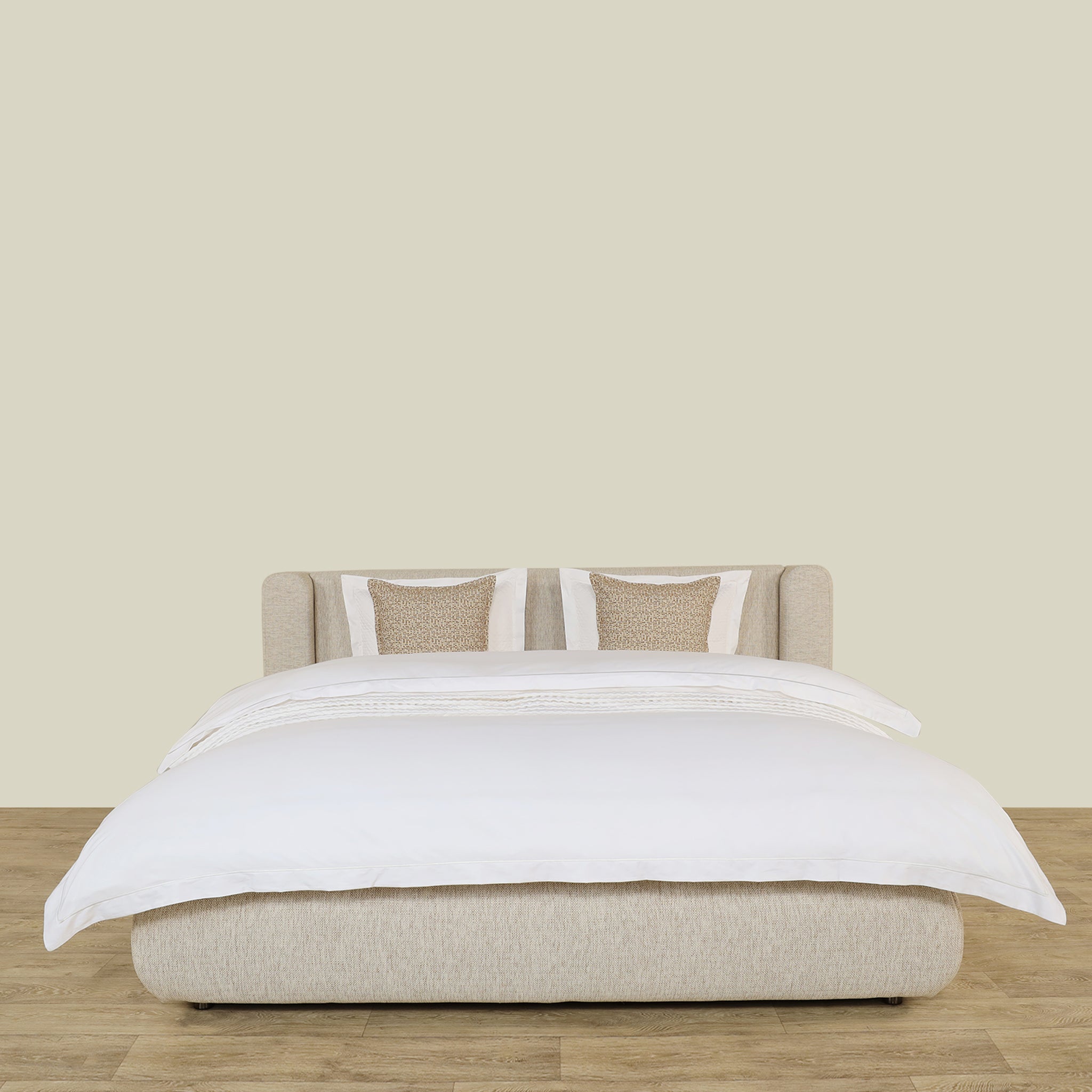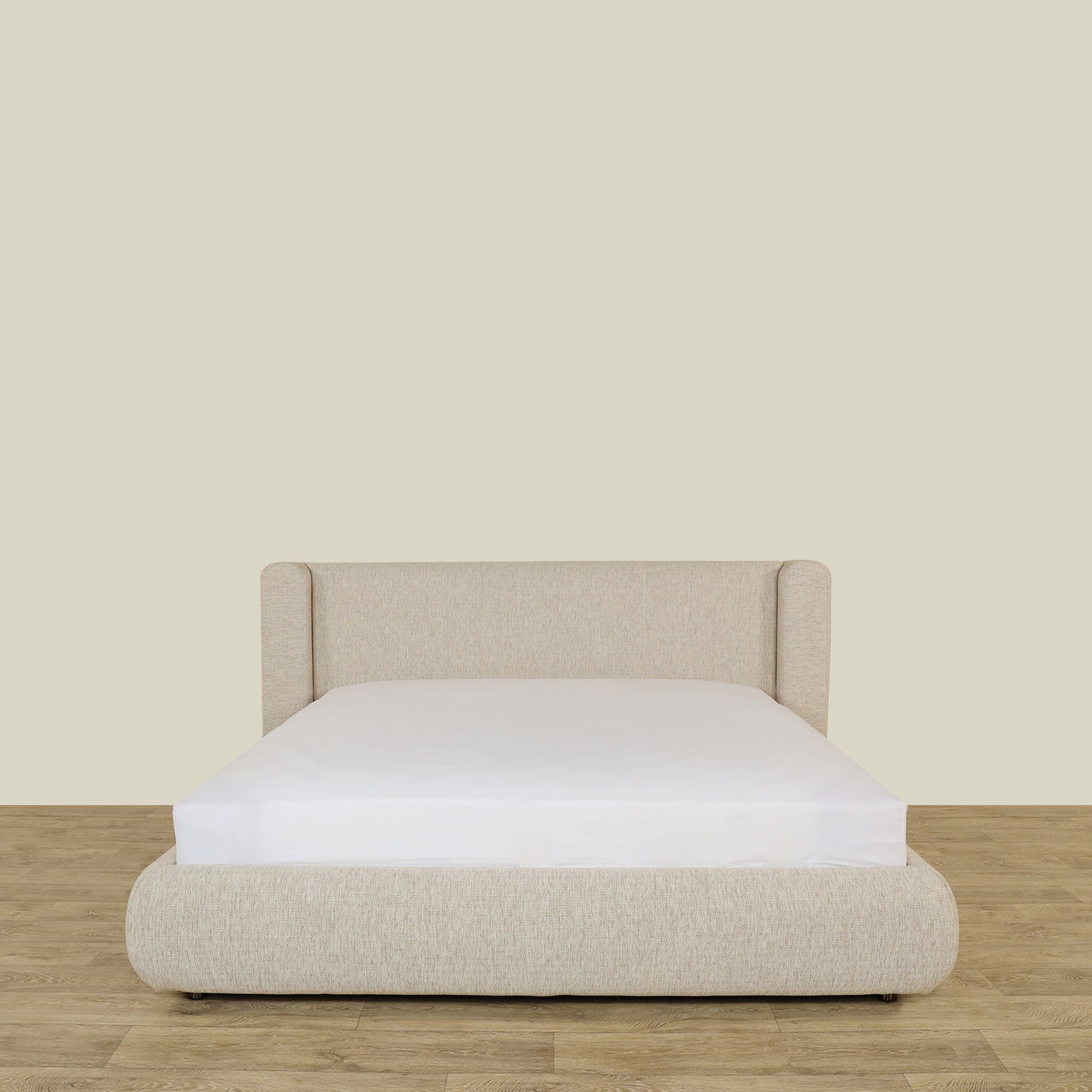 Кровать Bed Snug имеет прочный деревянный каркас в сочетании с мягкой белой тканью, сочетая в себе прочность и комфорт в элегантном дизайне.