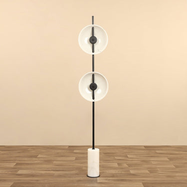 Добавьте драматизма и интереса, а также прекрасного освещения в пространство с помощью этой современной напольной лампы. Основание из цельного мрамора для устойчивости, отделка черная для контраста, а лампы установлены в блюдцеобразных абажурах для яркого света.