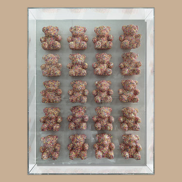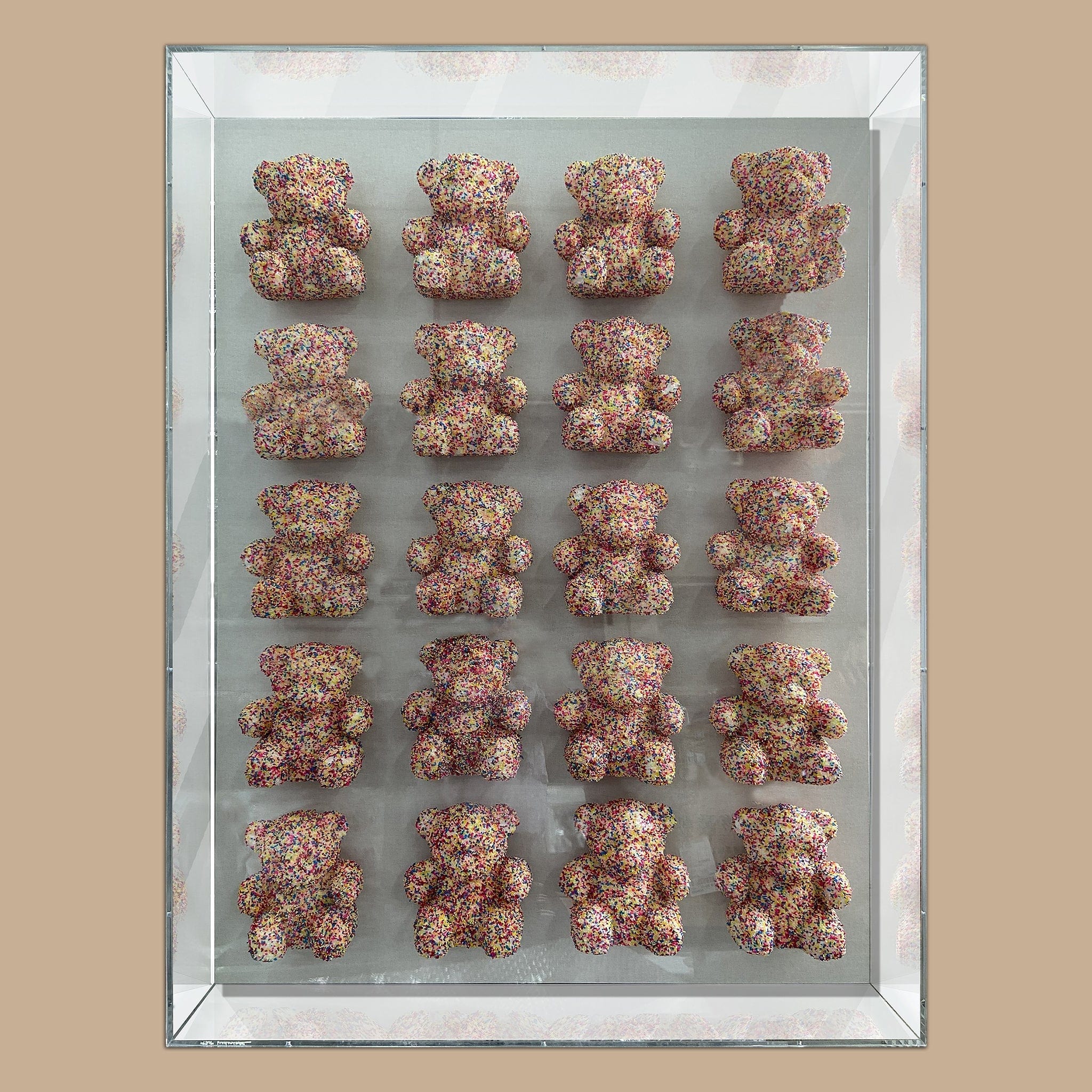 Откройте для себя захватывающее сочетание художественного самовыражения с помощью нашей современной работы в смешанной технике, элегантно оформленной в акриловую раму. Этот коллаж гармонично сочетает различные материалы, создавая динамичный визуальный образ, расширяющий традиционные границы. Сочетание фигурок плюшевых мишек и красочной посыпки создаёт единую, но при этом эффектную композицию, которая станет современным и вдохновляющим дополнением к любому пространству.