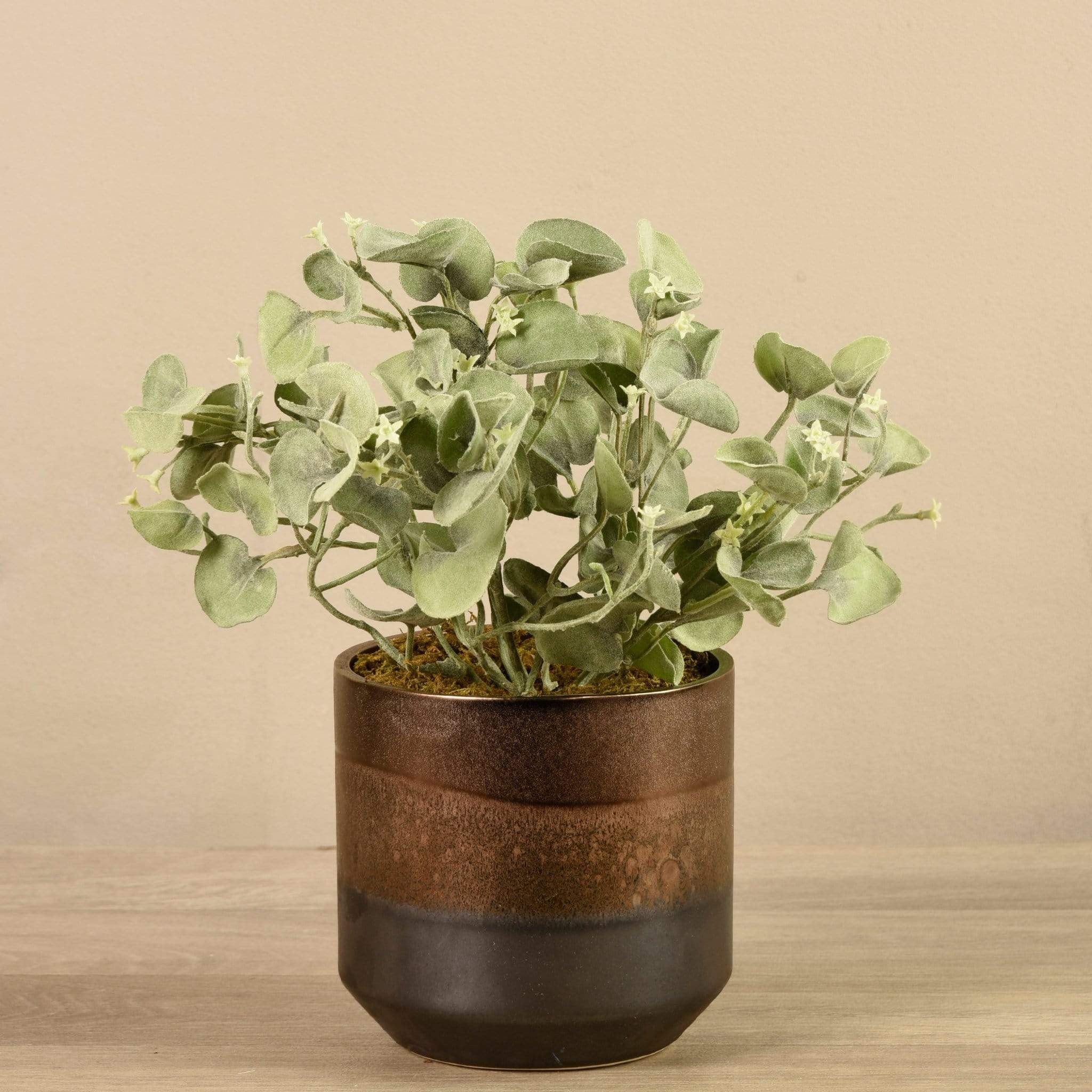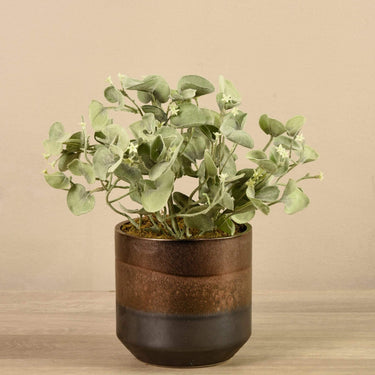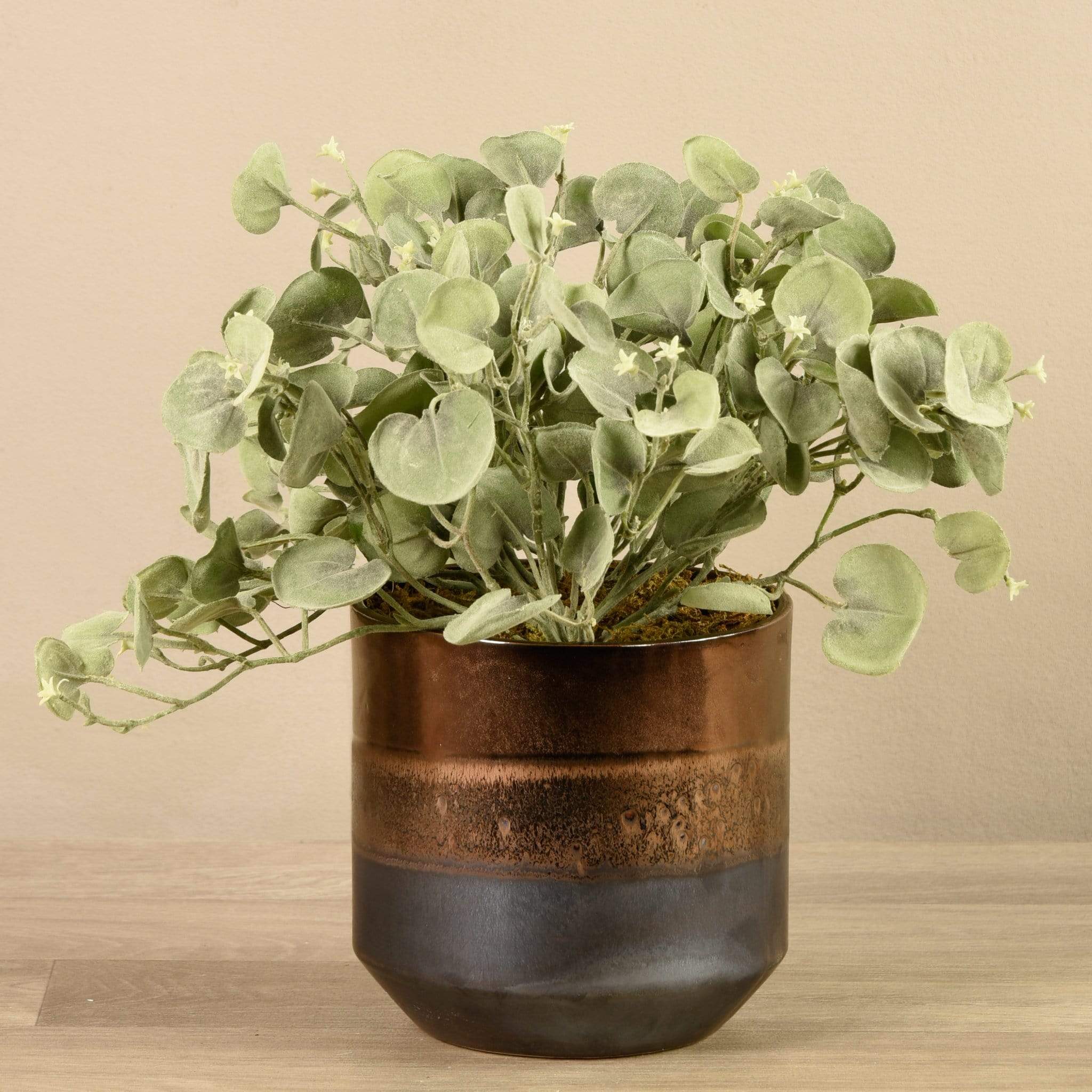 Это искусственное растение с серебристым водопадом станет прекрасным дополнением к любой книжной полке или журнальному столику. Его бледно-зелёные листья и изящные бутоны выглядят и ощущаются удивительно реалистичными. Они эффектно смотрятся на фоне двухцветного серо-медного горшка.