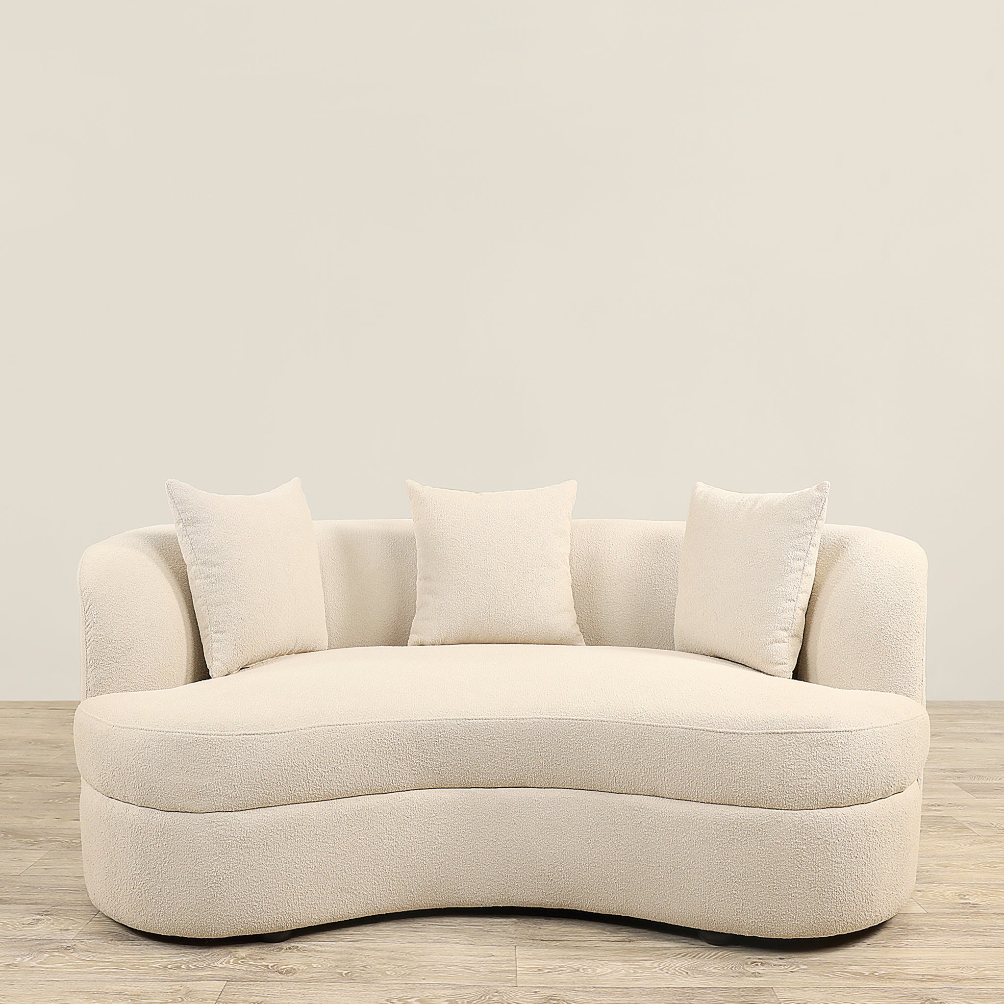 Диван Roso, обитый богатой тканью букле, отличается современным низким профилем и элегантными изгибами. Три свободные поясничные подушки обеспечивают мягкое прикосновение, а общий вид минималистский и изысканный.